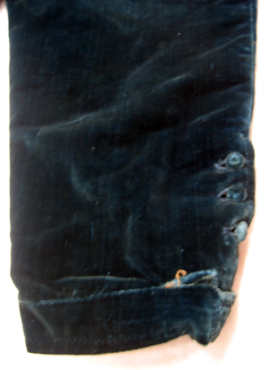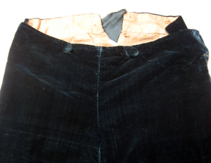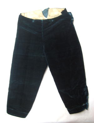 Knäbyxor av mörkblå sammet. Byxorna knäpps med en bred lucka som knäpps med sammetsklädda knappar i sidan, två på vardera sida. I midjelinningens överkant sitter fyra knappar, två knappar fram och två knappar bak. Byxsluten kantas av en bred linning som övergår i en knäppslå. Den ena änden är försedd med ett knapphål medan motstående ände saknar knapp. Nederst i yttersömmen förekommer ett sprund, l. 160 mm, kantat av en knäppning bestående av tre knappar av samma sort som föregående. Byxorna är på insidan fodrade med grov naturfärgad linnelärft och med blå linnelärft vid benslutens sprund.