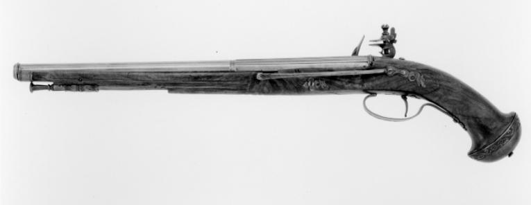 Sextonsidig, slätborrad pipa med åttsidig kammare och svarvad trumf, kanterna på kammarens ovansida i form av tre lister, sidorna svagt välvda. På kammarens ovansida stämplat: "LAZARI COMINAZ", mellan orden samt på båda sidor om signaturen stämplar i form av treblad. Vid övergången på pipans ovansida en ring. Ny svansskruv med platta av pipans diameter, på ovansidan en profilerad list. Rektangulärt, svagt böjt svansskruvblad. Fänghålet igensatt och ett nytt fänghål uppborrat i pluggen. Fästning: Två häften. Pipan fäst med skruv (ny) uppifrån samt ett pipstift av stål. Flintlås av flamhärdat(?) stål, plant låsbleck med fasade kanter, rundad bakände, urspr. med ändblad. Graverad rank- och drakdekor i relief mot mörk bakgrund. S-formig, platt hane med samma dekor, nötskruvhuvud i form av en niobladig blomma, hanhals med ring. Svagt triangulära käkar, överkäken lös, rak hangren, käkskruv med päronformigt huvud. Fängpanna med åsad undersida. Batteri med välvt fängpannelock och högt, smalt eldstål med graverade blad på ryggen, batterifot med volutformig häl. Batterifjäder med fasade kanter och streckdekor, litet, åsat, flikigt fjäderlöv. Nöt utan studel. Fästning: Två låsskruvar. Svagt böjd avtryckare med liten ändkula. Helstock av valnötsrot med snidat tvärband på framstocken och längsgående skålningar. Beslag av flamhärdat(?) stål, oval kolvkappa med mittknapp, omgiven av graverad blomma, kantbård med bladrankor i relief mot streckad bakgrund. Två låsskruvbrickor med dekor i form av drakhuvuden och blad, i den bakre intappat samt fäst med låsskruven en bältehake av stål, l: 150 mm. En rörka med bladdekor, slätt näsband med kantlister. Avtryckarbleck saknas. Varbygel med spetsovalt fält med rankdekor på bygeln, slät, smal bakre arm med ändblad.