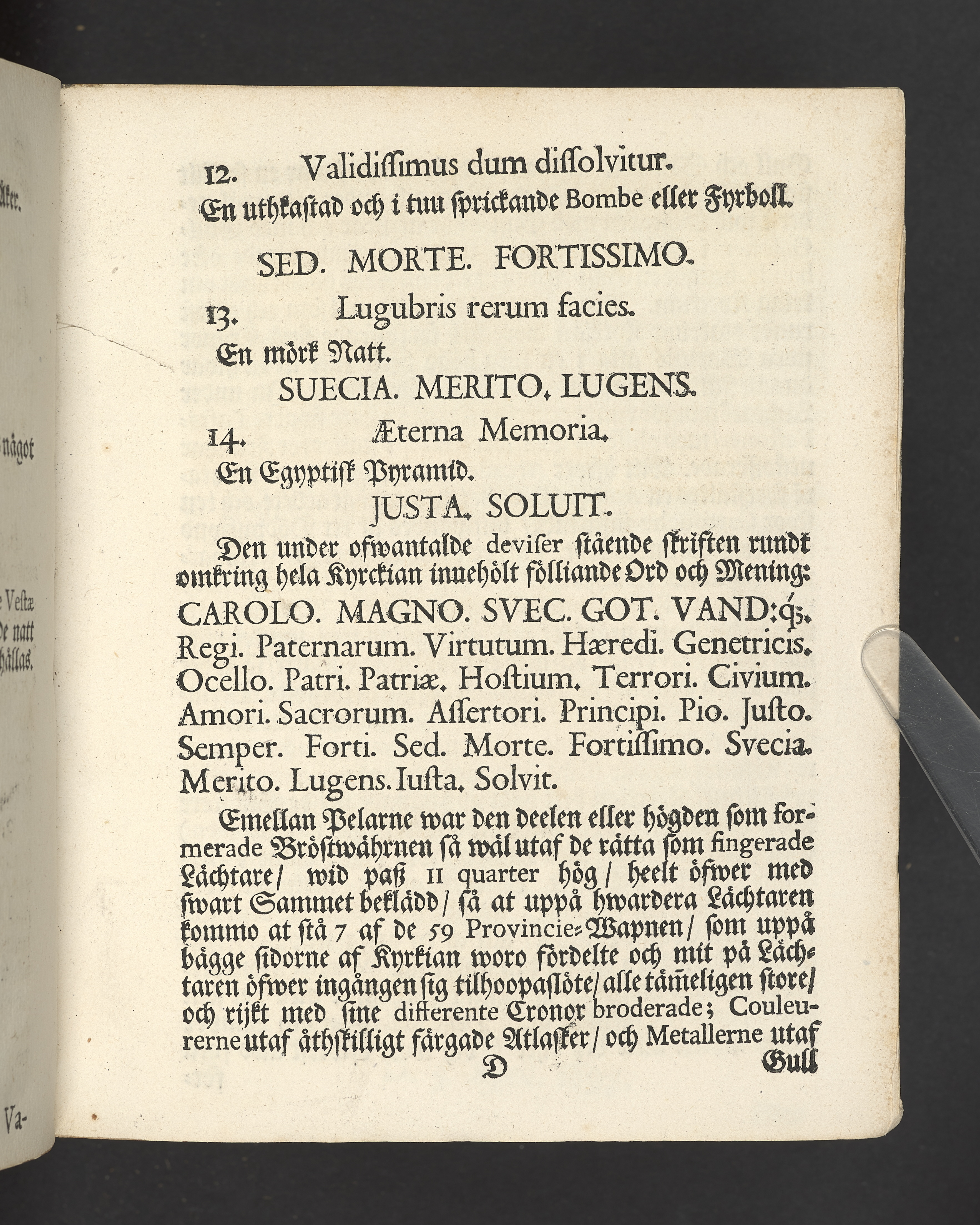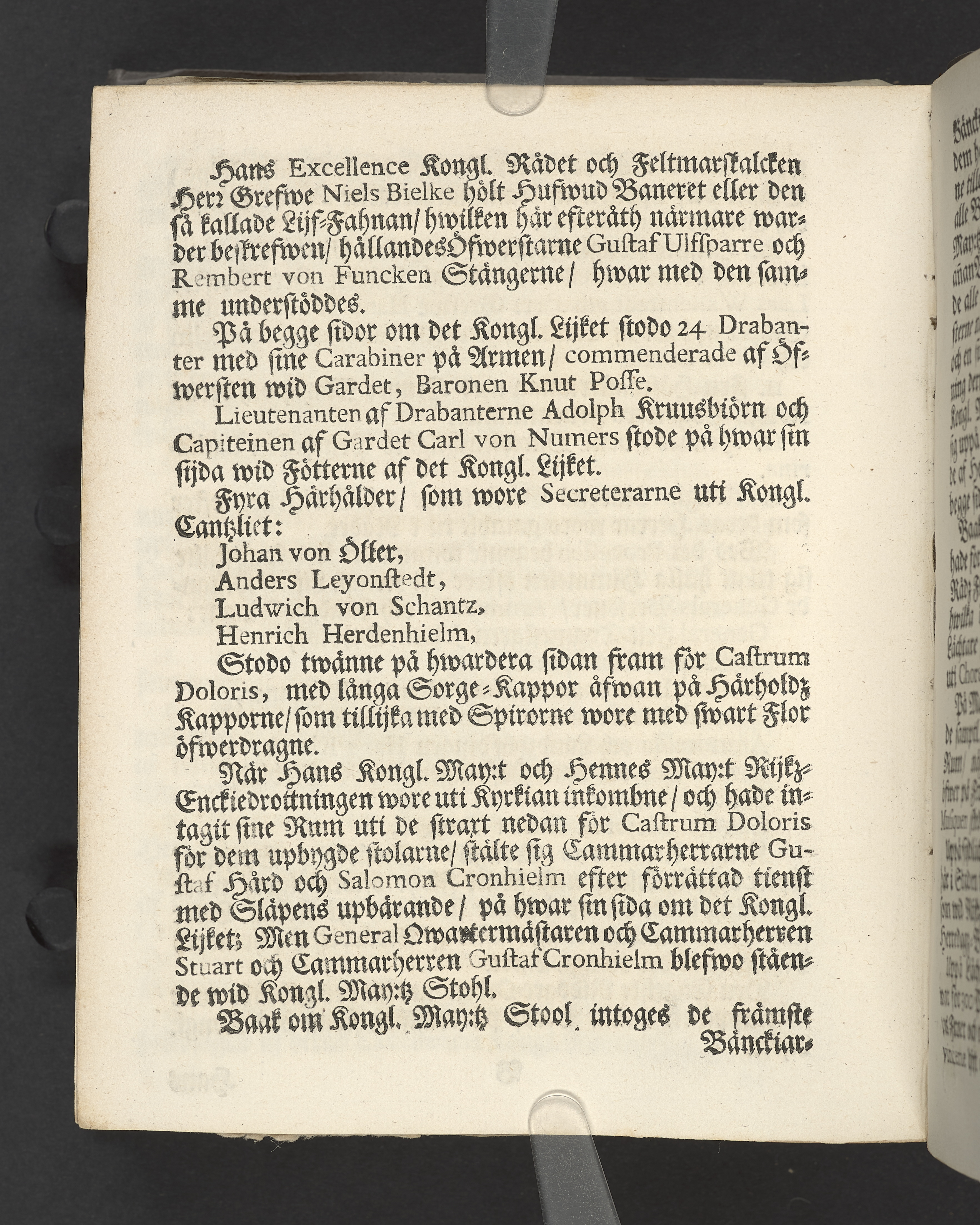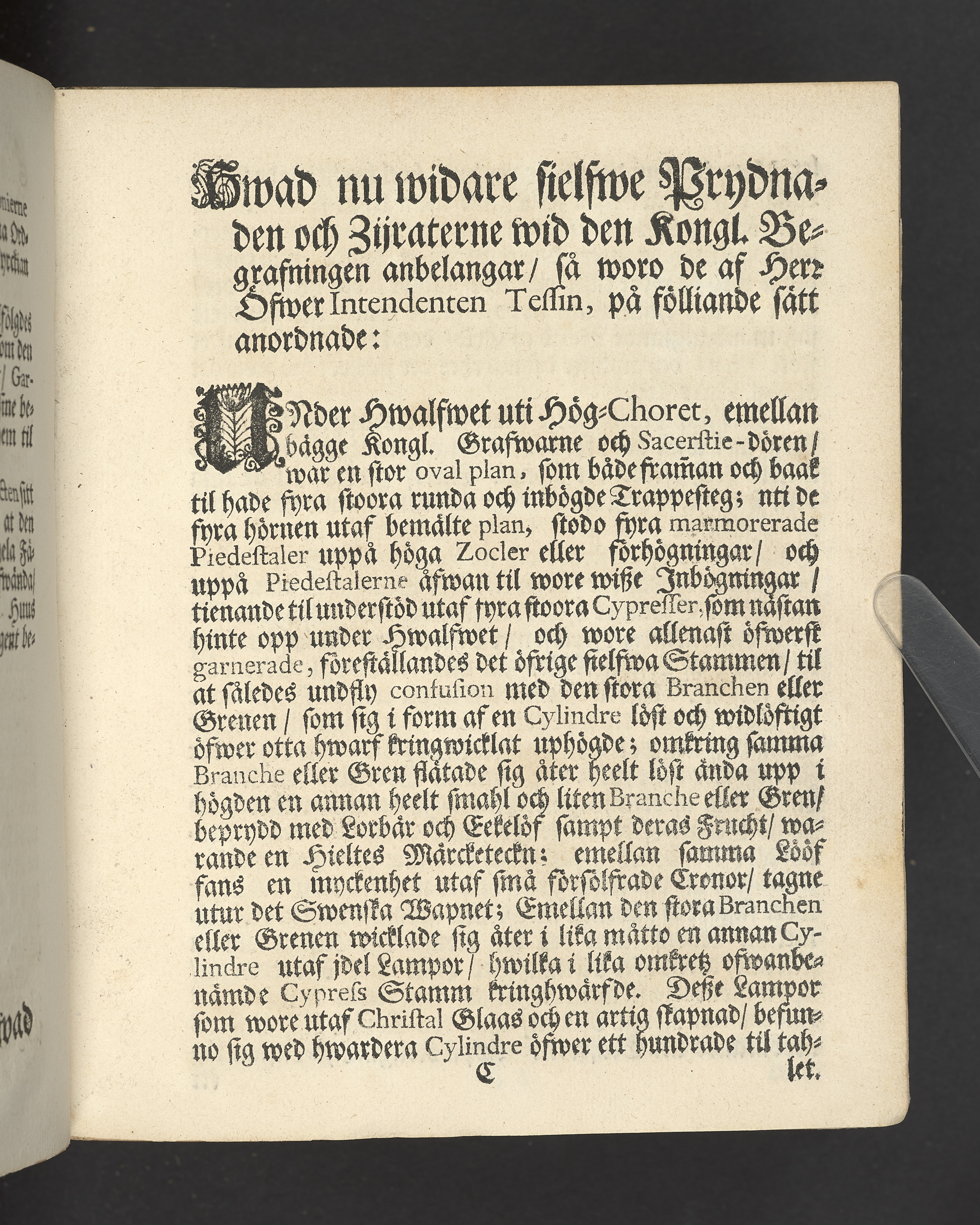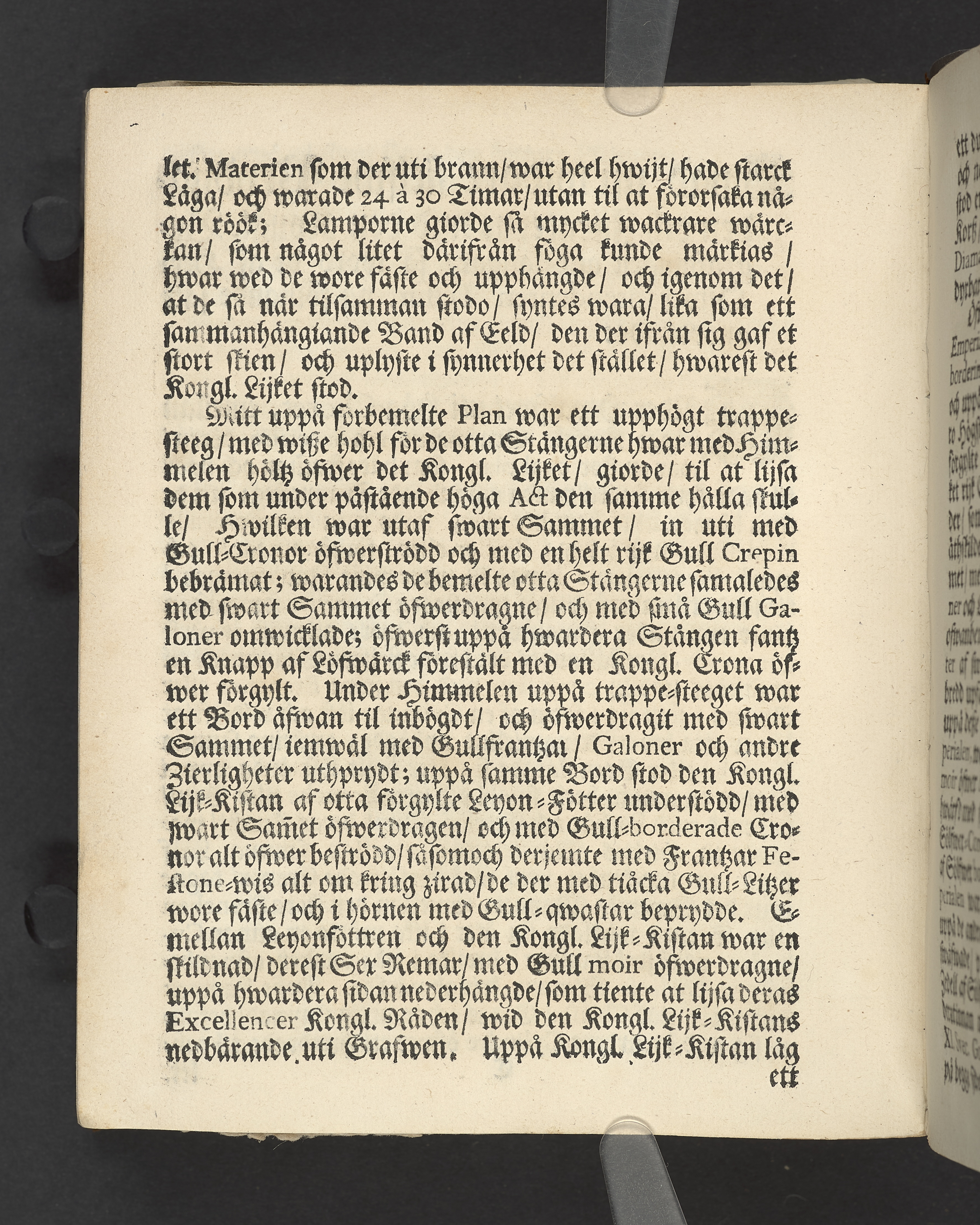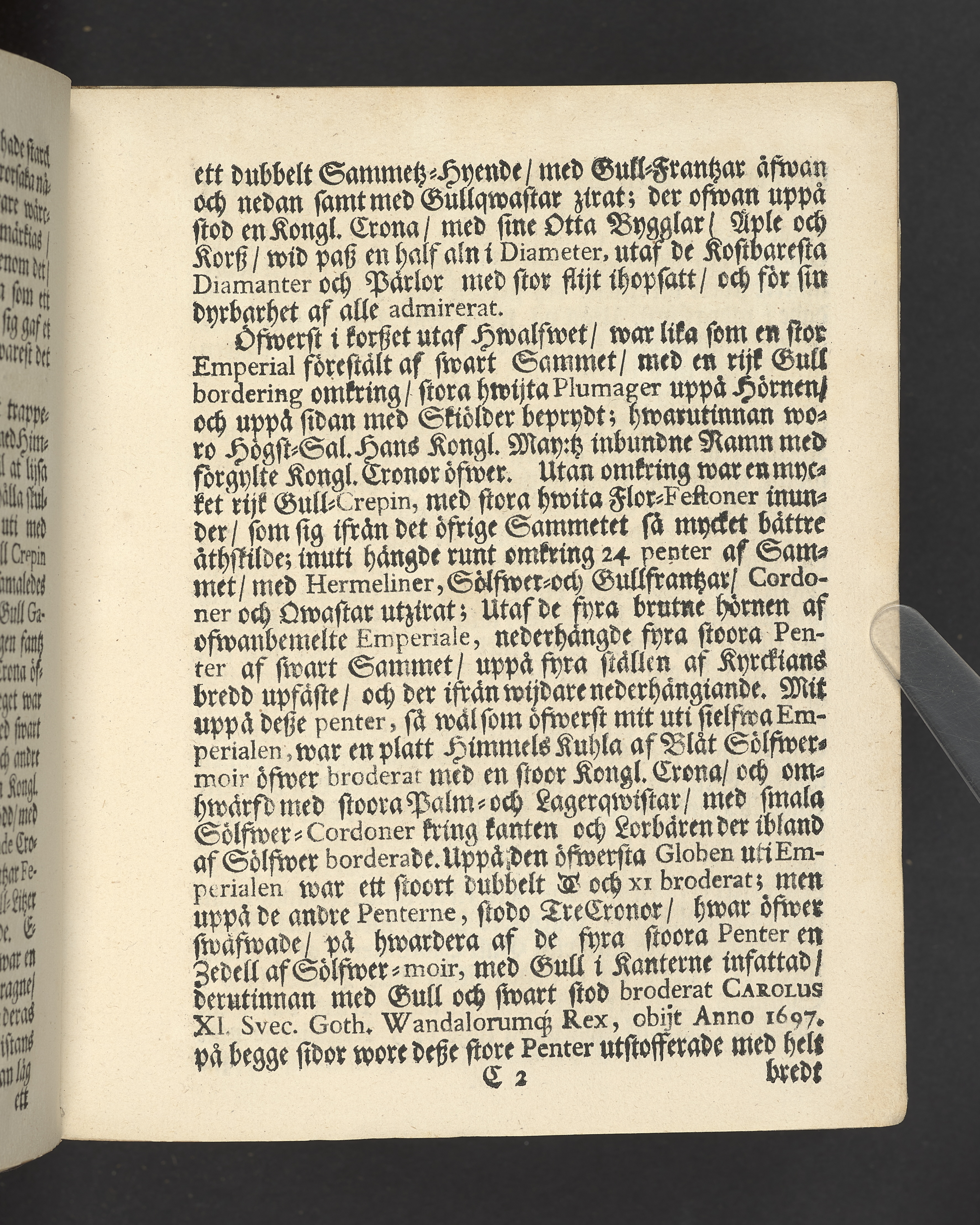 Kort Berättelse Om den Stormächtigste och uti Åminnelse Glorwyrdigste Konungs Konu[n]g Carl Den Elloftes Sweriges, Giötes och Wändes Konungz &c. &c. &c. Begrafning, Som skedde i Stockholm och Ridderholms Kyrkian den 24 Novembris Åhr 1697. Stockholm, Tryckt i Kongl. Boktr. hoos Sal. Wankifs Enkia.