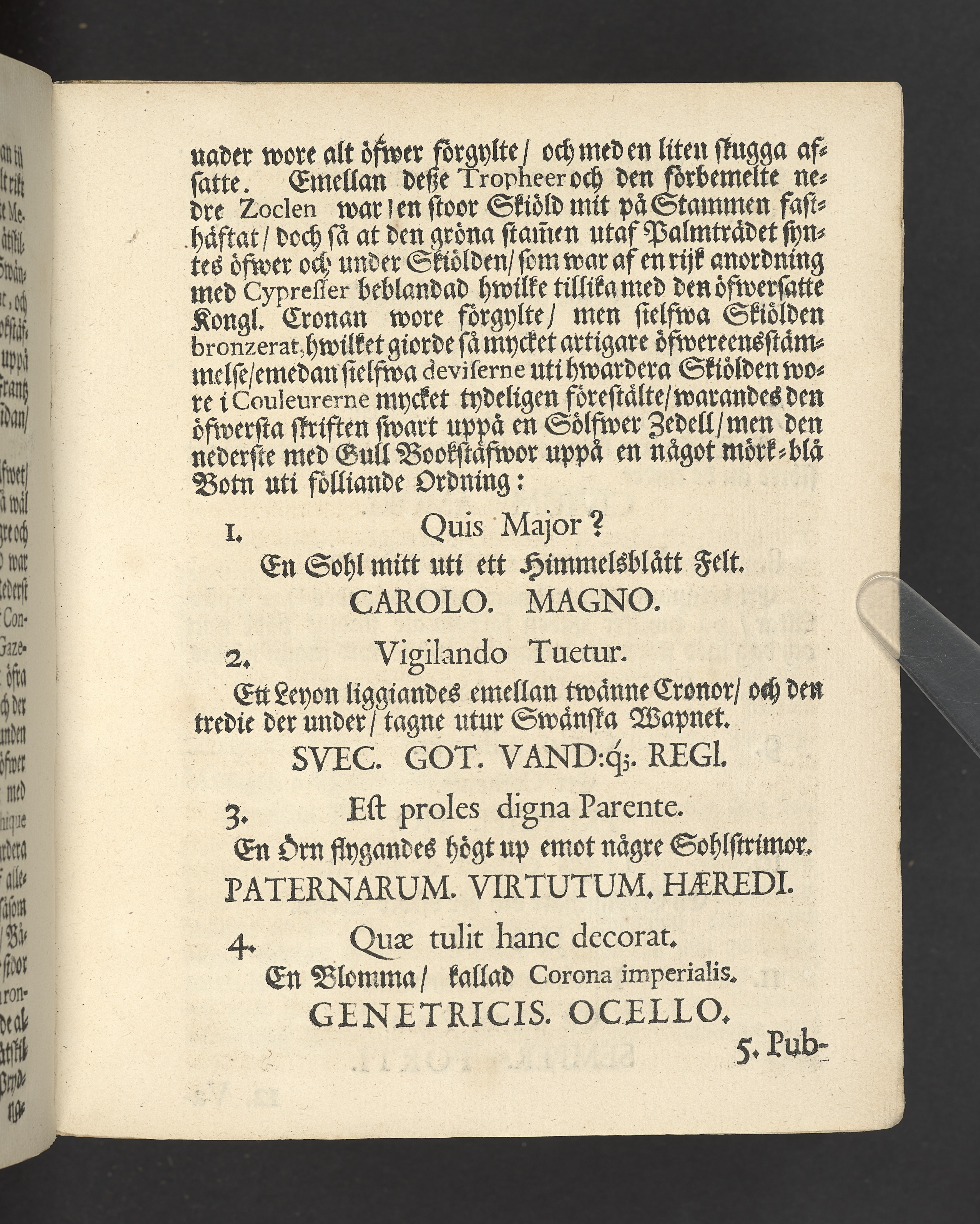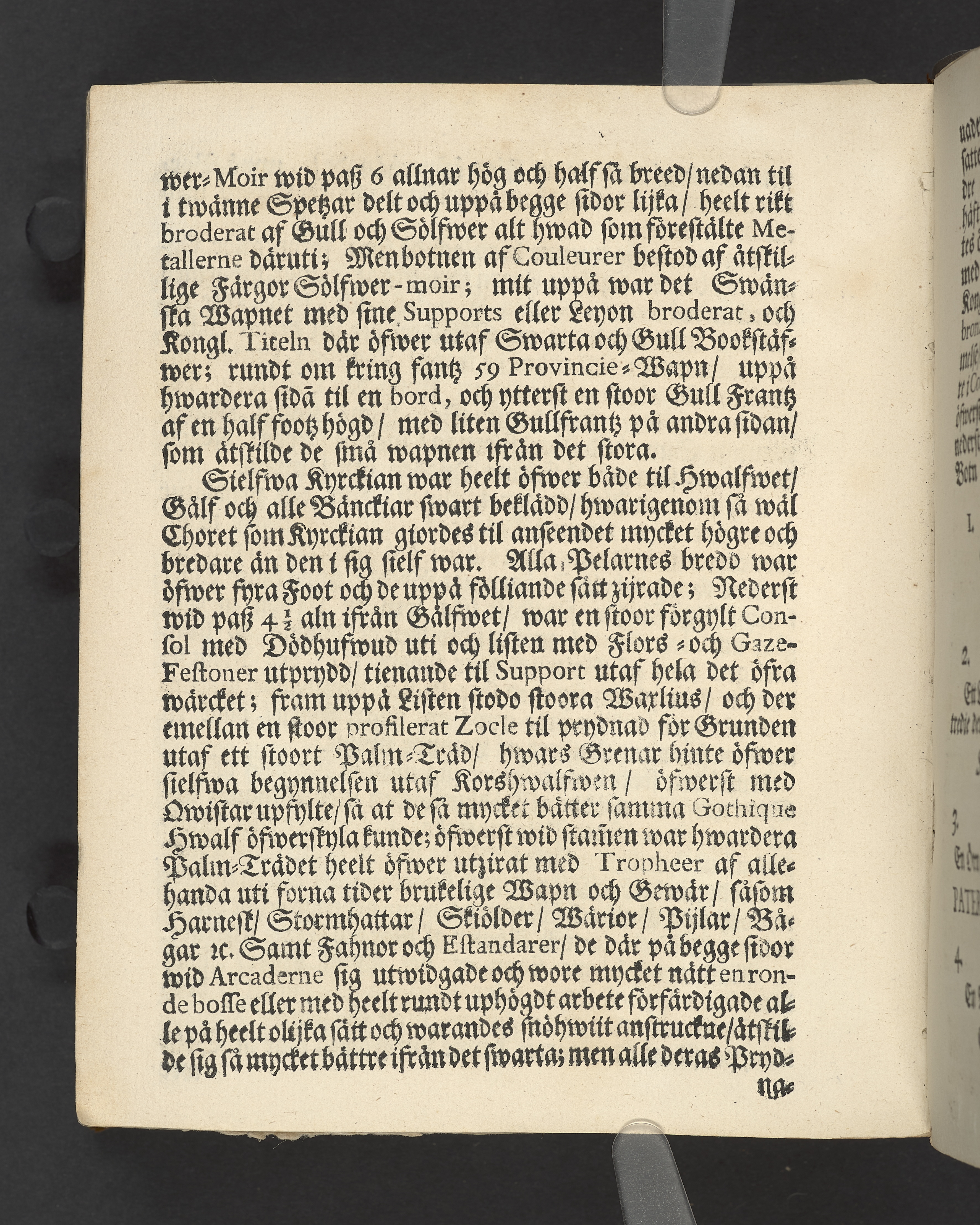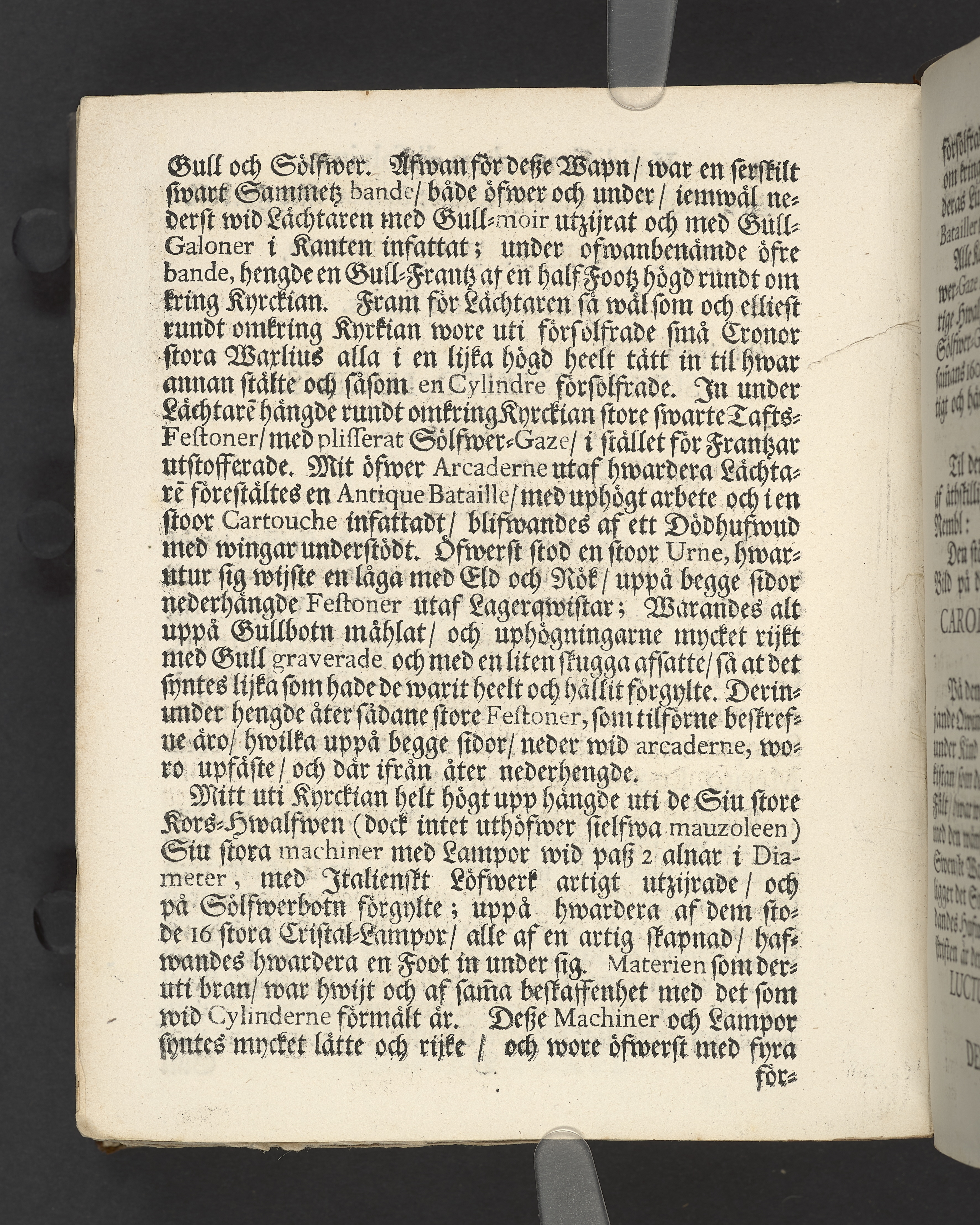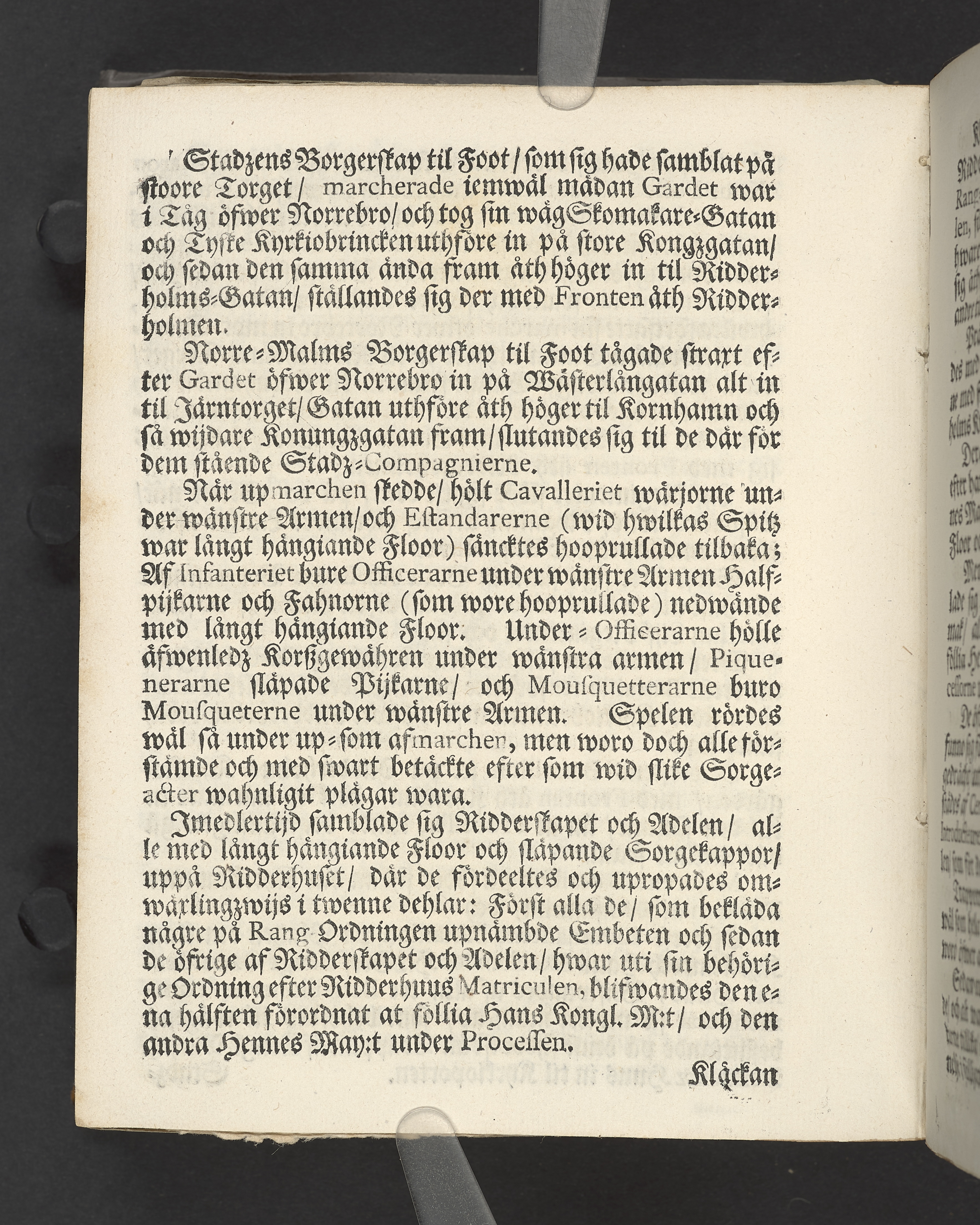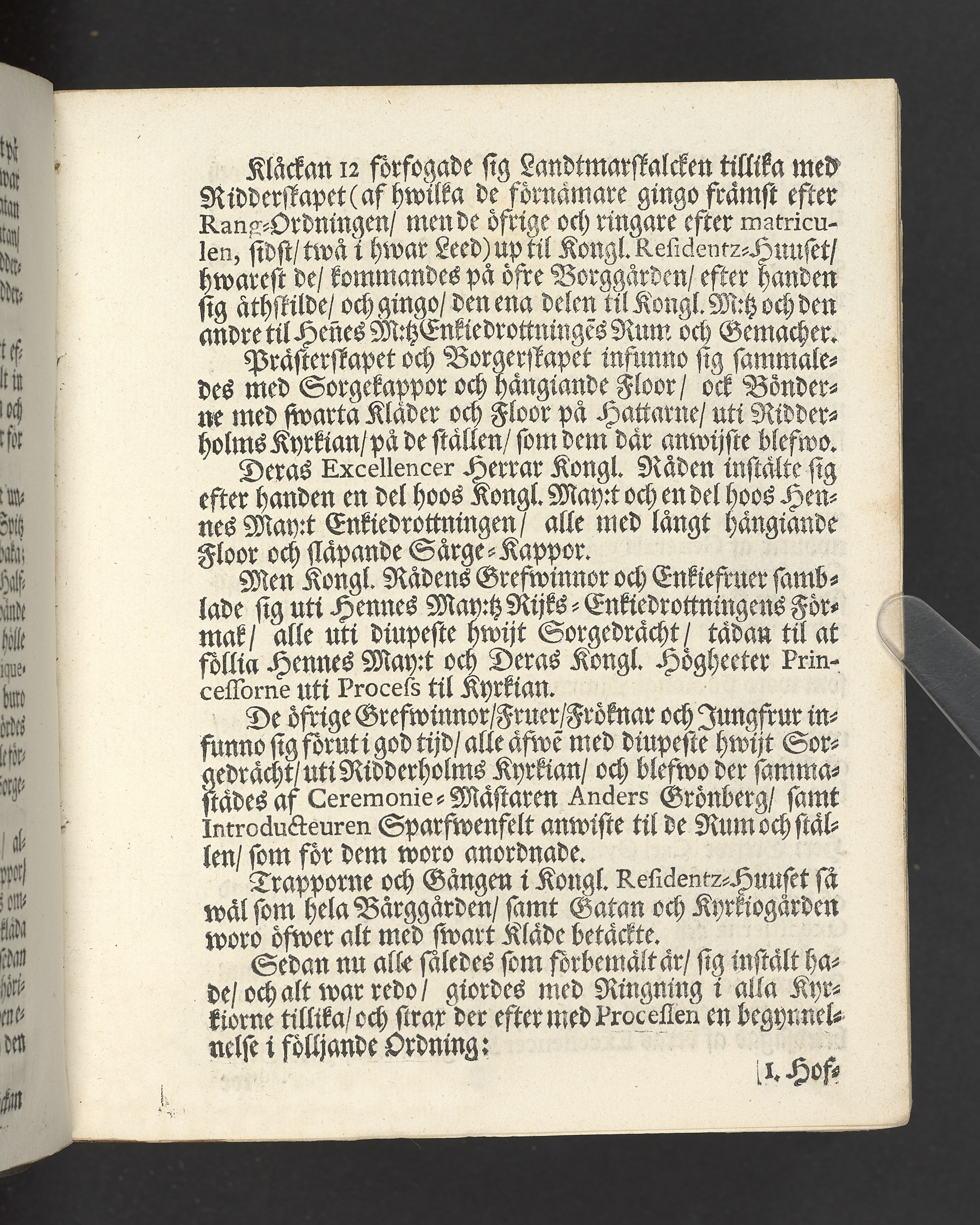 Kort Berättelse Om den Stormächtigste och uti Åminnelse Glorwyrdigste Konungs Konu[n]g Carl Den Elloftes Sweriges, Giötes och Wändes Konungz &c. &c. &c. Begrafning, Som skedde i Stockholm och Ridderholms Kyrkian den 24 Novembris Åhr 1697. Stockholm, Tryckt i Kongl. Boktr. hoos Sal. Wankifs Enkia.