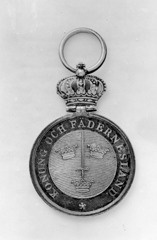Krönt silvermedalj, åtsida: svärdsorden medaljong, text: "KONUNG OCH FÄDERNESLAND". Frånsida, text: "FÖR // KRIGSMANNA // FÖRTJÄNSTER".