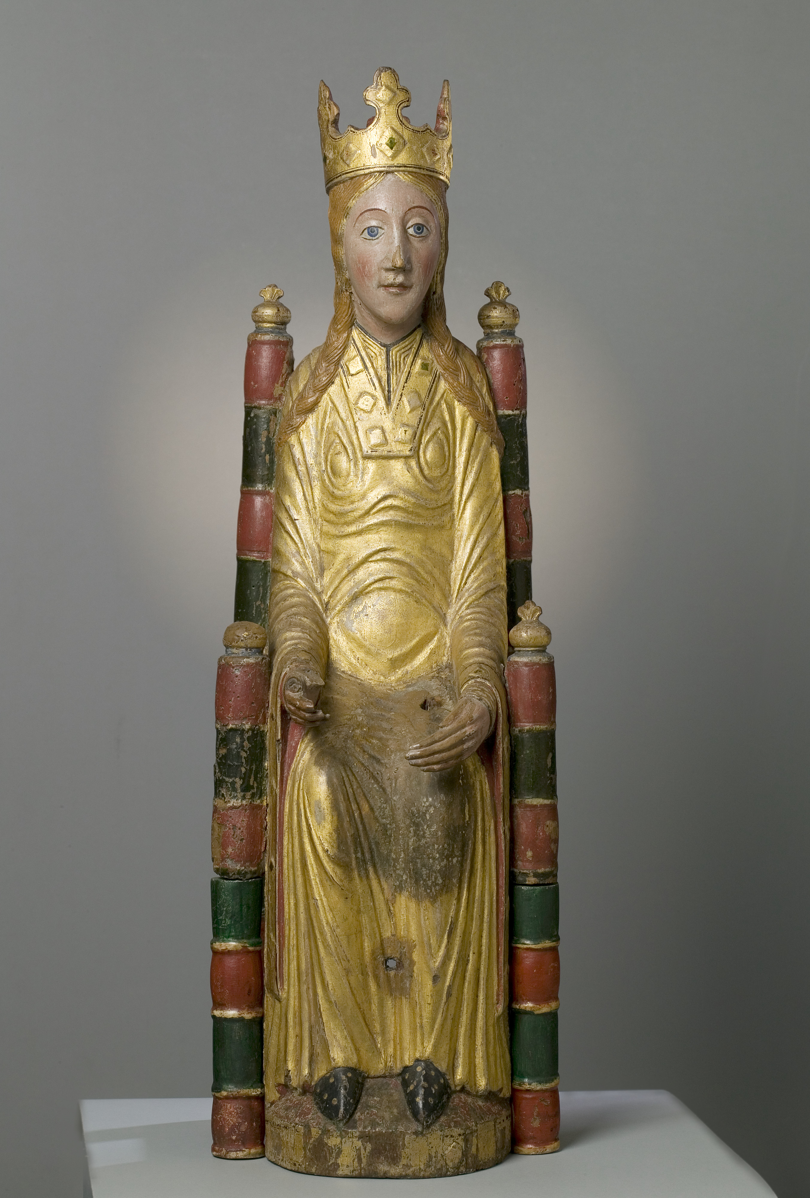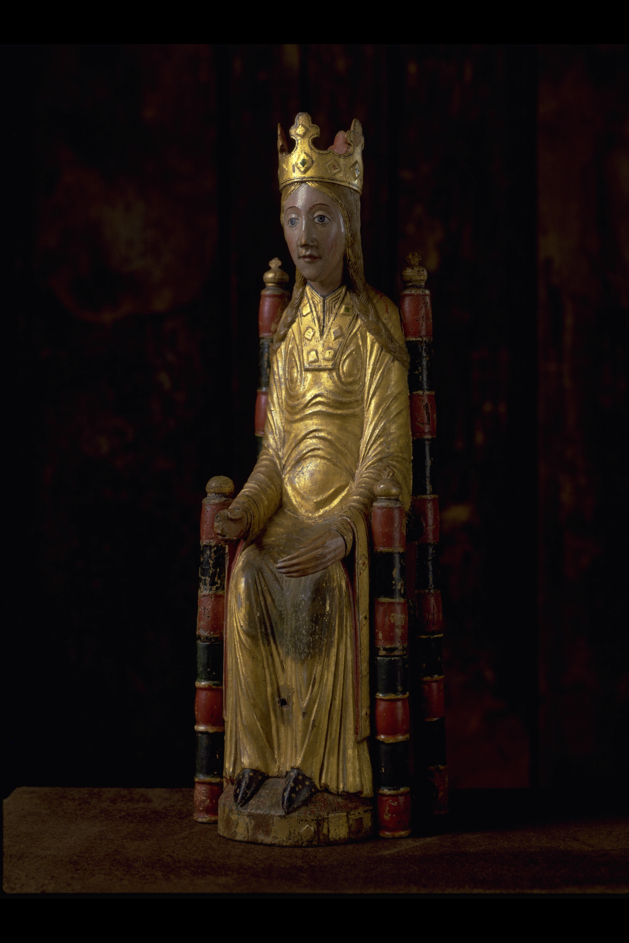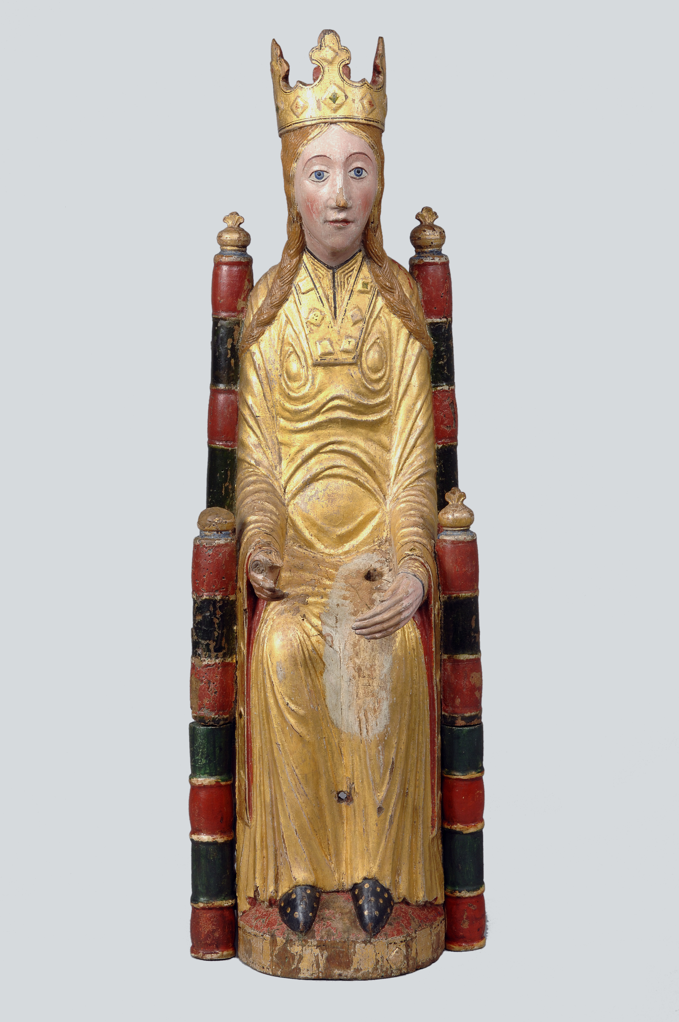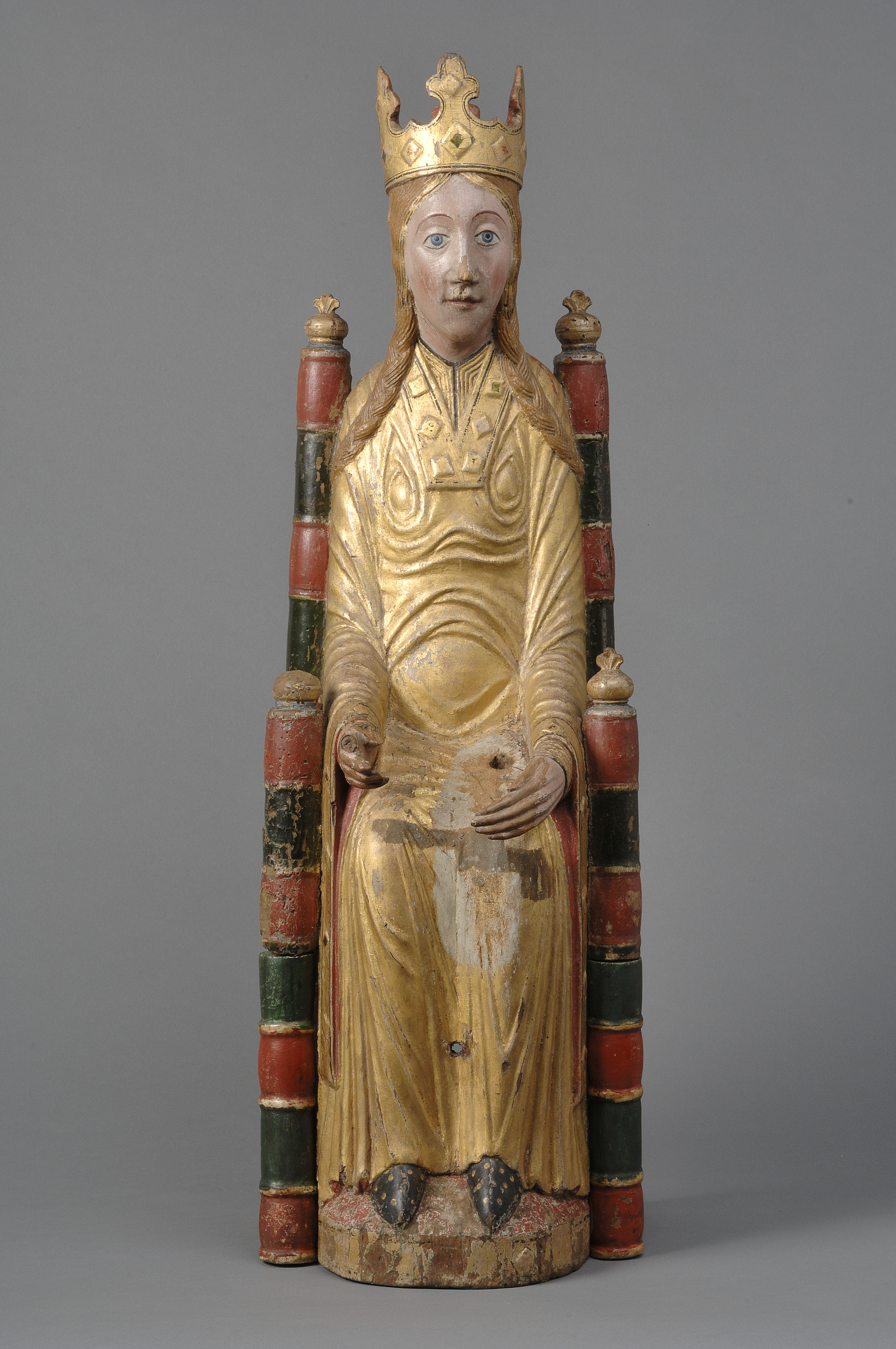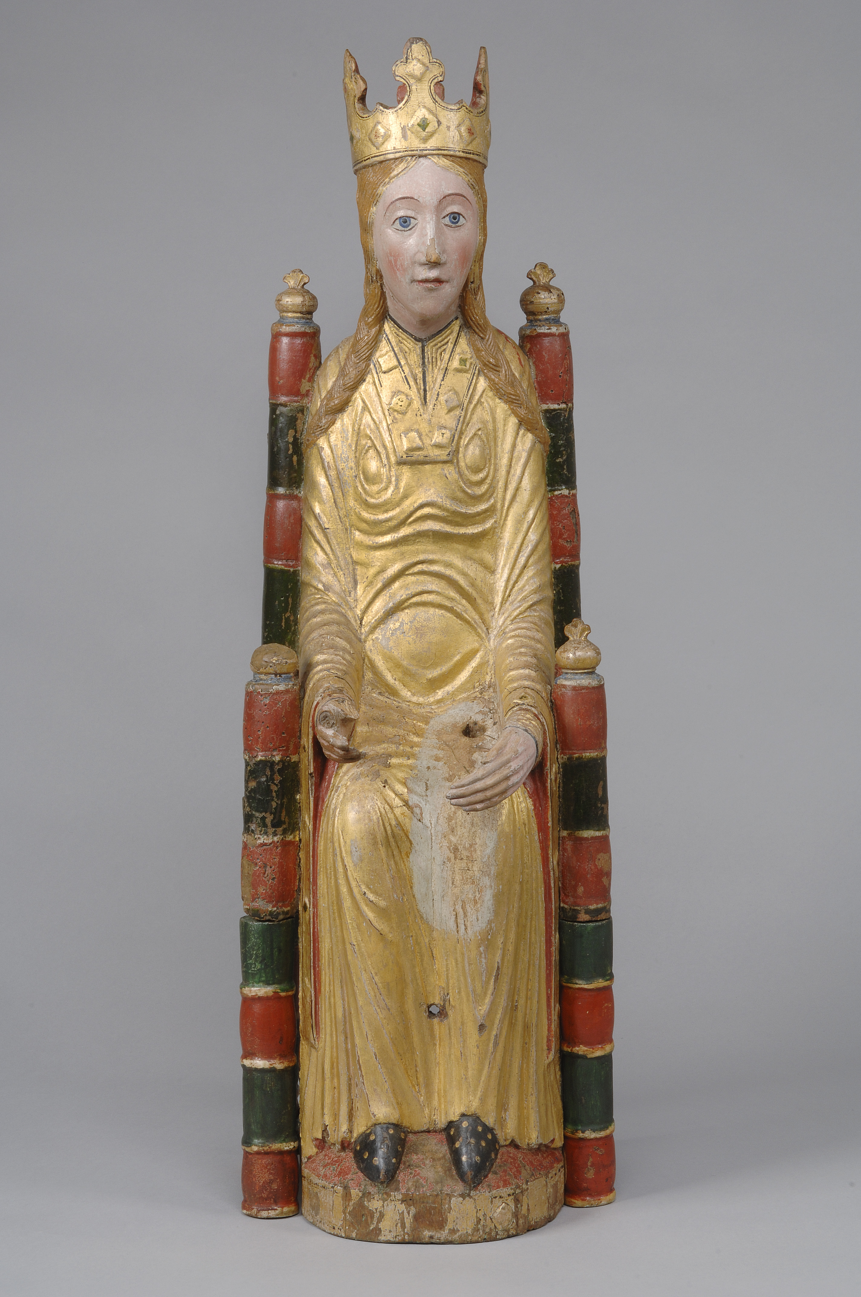 Kondition: god, barnet förlorat, högra handen skadad, stolens bakre ben rekonstruerade. Färg: ovanligt välbevarad polykromi.