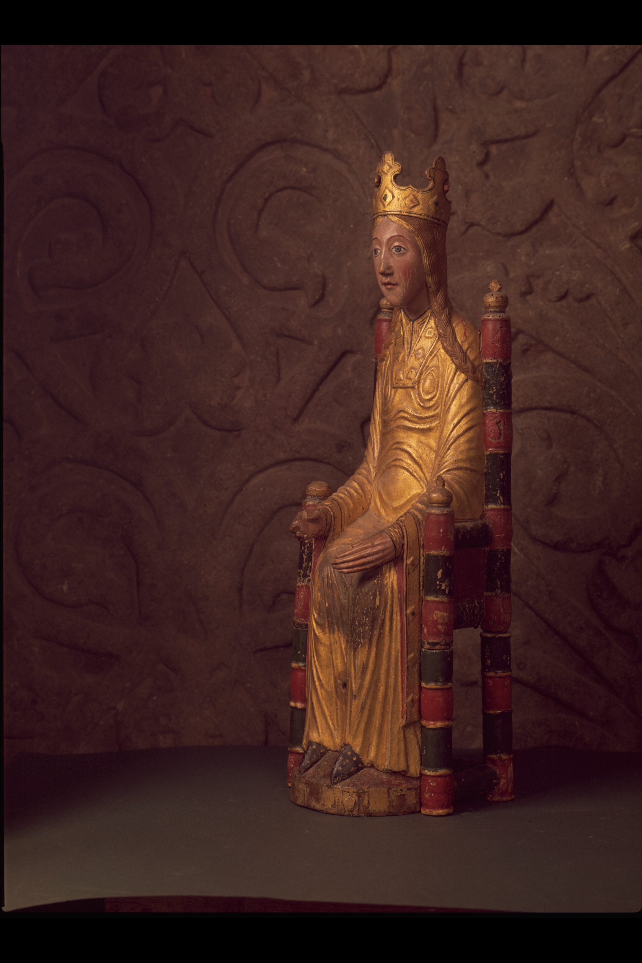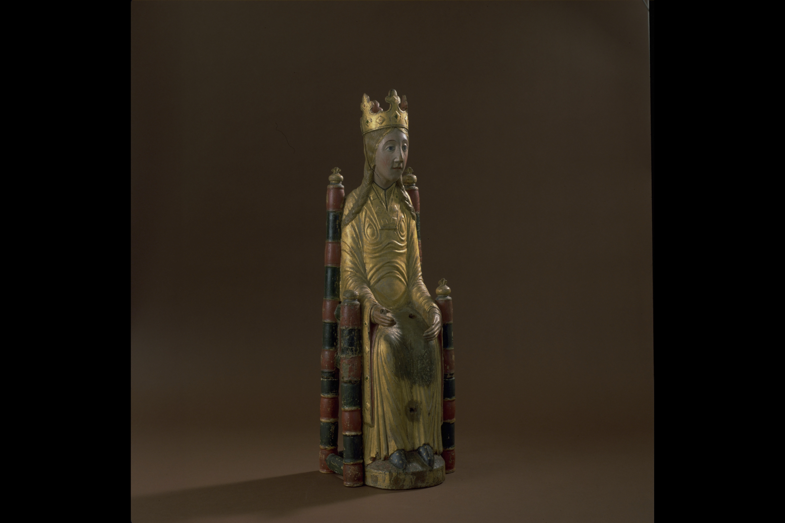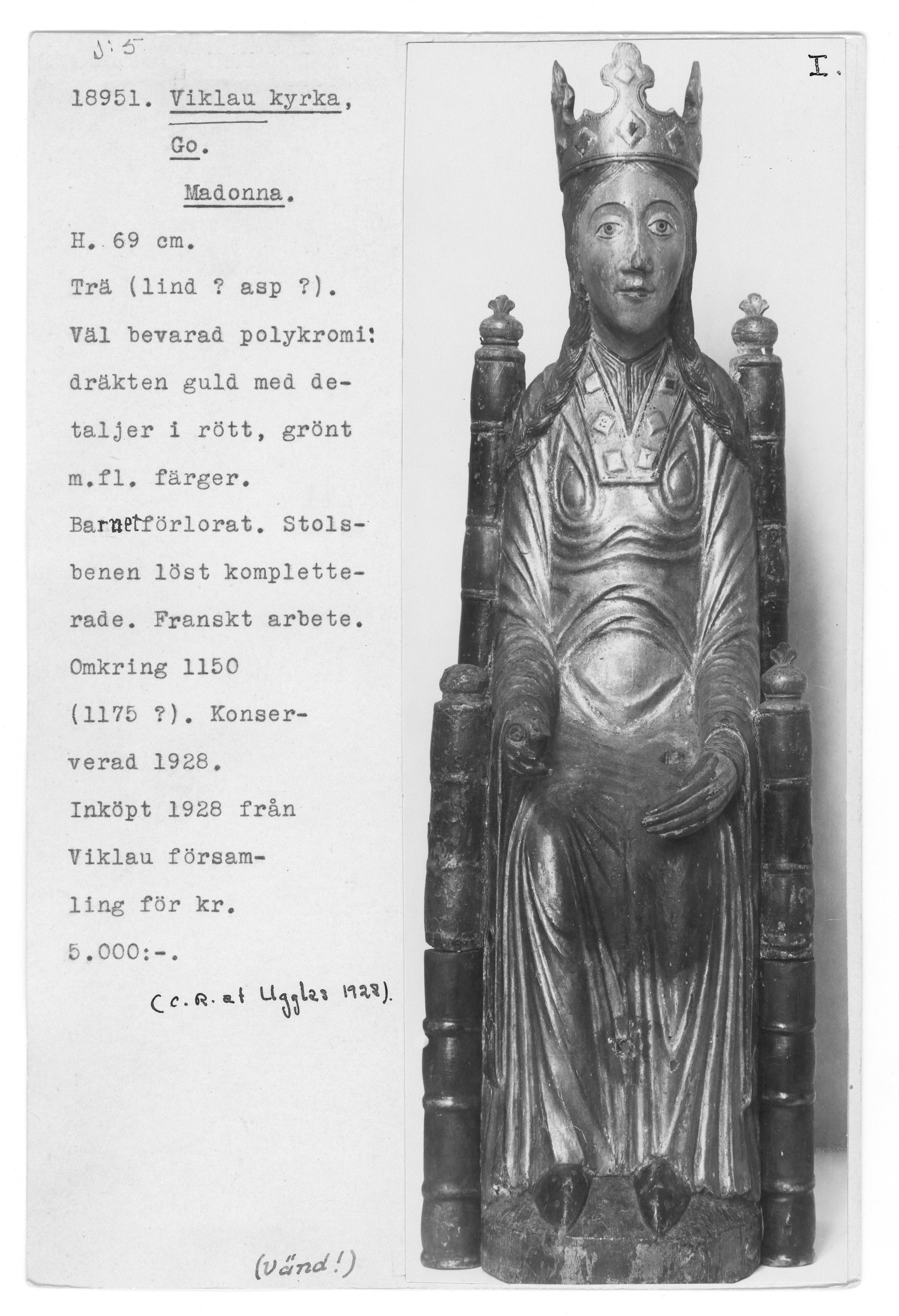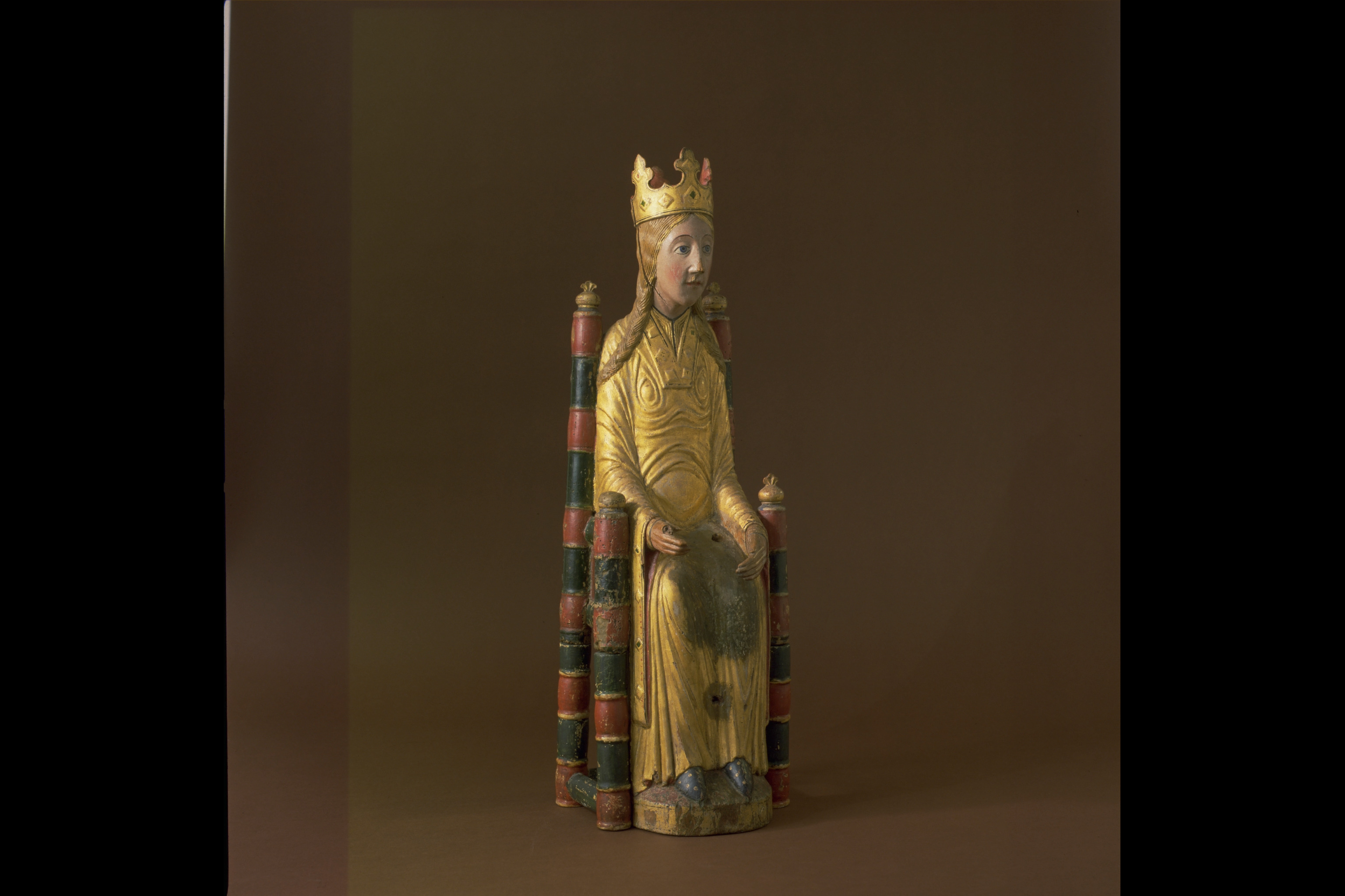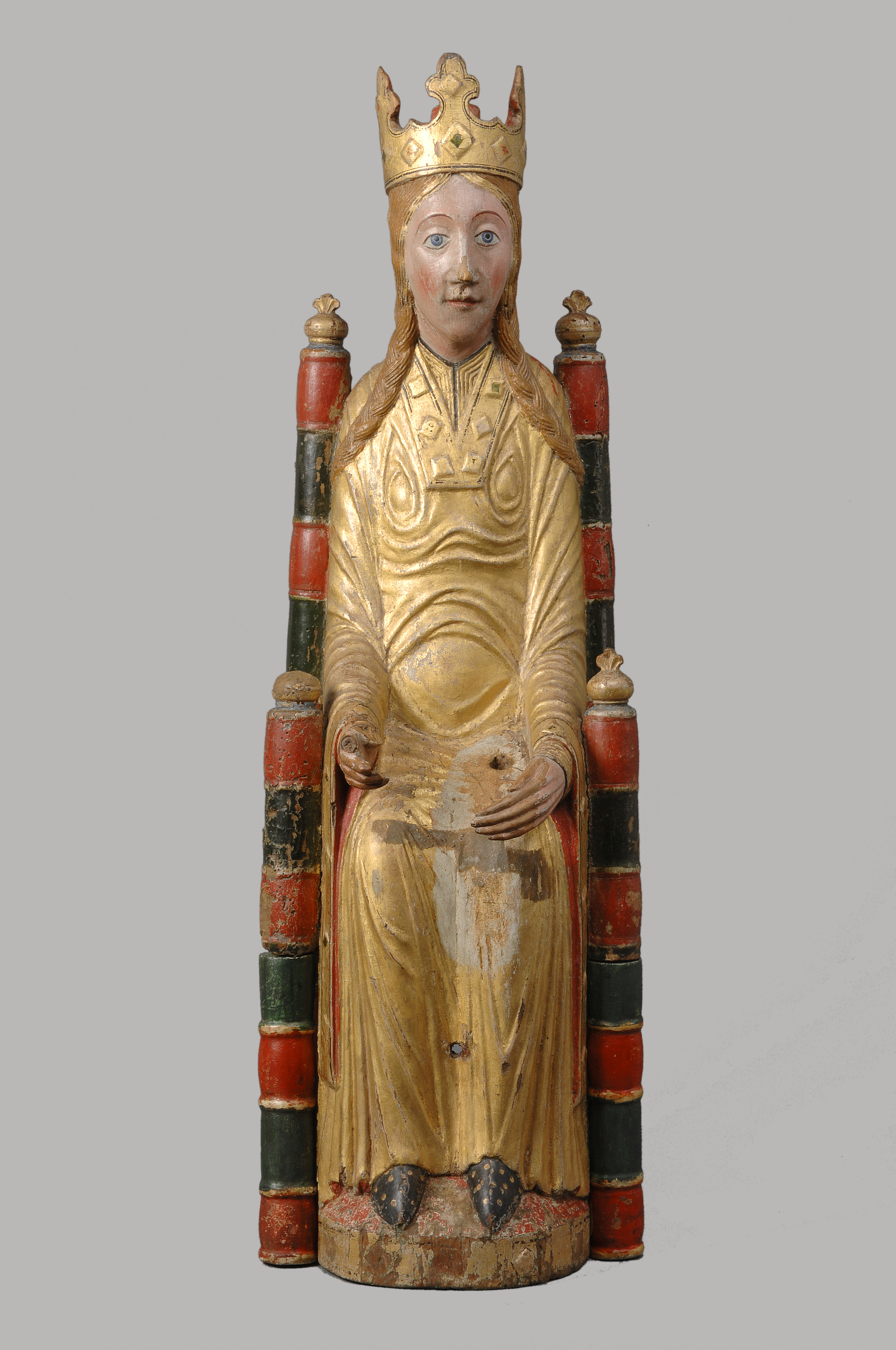 Kondition: god, barnet förlorat, högra handen skadad, stolens bakre ben rekonstruerade. Färg: ovanligt välbevarad polykromi.
