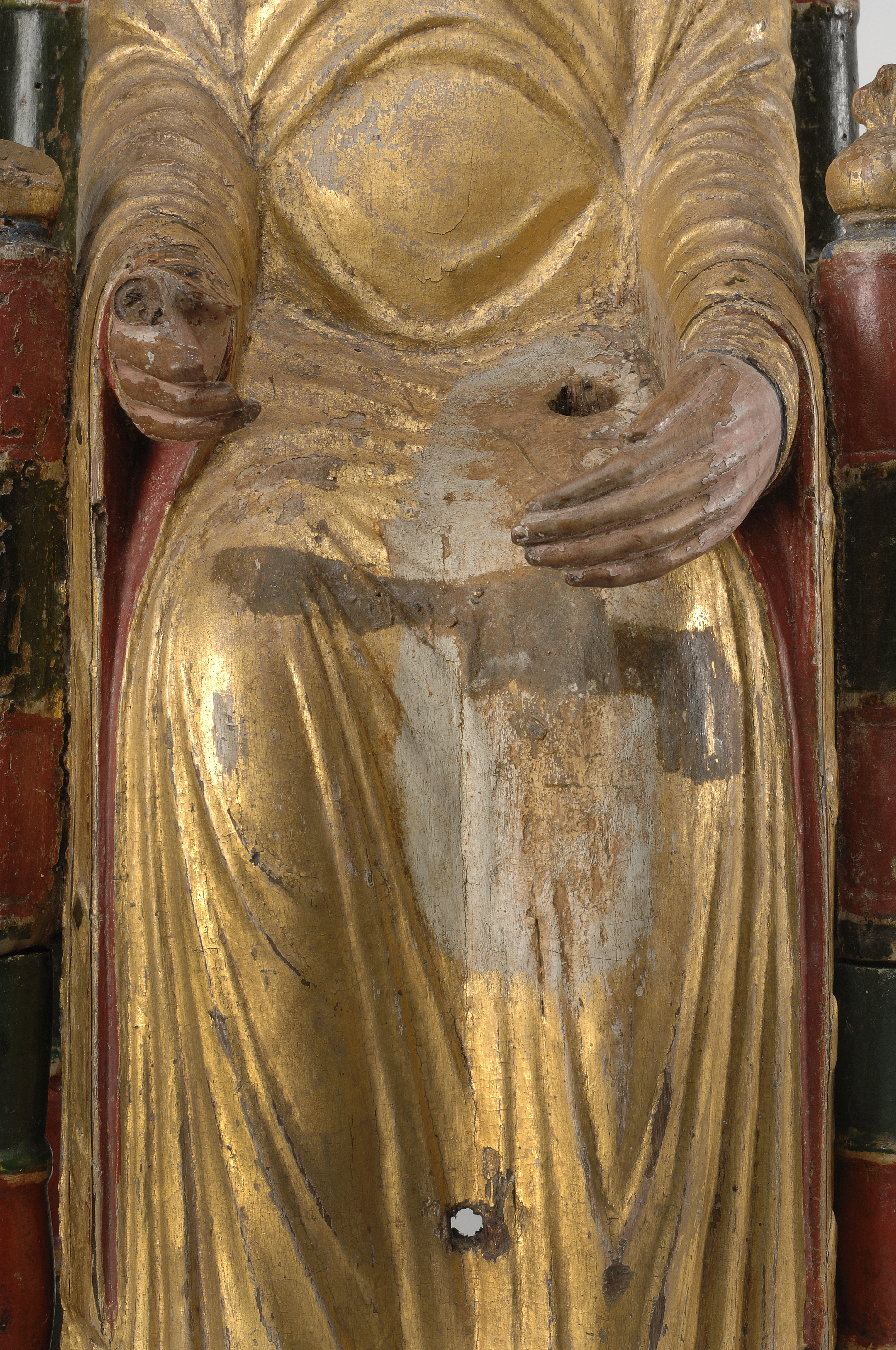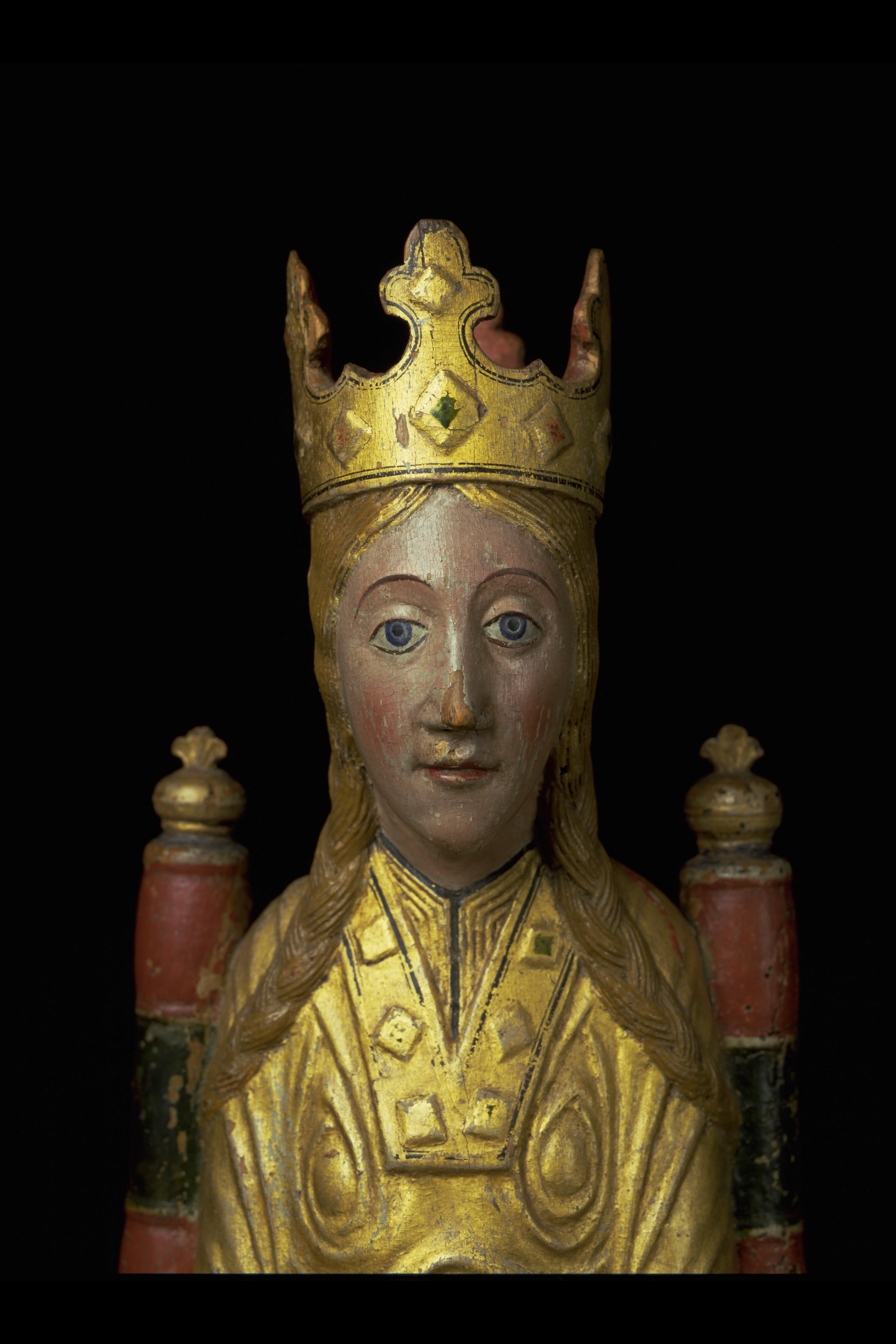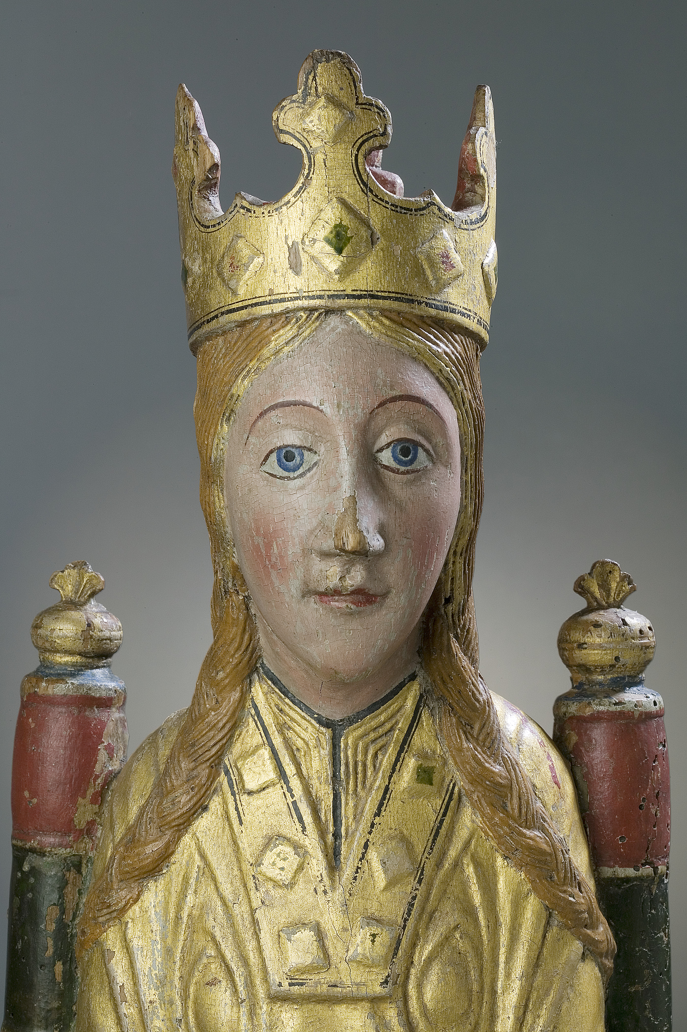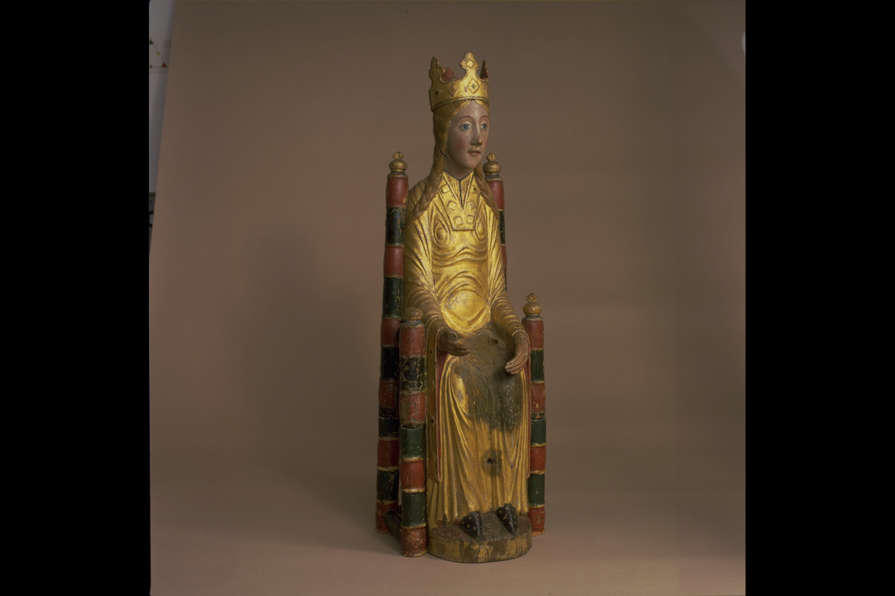 Kondition: god, barnet förlorat, högra handen skadad, stolens bakre ben rekonstruerade. Färg: ovanligt välbevarad polykromi.