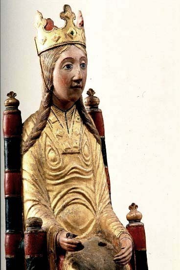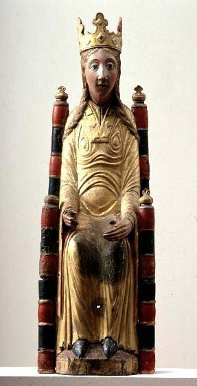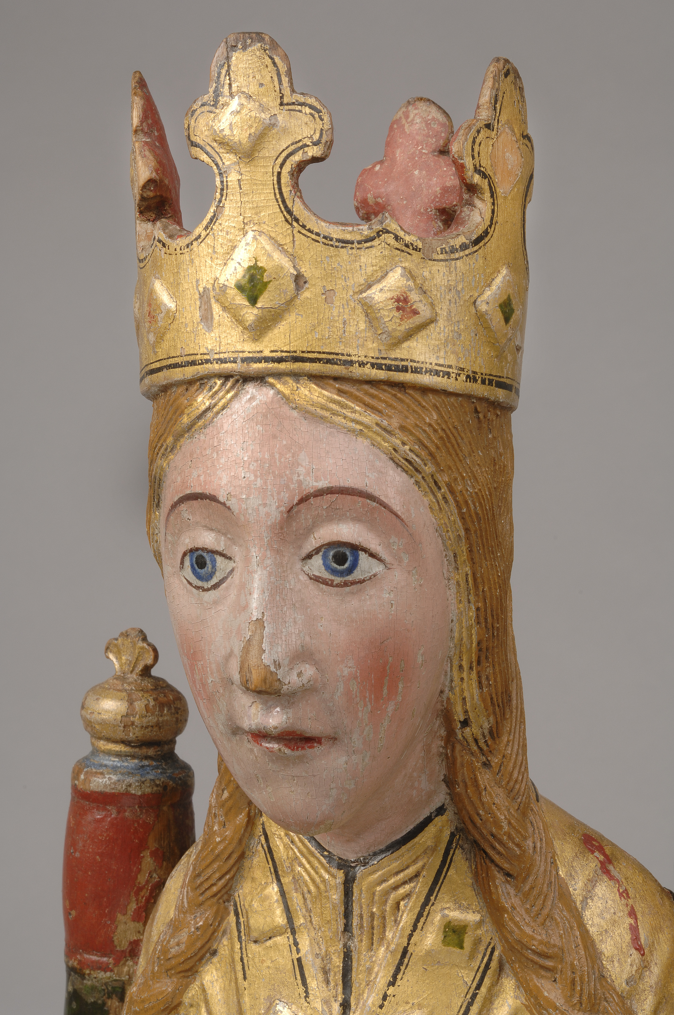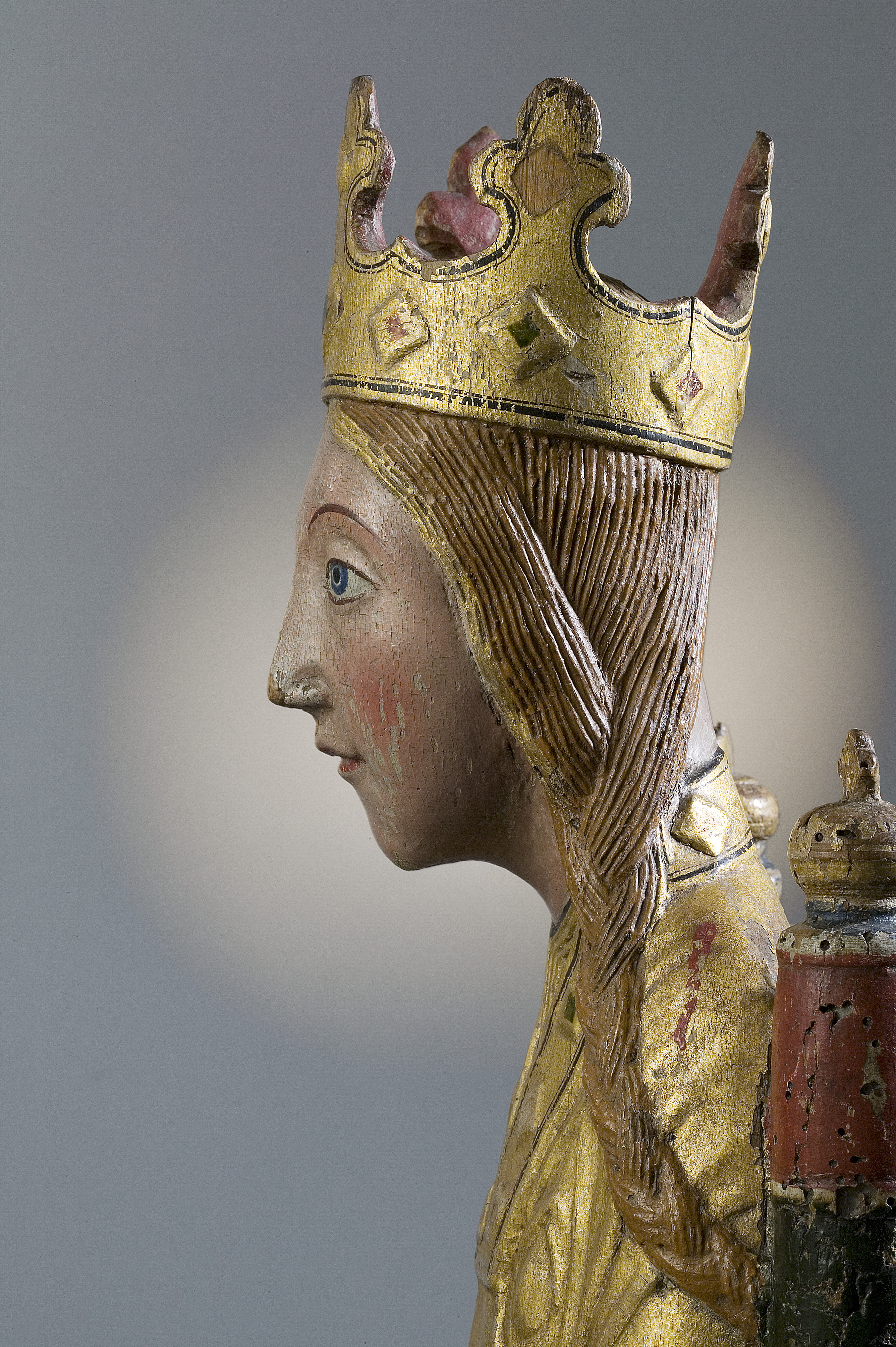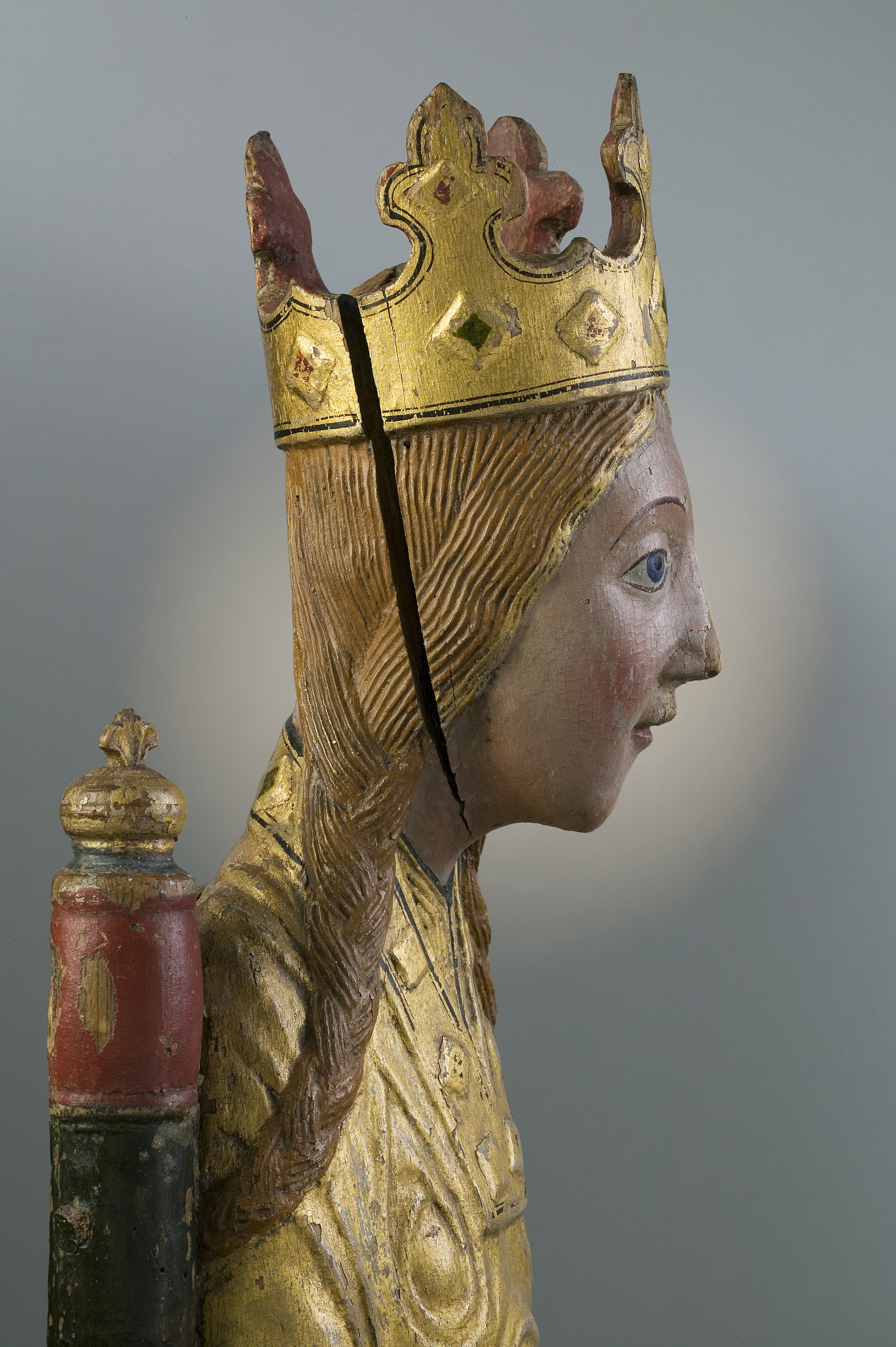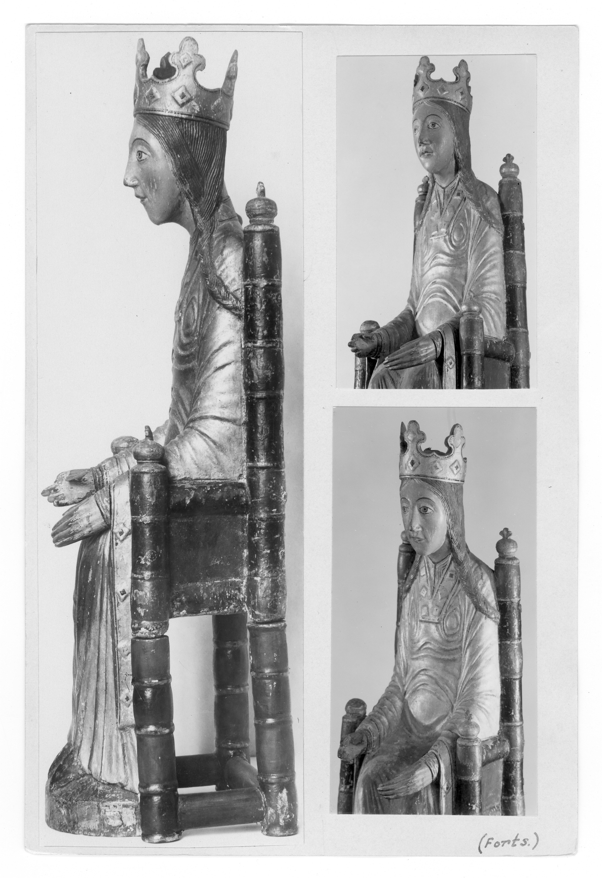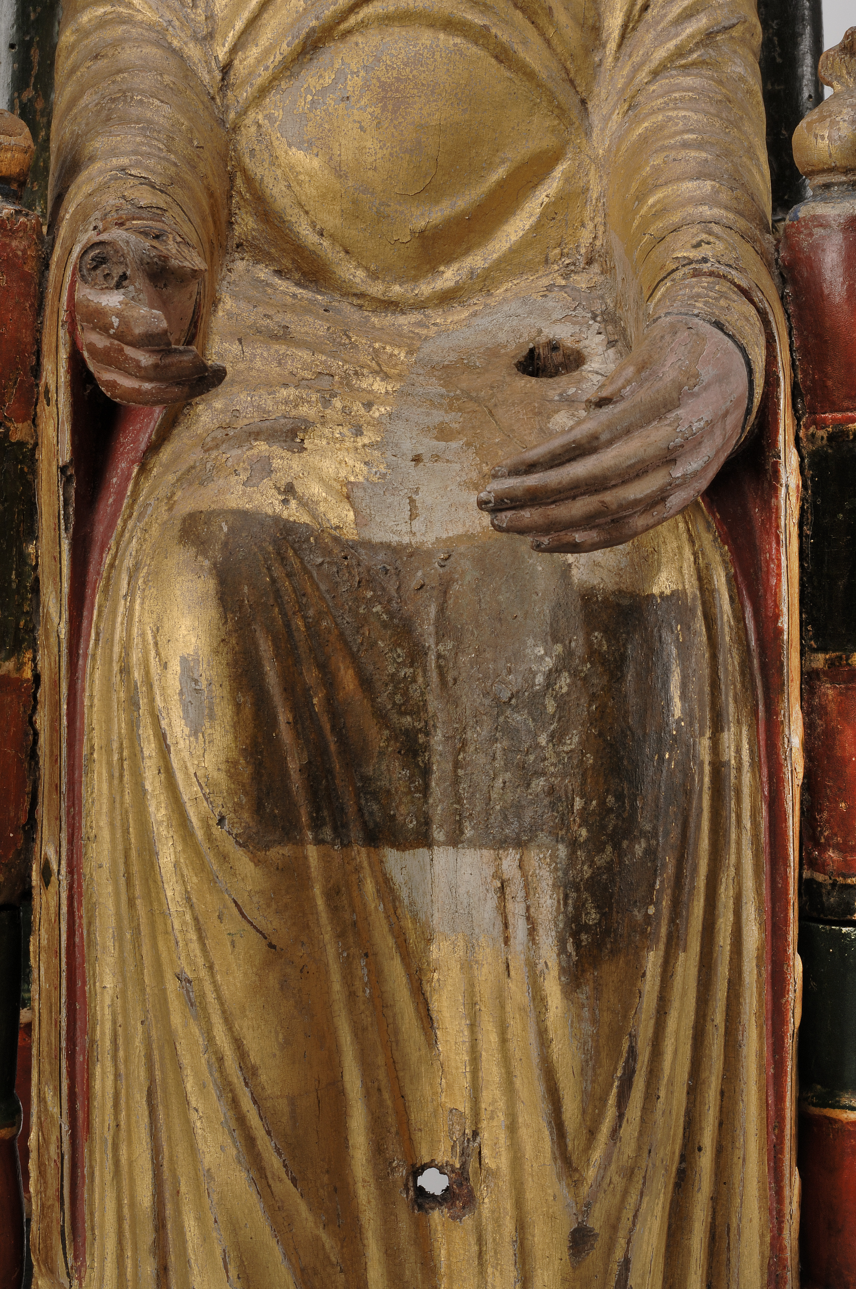 Kondition: god, barnet förlorat, högra handen skadad, stolens bakre ben rekonstruerade. Färg: ovanligt välbevarad polykromi.