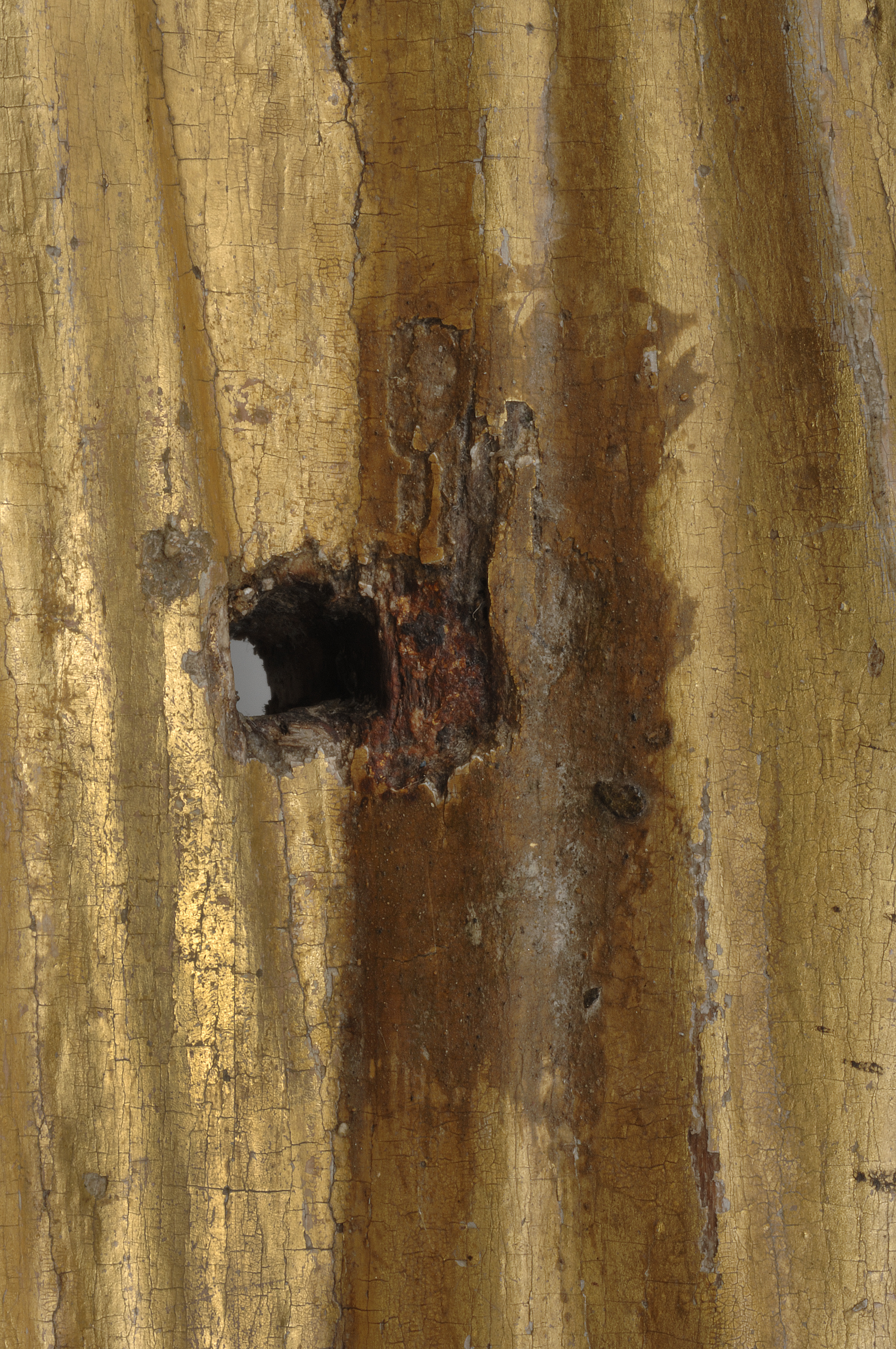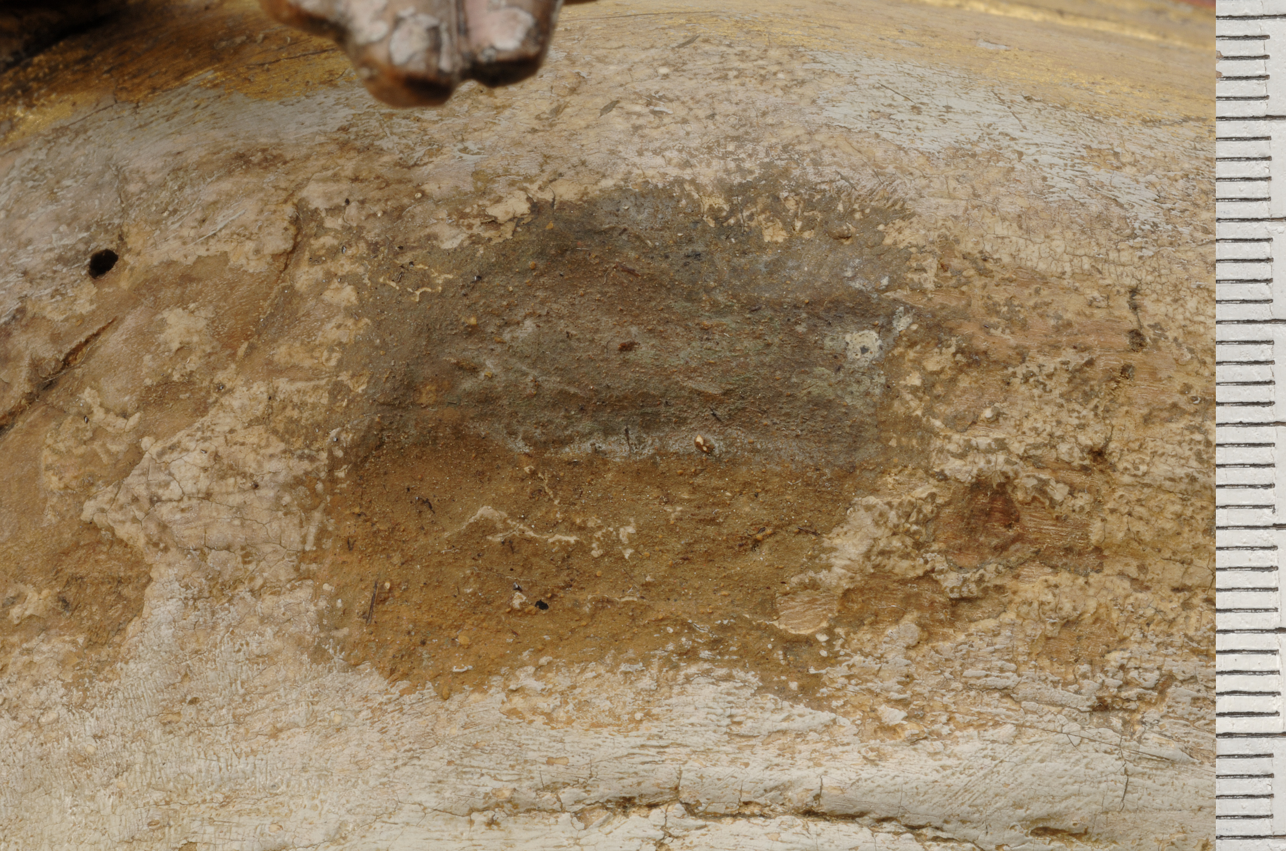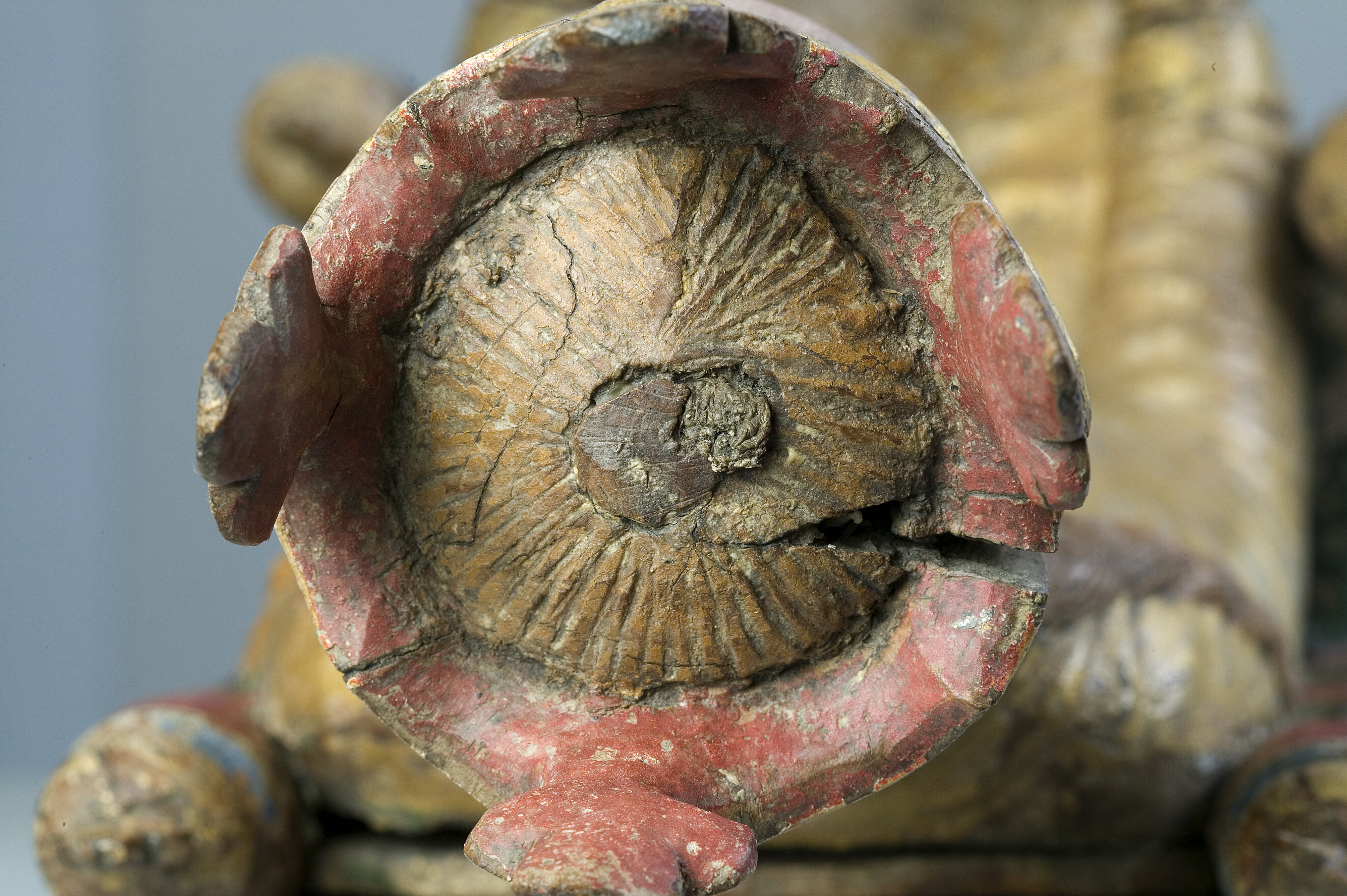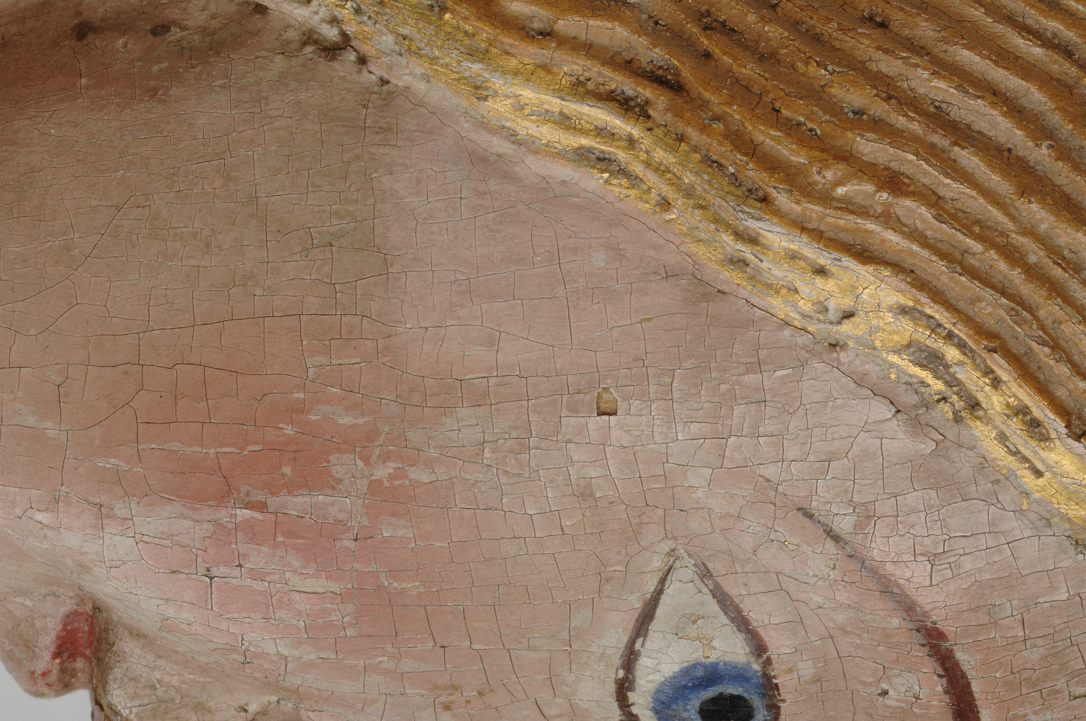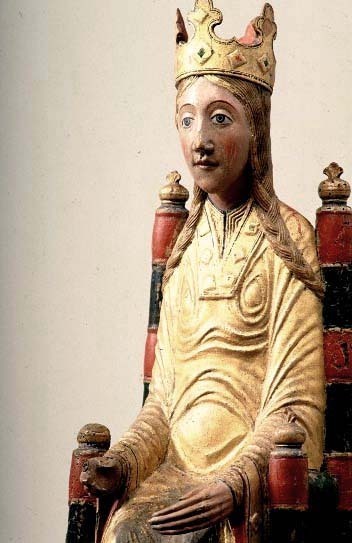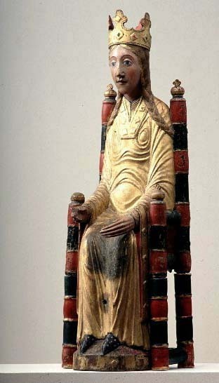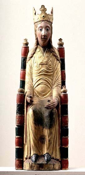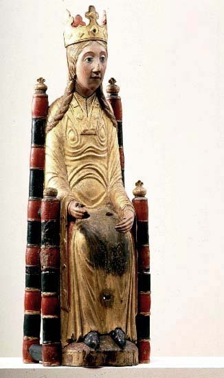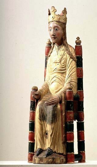Kondition: god, barnet förlorat, högra handen skadad, stolens bakre ben rekonstruerade. Färg: ovanligt välbevarad polykromi.