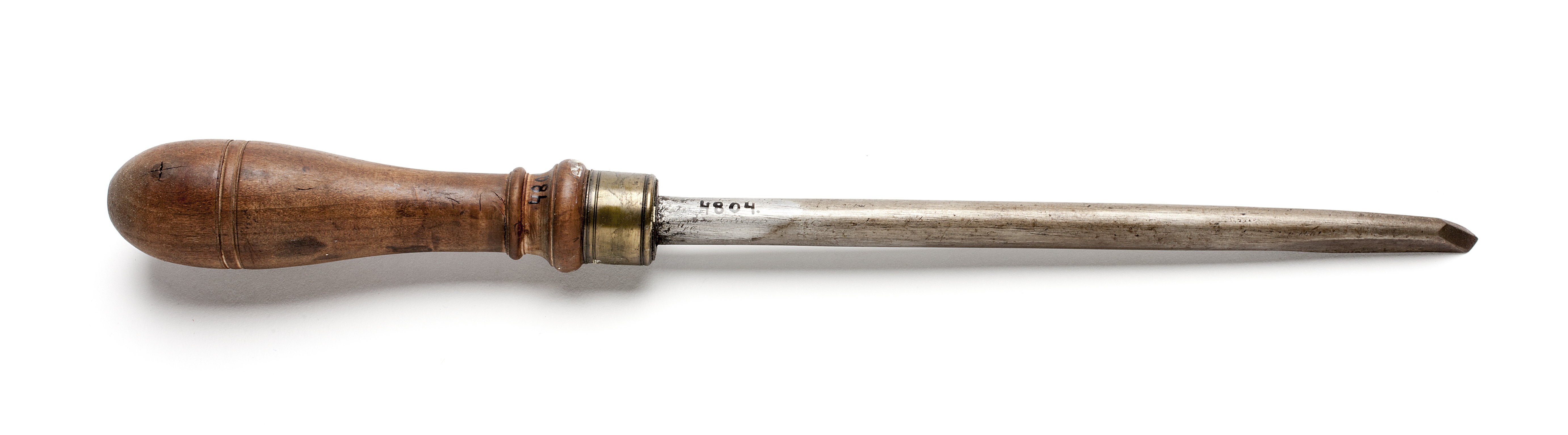 Rund klinga, i änden med tillplattade sidor och ovansida. Spetsig egg. Svarvat skaft av päronträ med två vulster nedtill ("skoklostertyp"). Mässingsring.