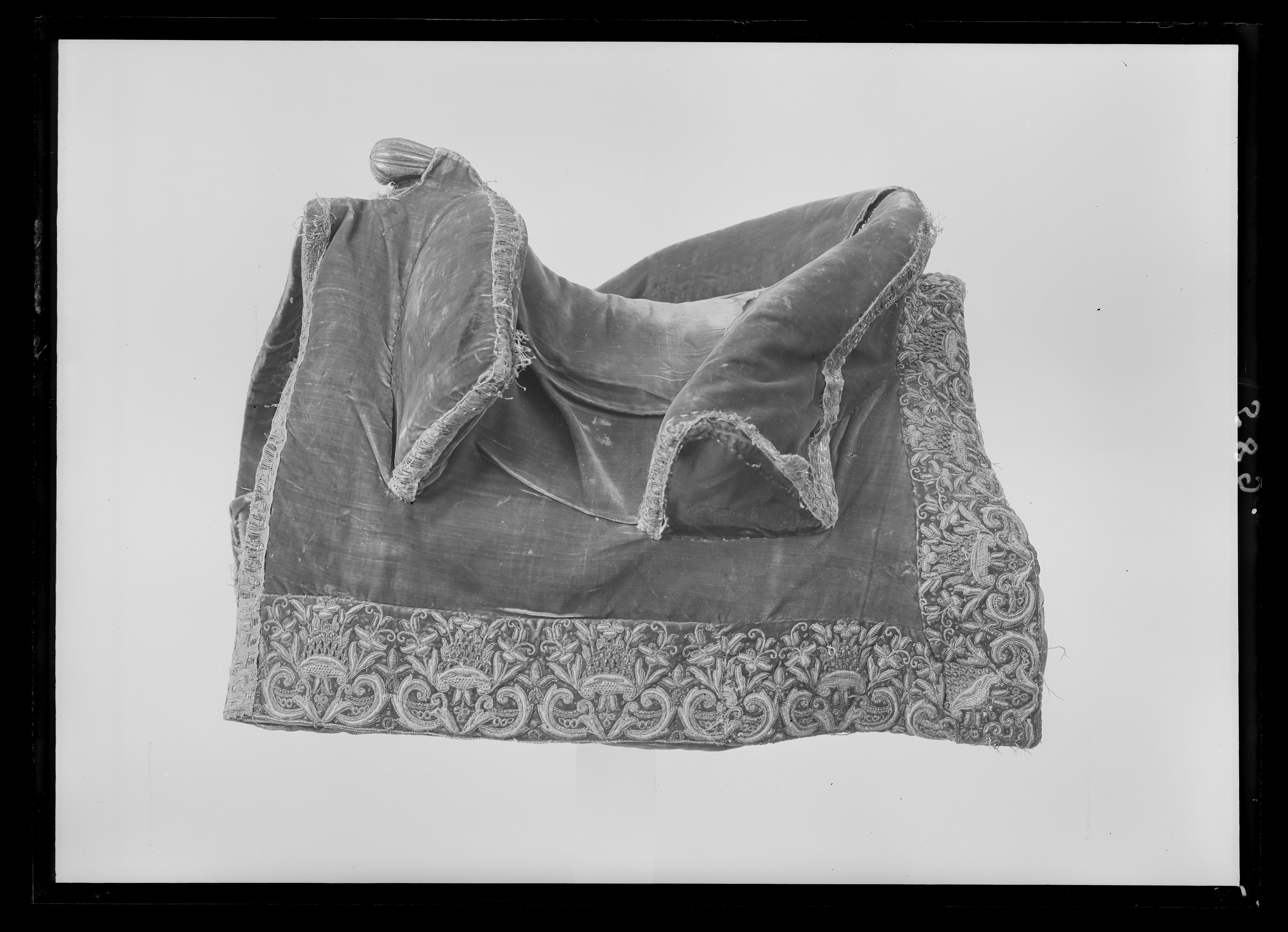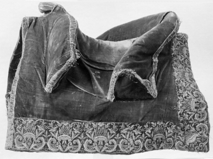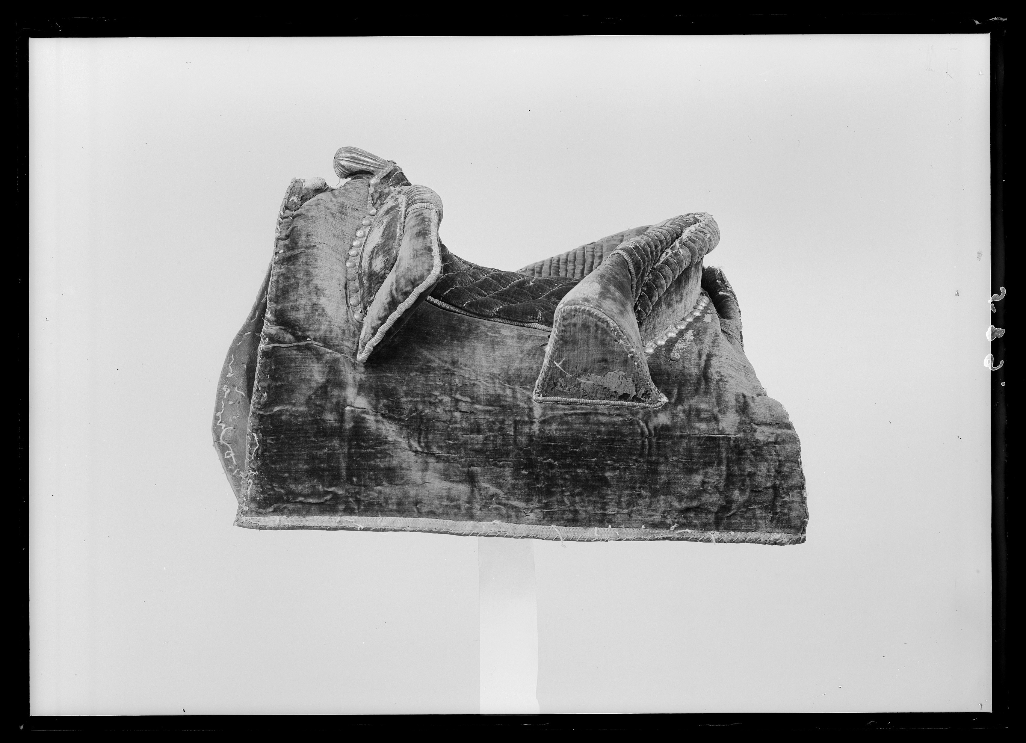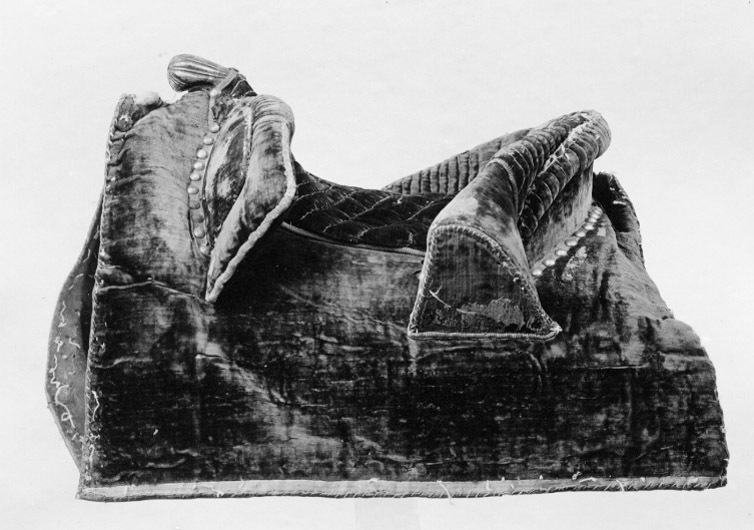 Sadel av purpursammet med rektangulära kappor fodrade och kantade med brunt skinn. Sitsen kantad med guldgaloner. På den och bommarnas insidor stickningar med guldtråd. Tvådelad frambom 500 mm bred, 90 mm hög. Bakbom 530 mm bred, 120 mm hög med stödbommar. Rundad, räfflad, framtill utdragen sadelknapp av förgylld mässing. Framför frambommen på vardera sidan 10 tännlikor av förgylld mässing, bakom bakbommen 20 st likadana. Bom överklädd med väv. Bossor klädda med naturfärgat linne kantade med vitt skinn. Fyra stroppar av läder för sadelgjord, två byglar för stigläder, två söljor för förbygel. Tillbehör: Stigläder av brunt läder med sölja av stål, 1180 mm långt.