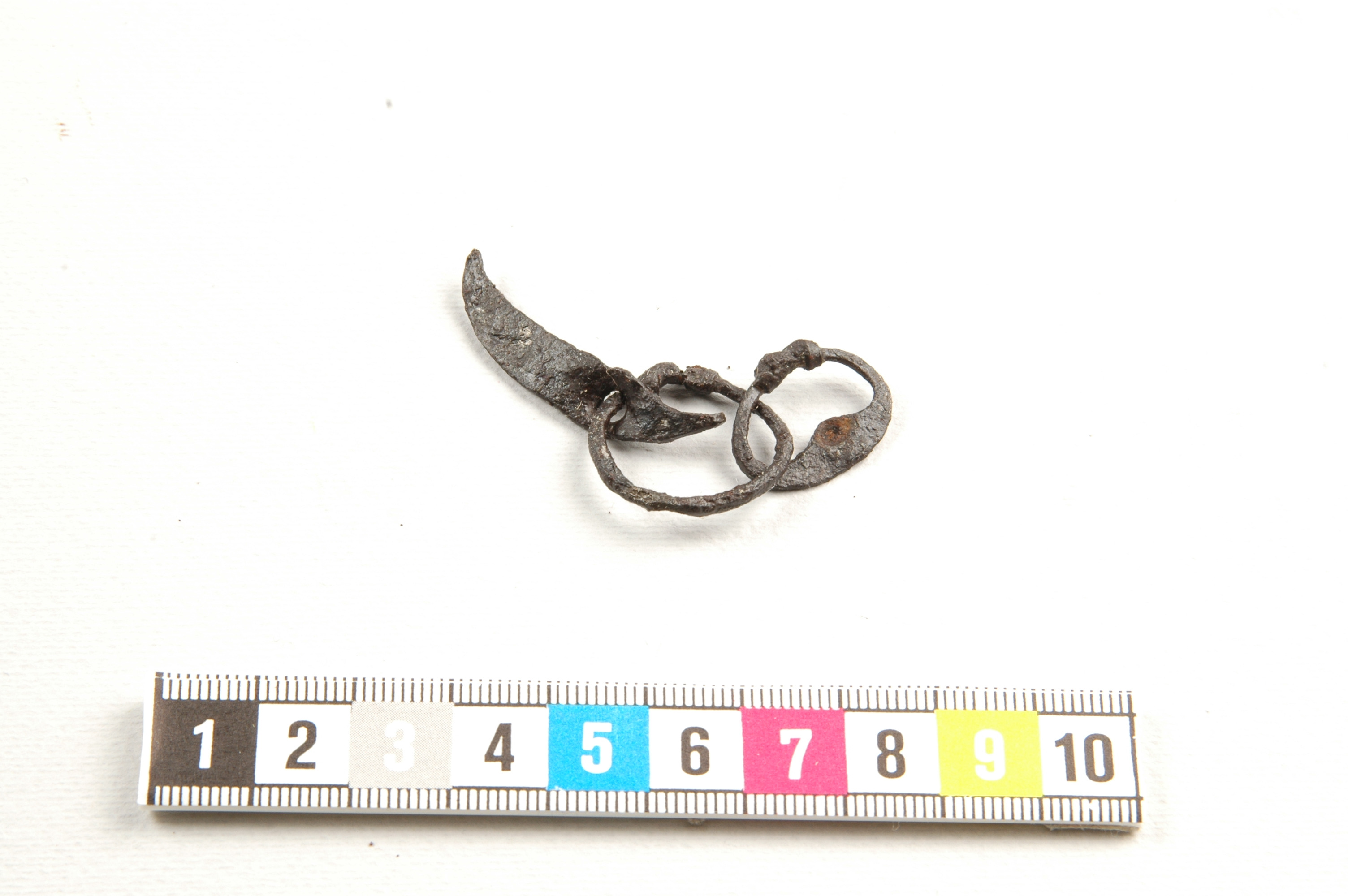 Liten ring med vidhängande miniatyrer av eldstål (1st) och skära (1st).