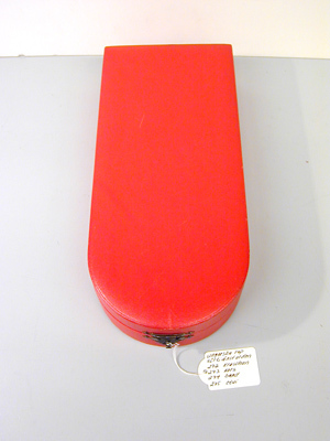 Rektangulärt etui av trä med rundad framkant, utvändigt klätt med ljusröd skinnimitation, under botten grön skinnimitation av mönsterpressat papper. Locket invändigt fodrat med vitt siden. Underdelen klädd med vitt papper, lös insats, klädd på ovansidan med benvit sammet, urtag för tecknen, på undersidan ockragult papper.