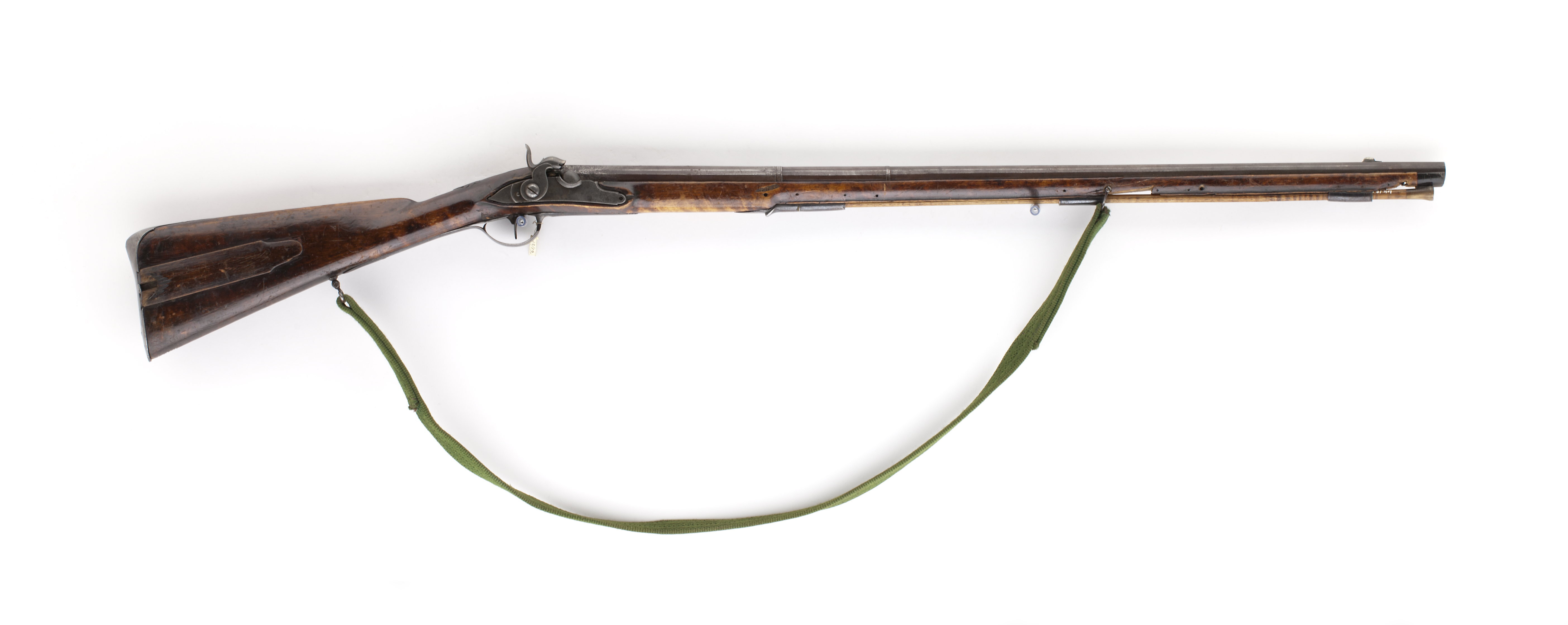Flintlåsbössa med lås ändrat till slaglås. Pipa av Samuel Riddersporre, Norrköping (Samuel II c1750?). Lås och stock 1700-talets mitt.