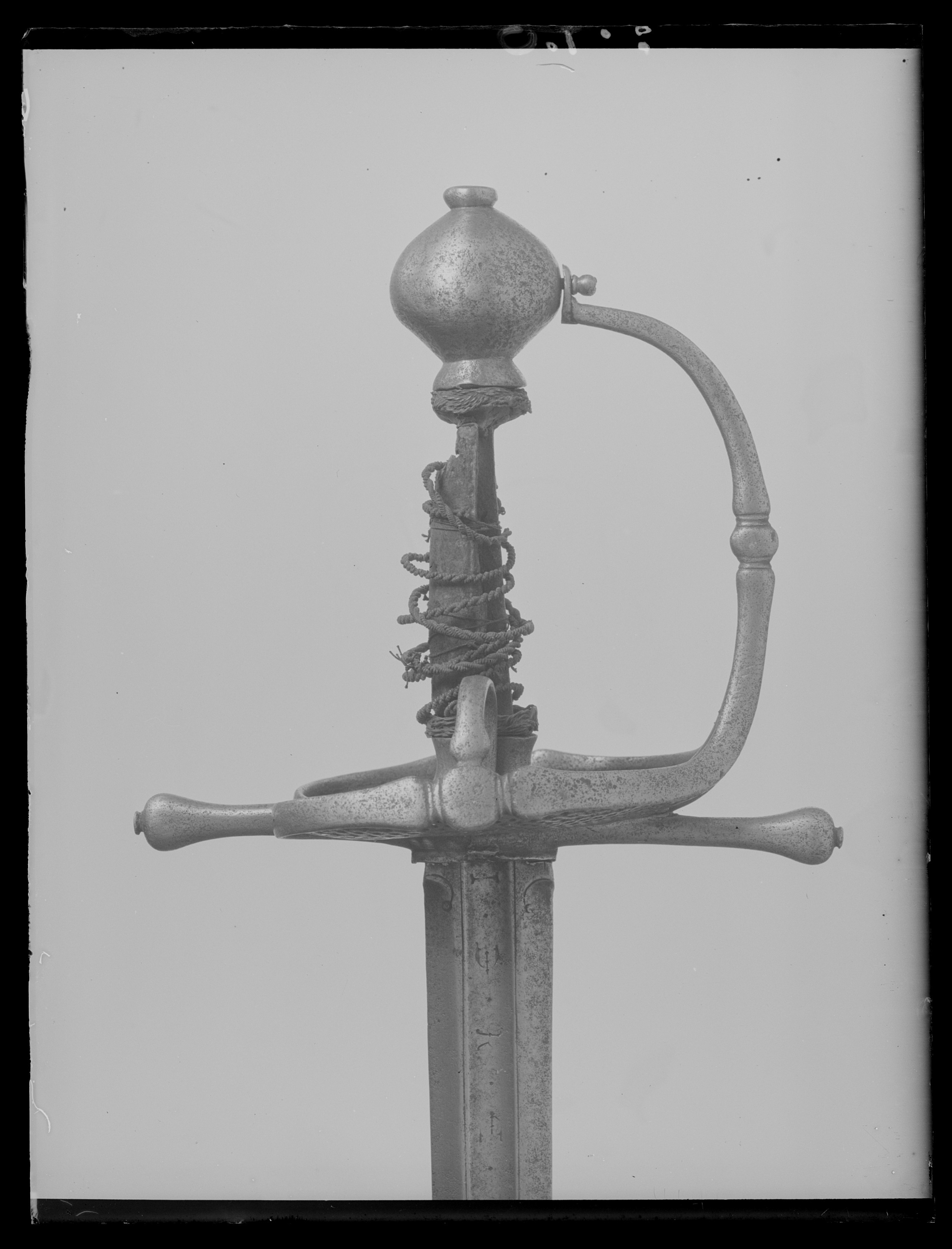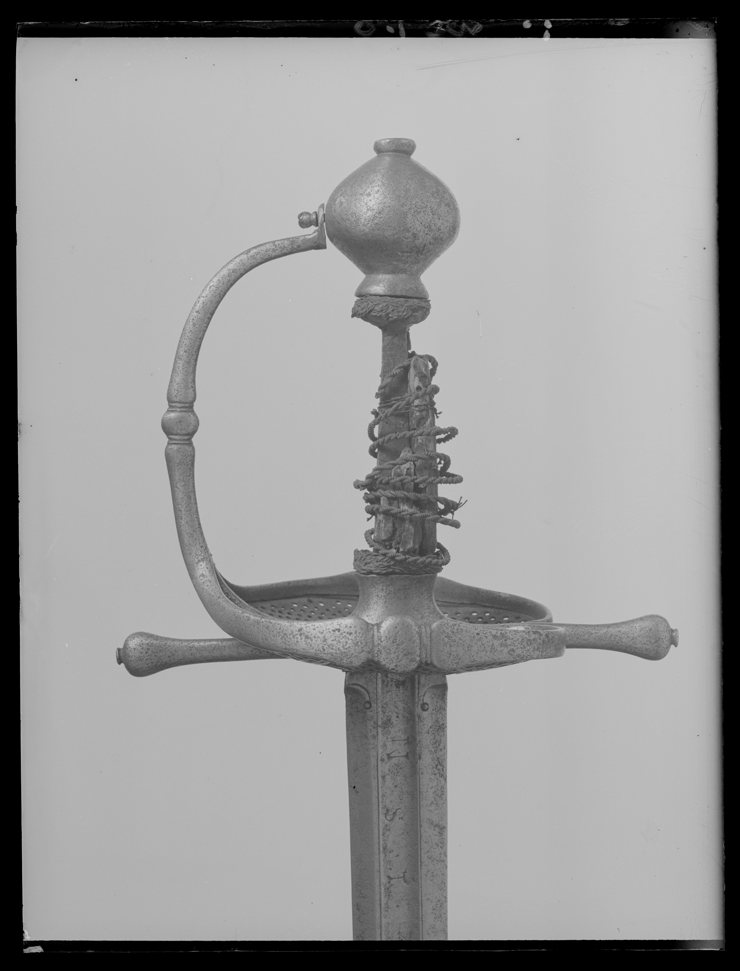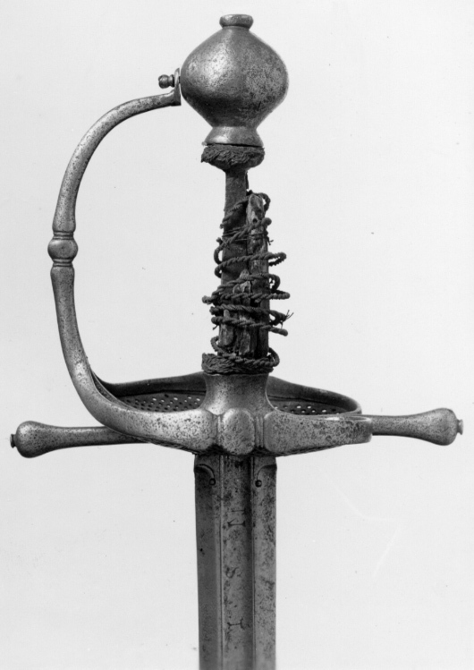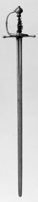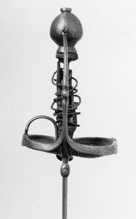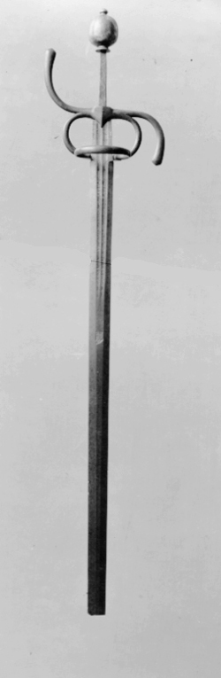 Fäste av stål. Knapp slät, ojämnt klotformig. Handbygel slät med tvärsnitt av smalt oval form, överdelen fäst vid knappens mitt med en skruv genom handbygelns uppvikta fot, mittpartiet med en tvärställd, oval knapp mellan två något indragna bårder. Nedtill övergår handbygeln på ut- och insidan i två stora parerplåtar, tillsammans asymmetriskt hjärtformiga (inre parerplåten mindre än den yttre) och med kraftigt förstärka kanter, som framtill ansluter till handbygelns nederdel. Kanternas mitt med en tvärställd, oval knapp. Parerplåtarna med genombrutet ytmönster, som, sett från utsidan har formen av tvinnade, smala band med mellanliggande, runda hål. Mittpartiet av yttre parerlåten utfylles av ett likaledes genombrutet spegelmonogram (AAJ?). På insidan mellan krysset och mitten av parerplåtens kant en bågformig tumbygel. Parerstänger raka, tämligen kraftiga och släta med droppformiga ytterändar, avslutade med små platta, ovala knappar. Av kavelns trästomme och lindning med ståltråd återstår endast framgent. Klingan, rak, tvåeggad och slipad med sexsidigt tvärsnitt, har ursprungligen haft en ca 40 mm lång ricasso, som vid klingans montering i fästet nedslipats och varav återstår ca 5 mm, synligt vid klingbasen. Starka delen med en synlig, ca 220 mm lång, tämligen bred hålkäl (som fortsätter in under krysset på den till tångens nederdel förändrade, ursprungliga ricasson). I hålkälen instansat på utsidan:"(M nu innanför krysset)VNSTEN", på insidan: "(A ej synligt) NDREIS". Udden avkortad och slipad med runduddad spets.