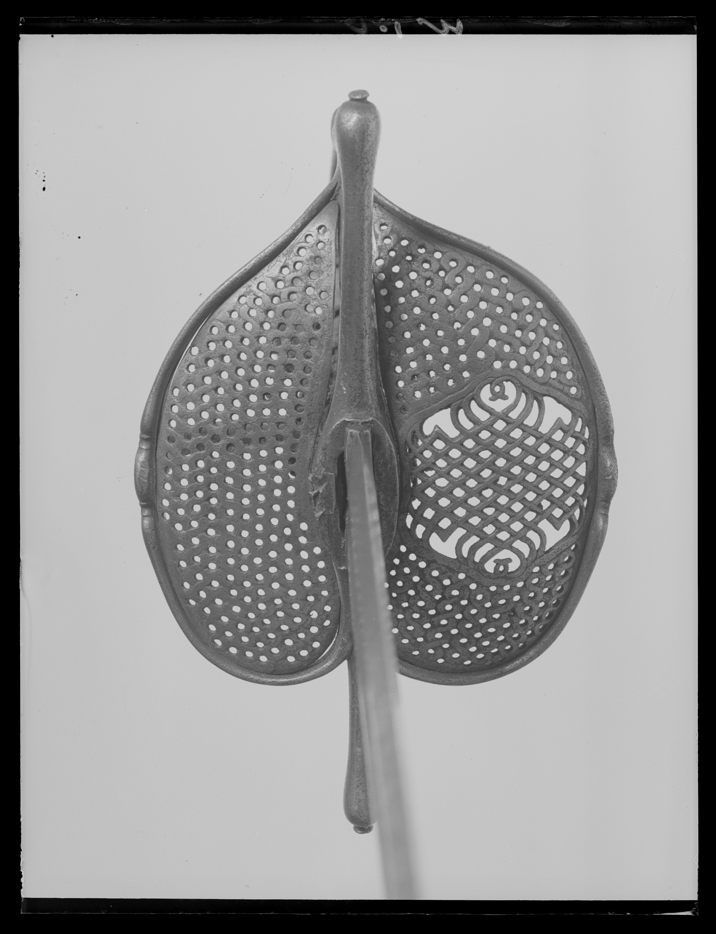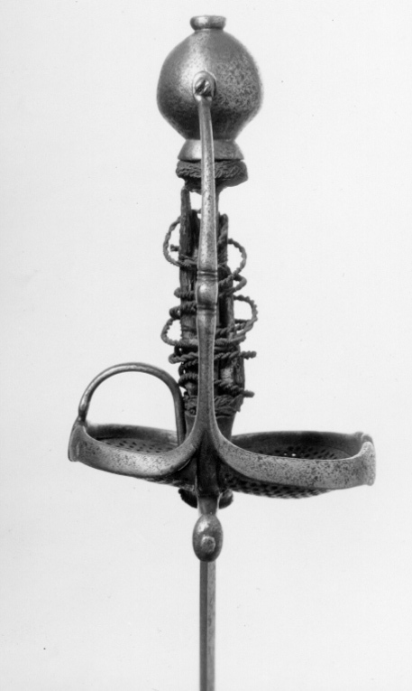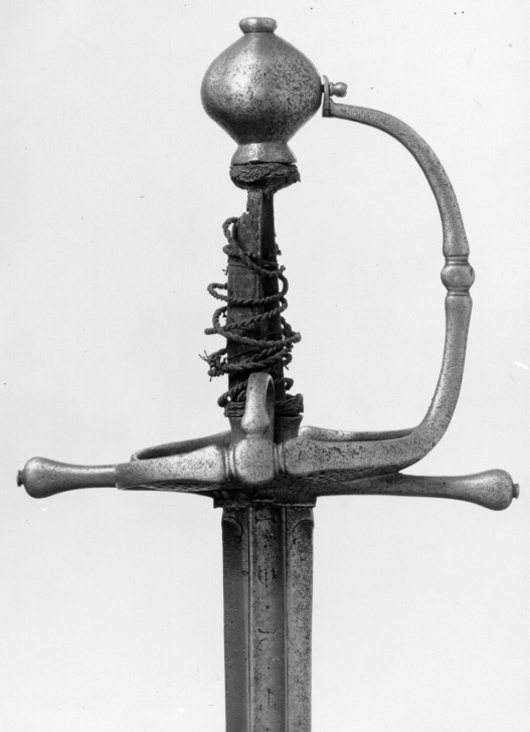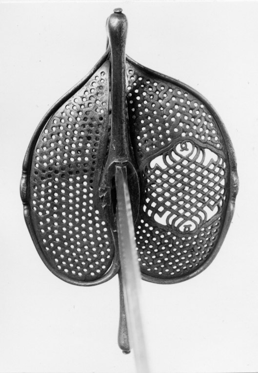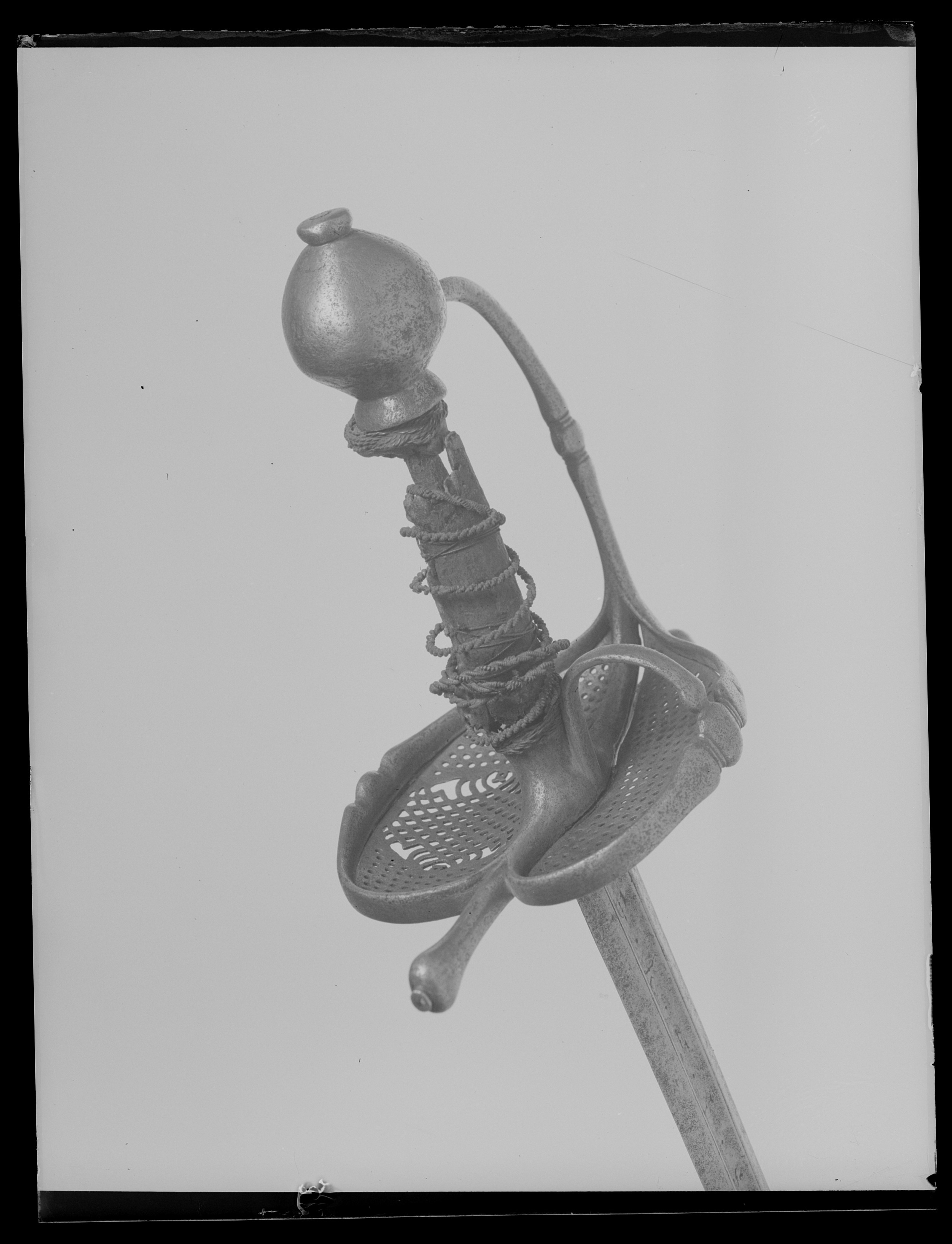 Fäste av stål. Knapp slät, ojämnt klotformig. Handbygel slät med tvärsnitt av smalt oval form, överdelen fäst vid knappens mitt med en skruv genom handbygelns uppvikta fot, mittpartiet med en tvärställd, oval knapp mellan två något indragna bårder. Nedtill övergår handbygeln på ut- och insidan i två stora parerplåtar, tillsammans asymmetriskt hjärtformiga (inre parerplåten mindre än den yttre) och med kraftigt förstärka kanter, som framtill ansluter till handbygelns nederdel. Kanternas mitt med en tvärställd, oval knapp. Parerplåtarna med genombrutet ytmönster, som, sett från utsidan har formen av tvinnade, smala band med mellanliggande, runda hål. Mittpartiet av yttre parerlåten utfylles av ett likaledes genombrutet spegelmonogram (AAJ?). På insidan mellan krysset och mitten av parerplåtens kant en bågformig tumbygel. Parerstänger raka, tämligen kraftiga och släta med droppformiga ytterändar, avslutade med små platta, ovala knappar. Av kavelns trästomme och lindning med ståltråd återstår endast framgent. Klingan, rak, tvåeggad och slipad med sexsidigt tvärsnitt, har ursprungligen haft en ca 40 mm lång ricasso, som vid klingans montering i fästet nedslipats och varav återstår ca 5 mm, synligt vid klingbasen. Starka delen med en synlig, ca 220 mm lång, tämligen bred hålkäl (som fortsätter in under krysset på den till tångens nederdel förändrade, ursprungliga ricasson). I hålkälen instansat på utsidan:"(M nu innanför krysset)VNSTEN", på insidan: "(A ej synligt) NDREIS". Udden avkortad och slipad med runduddad spets.