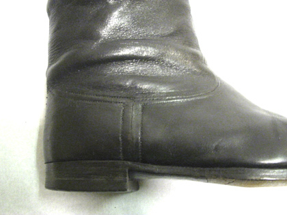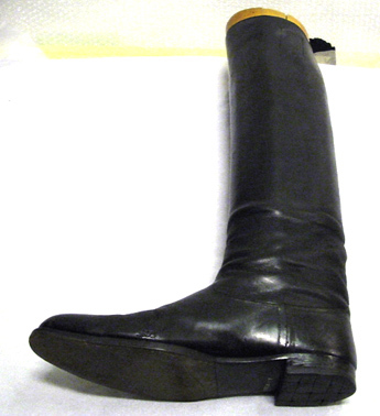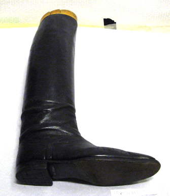 Stöveln sydd av framkappa,bakkappa och skaft.Framkappa och bakkappa med hopspannade sömmar som löper från en sida till den andra Bakkappa med söm mittbak Utvändigt svart (lackerat?) kalvskinn (?.) Skaftet tredubbelt, i mitten brunt skinn, foder av ursprungligen vitt skinn. Invändigt i skaftet två stroppar av brunt skinn. Lädersula med gummiklack med inskurna rutor, sex spikhål.