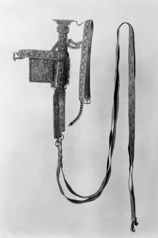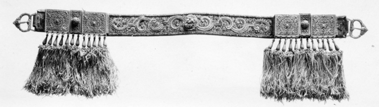 Huvudlag av röda 25 mm breda läderremmar på utsidan klädda med röd sammet med yttäckande silverbroderier och paljetter. Beslag av silver. Vid nackremmens och pannremmens fäste i sidostyckena ett runt genombrutet beslag med välvt mittparti, krönt av en blomma. Nackrem med stort blomformigt mittparti. Nackrem och käkrem förbundna med varandra via kedjor, fästa i mittpartiet samt på var sida om detta. Delad pannrem med två ändbeslag i mitten sammanbunda med en 80 mm lång kedja. Skygglappar kantade med band med oklippt frans. På sidostyckenas mittparti påträtt en hylsa över remmarna kantad med silverfrans som samlats i tofsar på sidorna. Vid hylsans nederkant ändbeslag med berlock samt under detta slät rektangulär sölja. Sidostyckena nedtill med långt genombrutet beslag.