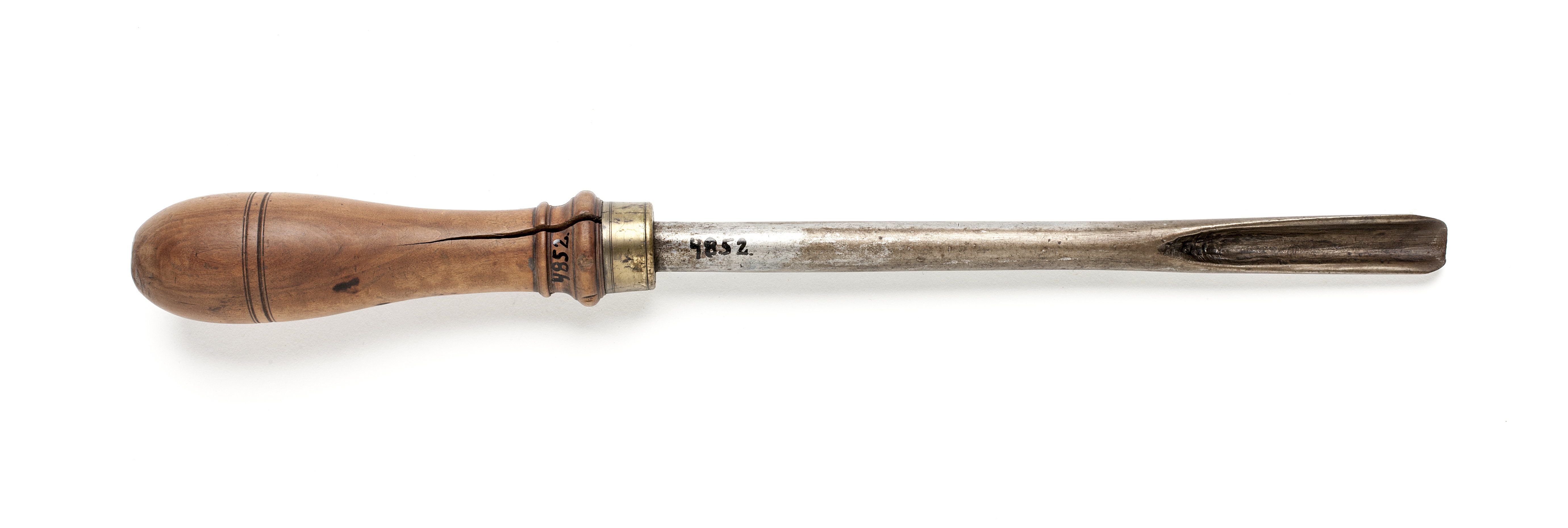 Rund klinga. Svarvat skaft av päronträ med två vulster nedtill ("skoklostertyp"). Mässingsring. Stämpel i skaftets ände vid fästet: otydliga siffror med stansar nr 5375.