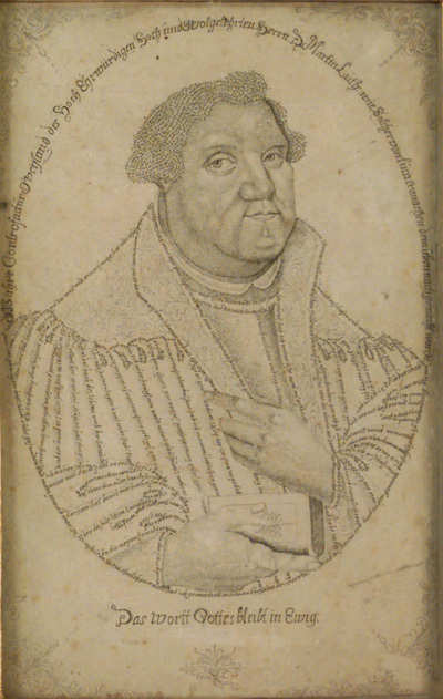 Koppartryck på papper, klistrat på trä. Hår och delar av klädedräkten uppbyggd av ordslingor ( tyska) beskrivande Luther levnadshistoria i jagform. Ovalen text på tyska som bl a säger att Lukas Cranach har gjort förlagan. Hörnen dekorerade med bladslingor. Profilerad träram i svart och guld, listens bredd 23 mm.