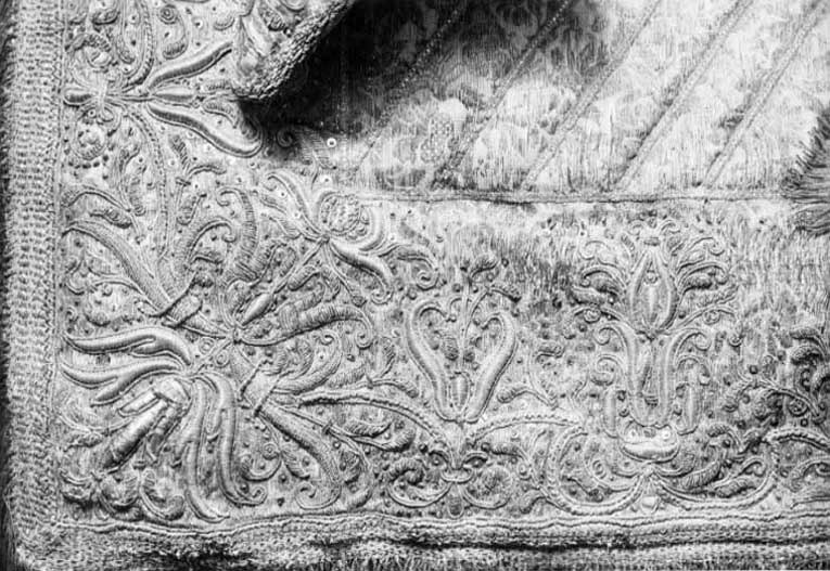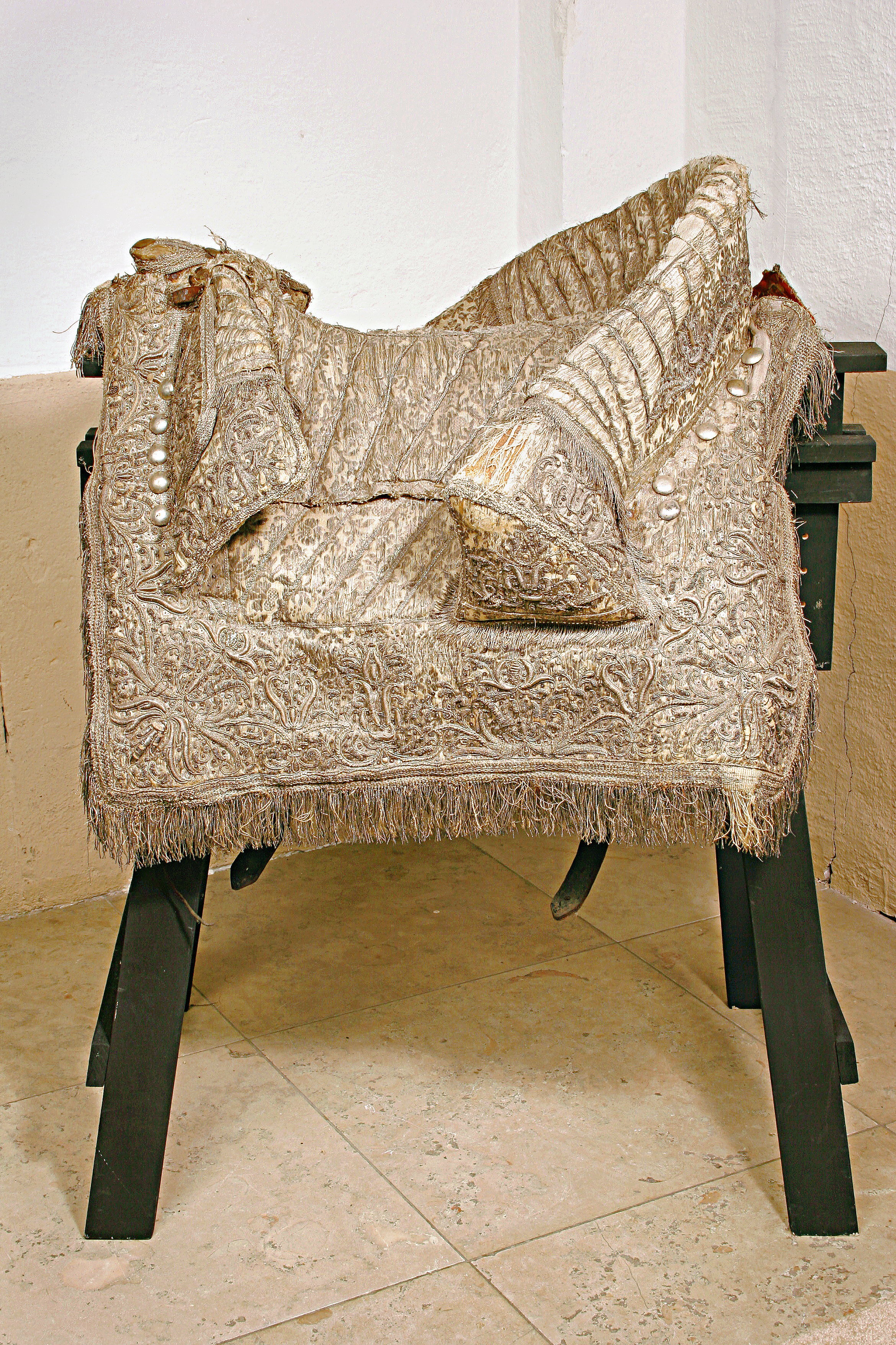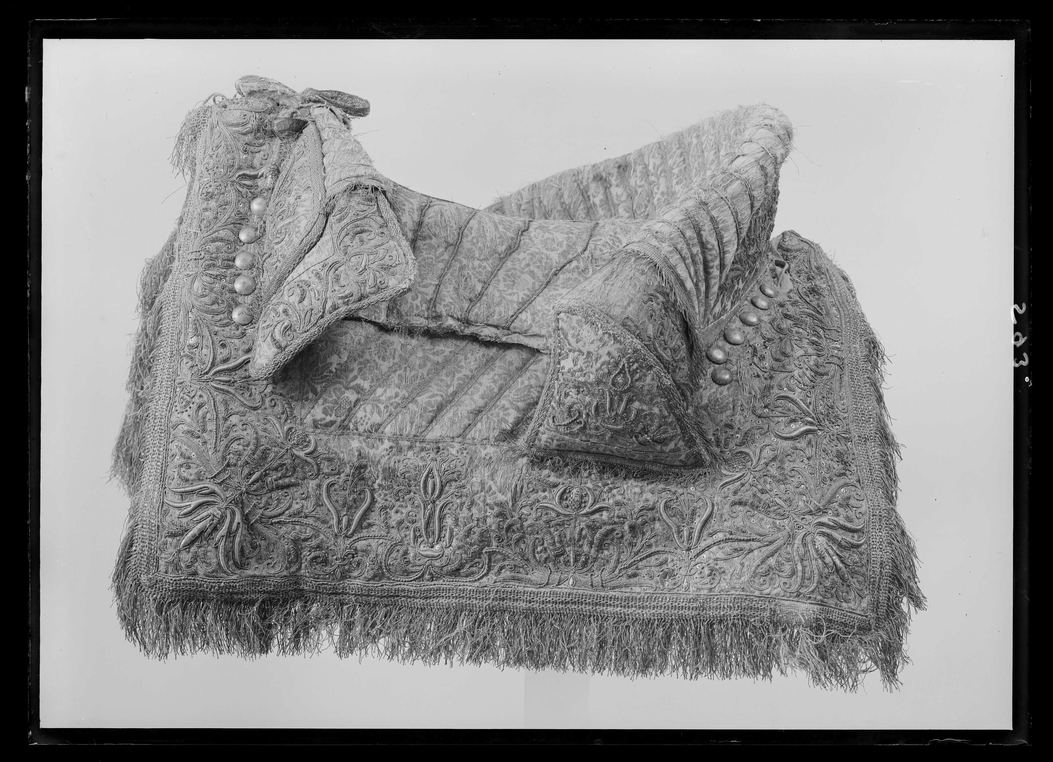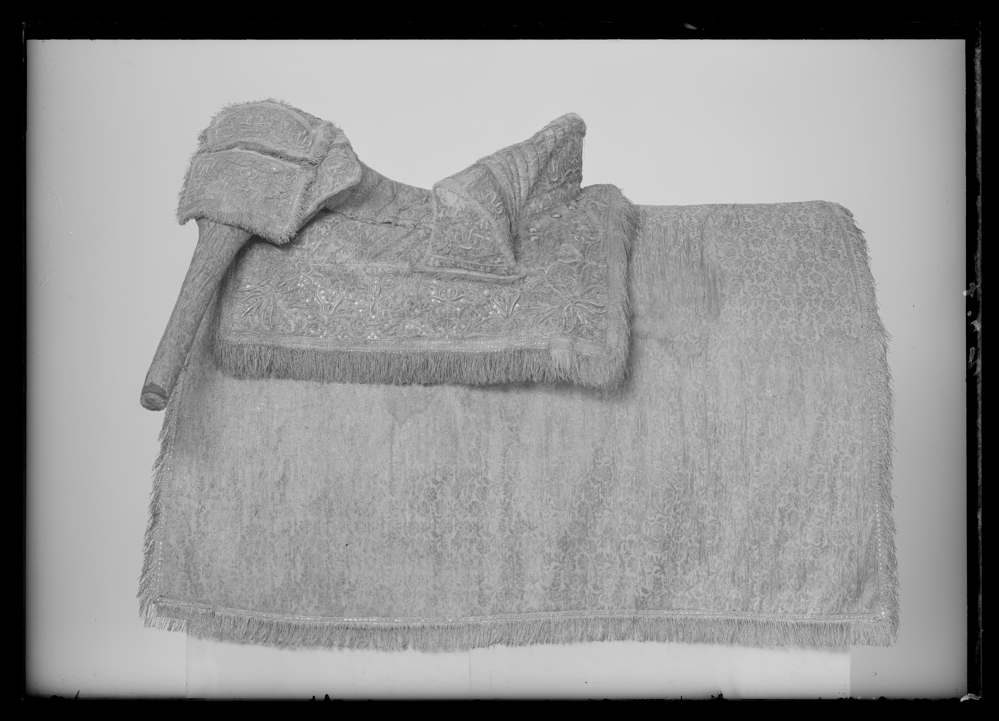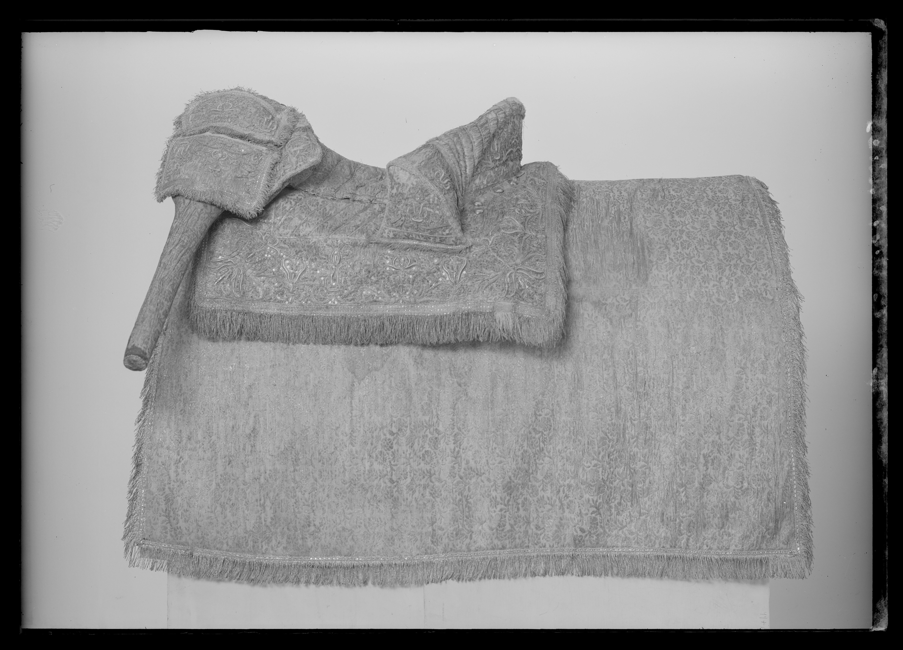 Sadel av silverbrokad med påstickade sneda silverband i sitsen. Delad frambom 120 mm hög och 490 mm bred. Bakbom 570mm bred 140 mm hög På bommarnas insidor påstickade smala silverband, Framför frambommen 5 + 6 stora försilvrade mässingstennlikor. Bakom bakbommen 5 + 6 likadana tennlikor. Rektangulära kappor kantade med silverfrans samt med yttäckande reliefbroderi i form av rankor och blommor, så även på bommarnas utsidor, Kapporna fodrade med rödbrunt läder. Bom klädd med tuskaftad linne. Fyra remmar för sadelgjord, rektangulära krampor för stigläder. Framtill två söljor för för-bygel, baktill sölja för svansrem.