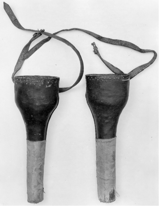 Pistolhölster av svart läder med skoning av blått damast nedtill. Upptill utmed kanten utskuret två breda vertikala hällor. I hällorna fästat en 20 mm bred rem med spänne.