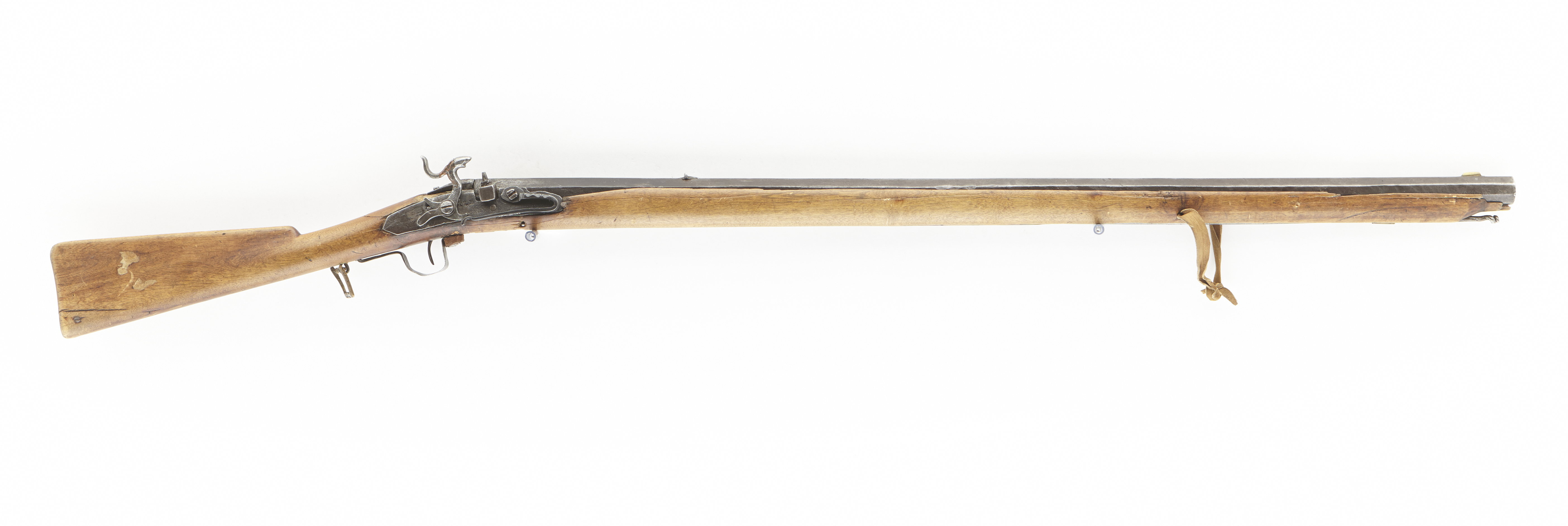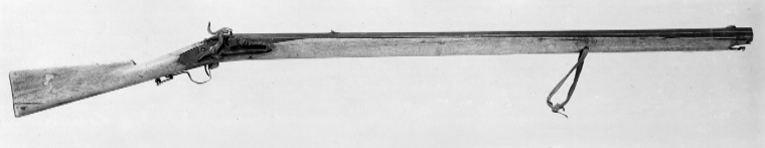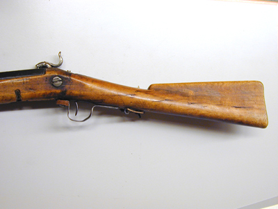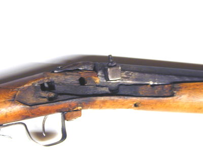 Åttsidig, åttaräfflad, brunerad (?) pipa med något rundade kanter, de tre övre faserna filade. Böjt, baktill tvärt avskuret svansskruvblad, kanterna närmast pipbasen skadade. Rörlig, kubisk kagge med tändhattsnippel. Riktmedel: Inlaxat ståndsikte av stål, något snett inslaget. Fastlött stolpkorn av mässing. Fästning: Ett häfte, pipan fäst med krysskruv underifrån samt en smal spik som är inslagen snett genom framstocken. Pipan har ursprungligen också varit fäst med pipband runt mynningen. Slagsnapplås av stål, plant låsbleck med två gånger stämplad signering: "I L B", en gång framför hanen, en gång i slagfjäderns bukt. Smäcker hane med S-formigt svängd kropp, något harmynt slaghuvud med C-formigt uppåtsvängt grepp (avbrutet och lött med kopparlod). Invändigt en tunn stångfjäder med stångtand som går ut genom låsblecket, på fjädern trätt en rörlig L-formig del med den inåtriktade delen påverkad av avtryckaren. Fästning: En låsskruv. Svagt böjd, smal avtryckare. Smäcker helstock av lätt träslag (al?), hela vägen öppen laddstocksnot, kolv med droppformigt tvärsnitt, rak kolvrygg. I pipnoten inpassat två rörkor av mässing. Bandformig varbygel av stål, fäst genom främre armen med krysskruven. Bakre armen smal och i vinkel inslagen i kolven. Igenom framstocken framför den bakre rörkan ett tvärgående hål. 270 mm från framänden ytterligare ett hål och däri fäste en läderrem knuten i ring. Bakom varbygelns bakre spets inslaget en bygel och däri fäst ett kvadratiskt spänne av mässing, tornen saknas. Tillbehör: Laddstock av stål, framtill omvriden i spiral.