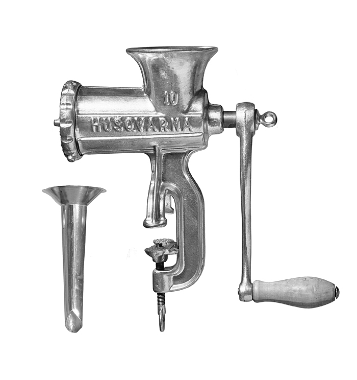 KÖTTKVARN med munstycke (korvrör; till korvstoppning) Av järn, gjuten och förtent. Stommen bestående av en liggande cylindrisk tub, på vars vänstra ände ett skivformigt munstycke, genombrutet med runda hål samt fasthållet av en på tuben gängad ring med rätvinkligt tvärsnitt samt med tvärgående kälar och utstående runda nabbar. Inuti tuben en genom denna gående axel, varpå en hög s. k. evighetsgänga, som på ytteränden är försedd med en korsformig fyrbladig kniv, fäst på en fyrsidig tapp på axelns ytterände, änden utanför denna rund, rörlig i ett lager på munstyckets mitt; på axelns motsatta ände en S-formad vev med ovalt tvärsnitt samt på yttre änden ett rakt utstående, päronformigt handtag av lönn, svarvat samt rörligt på en tånge, fastnitad i armens ytterände. Veven fäst vid axeln medelst en från ytteränden i axeln gående skruv med liggande oval fingerögla. Ovanpå tuben en stor oval tratt, vari köttet inmatas och sedan medelst axelns evighetsgänga pressas mot kniven och munstycket i axelns ände. På tubens undersida en ställning för fastskruvning vid bord eller bänk samt bestående av en lång båge, på vars nedre ände en genom denna gående skruv med liggande 8-formig fingerögla samt på övre änden ett gripstycke med rundat utvidgade ändar; på bågens övre ände en gripbåge med platta ändar. Stomme, höjd: 27.2 cm.; bredd: 24,5 cm. Vevarm, längd: 21,7 cm. Munstycke (korvrör) till korvstoppning. Av bleckplåt. Bestående av ett koniskt rör med snett avskuren ytterända samt med en längdgående fals. Längd: 16,5 cm.; diameter: 3 cm. Tratt, diameter: 7,3 cm. Svensk tillverkning; Husqvarna Vapenfabriks AB. .