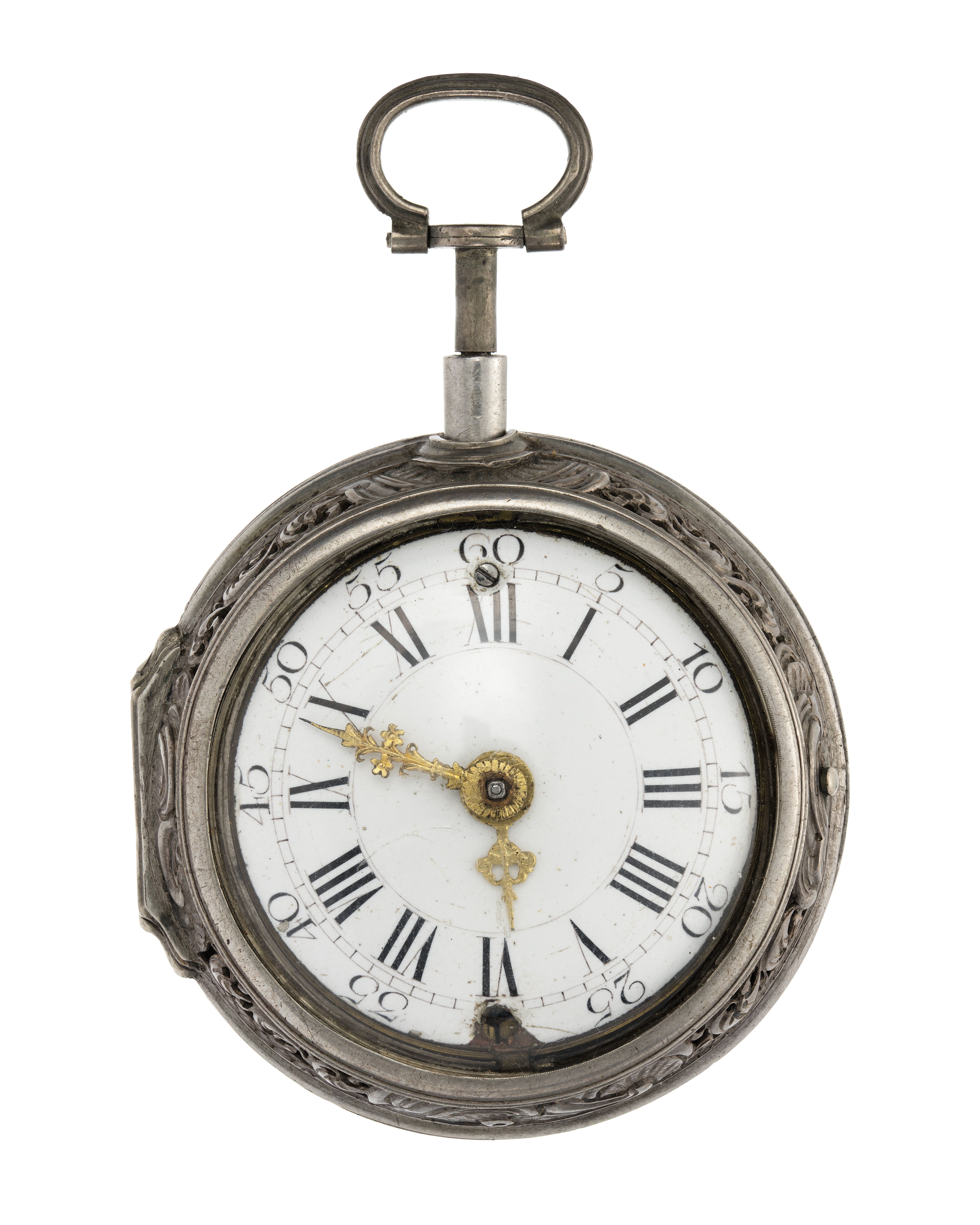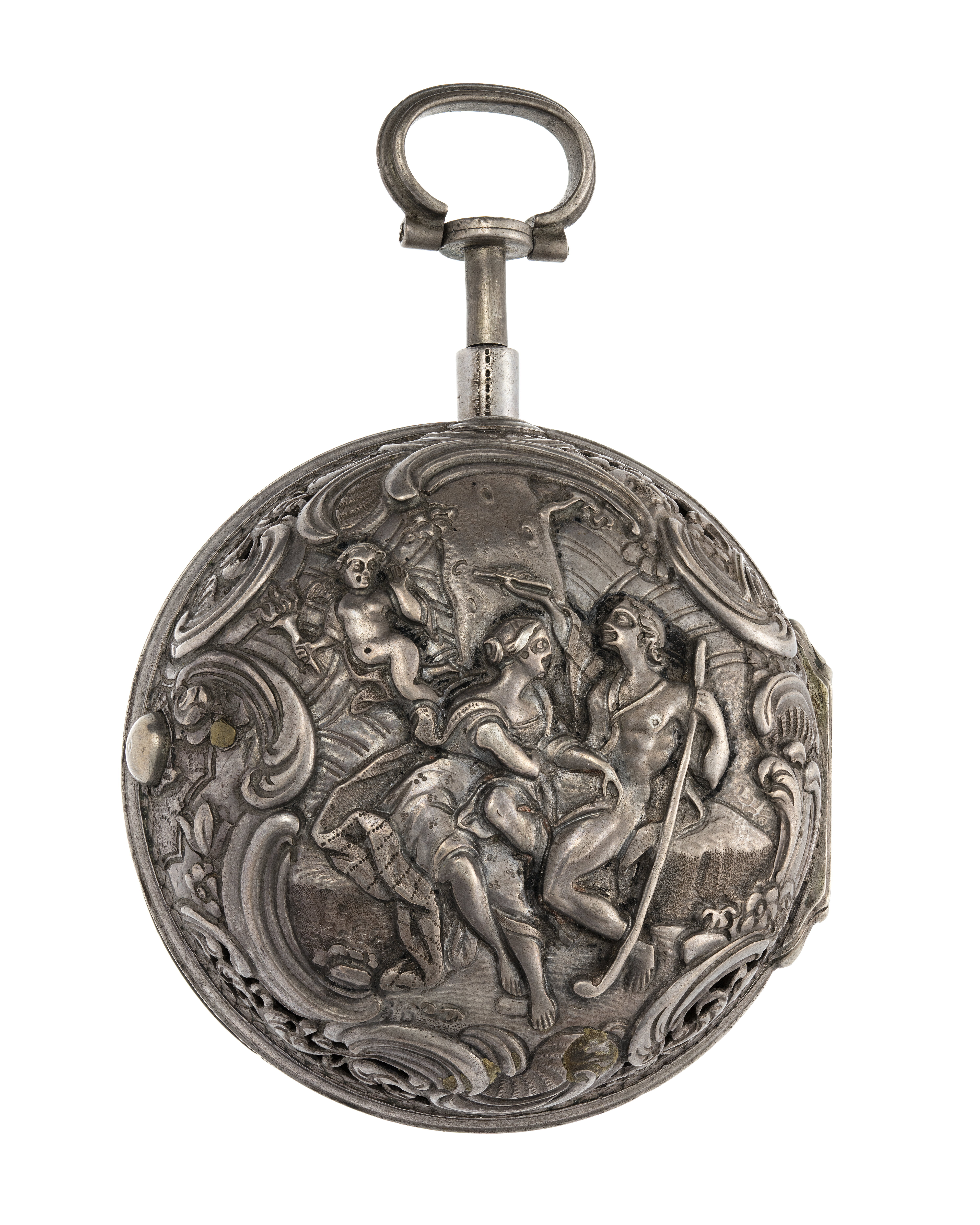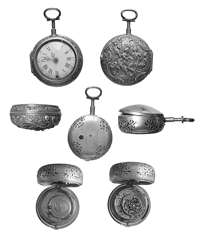 Boett av silver, urtavla av emalj, verk med s. k. spindelgång och slagverk. Dekor i genombrutet mönster. Bottenskal nästan plant, slätt, med hög vulstformad ytterkant, vari fyra triangulära genombrutna fält med symmetriska bladorneringar. Vid ena sidan ett stycke från kanten ett hål för fjädertappen. Glasram slät, med starkt konvext glas, scharneret vid övre kanten, vid den motsatta ett nagelfäste. Bygel liggande oval, med platt insida och profilerad utsida. Bygelfästet utgöres av ett cylindriskt rör, vari en skjutbar rundstavig stolpe, på dennas övre ända en rund platt knopp, vari bygeln är fäst; stolpen förenad med slagverket. Urtavla vit, med svarta romerska tim - och arabiska minutsiffror, som läsas inifrån, de senare angivna vid varje timsiffra. Mellan sifferringarna minutstreck mellan två fina linjer, innanför timsiffrorna en dylik linje. Visare två, av förgylld brons. Timvisaren genombruten på mitten, med två symmetriska bågornament, från vilka utgår en kort spets; minutvisaren med hel stam, från vilken parvis utgå större och mindre spetsar och bågar jämte ett par fembladiga blommor, ytterst en smal spets. Verk med rund oroklove av förgylld mässing, genombruten, med om varandra gående bladslingor, i mitten en liten rund skiva ( s. k. motstål ) av stål, fäst med två skruvar, i skivans mitt en liten sten (defekt ). Ruckartavla av mässing, vridbar, på denna graverat arabiska siffror, 1 - 6, däromkring en indelning av tvärstreck mellan två smala ränder. Slagverk (defekt) slående heltimmar och de tre första kvarterna, då den i bygelfästet befintliga skruven inskjutes. Ljudet framkallas genom två i verkets kant sittande hammare av stål, vilka slå på en i bottenskalet befintlig skål av klockmetall, fäst vid skalet med en blåanlöpt skruv. Verket på samma scharner som glasramen, vid motsatta kanten en fjäderhake, som saknas. Över verket en skyddskapsel av förgylld mässing, på vars översida en rund upphöjning för orokloven, dessutom vid ena kanten tre hål, två runda för fjäder - och ruckartappar, det tredje avlångt, konturerat, för siffrorna på ruckartavlan, vid ömse ändar av detta graverat, till vänster F (Fast), till höger S(Slow). I kapselns sidokant hål för hamrarna. Kapseln fasthållen av två från verket genom översidan uppskjutande tappar, stängda av en bågformad smal skena av stål, något skjutbar på en i mitten sittande tapp. Skyddsboett: Af silver. Dekor dels driven och ciselerad, dels i genombrutet mönster. På bottenskalet i mitten en mytologisk figurscen, <<EOS och KEFALOS >> : Till vänster en kvinna ( EOS), sittande på en sten på en på denna utbredd mantel samt vänd åt höger, med lågt uppsatt hår och djupt urringad, halvlång klänning med klöverbladsliknande prickar. Till höger på en annan sten en sittande naken man ( KEFALOS ), vänd åt vänster, i vänstra handen en stav med böjd nederända, stödd mot marken, i högra handen en kniv, med vilken han ristat i en grov trädstam. Bakom kvinnan till vänster en svävande putto, hållande en brinnande fackla i högra handen. Nedanför kvinnan till vänster signering; J B. Det hela inom ett ramverk av rokokobågar och musselornament; utanför ramverket fyra genombrutna fält med en akantusbladranka. Glasramen med fyra genombrutna fält som de på bottenskalet, mellan dessa båg- och musselornament; kring övre kanten en profilerad list. Kring bottenskalets övre och glasramens nedre kant en snett utstående profilerad list, vilka lister sammanfällda bilda en skarpt kölad rygg. Scharneret vid vänstra kanten, vid den motsatta en fjäderhake med en genom bottenskalet utskjutande tryckknopp, i glasramen ett litet knoppformat nagelfäste.