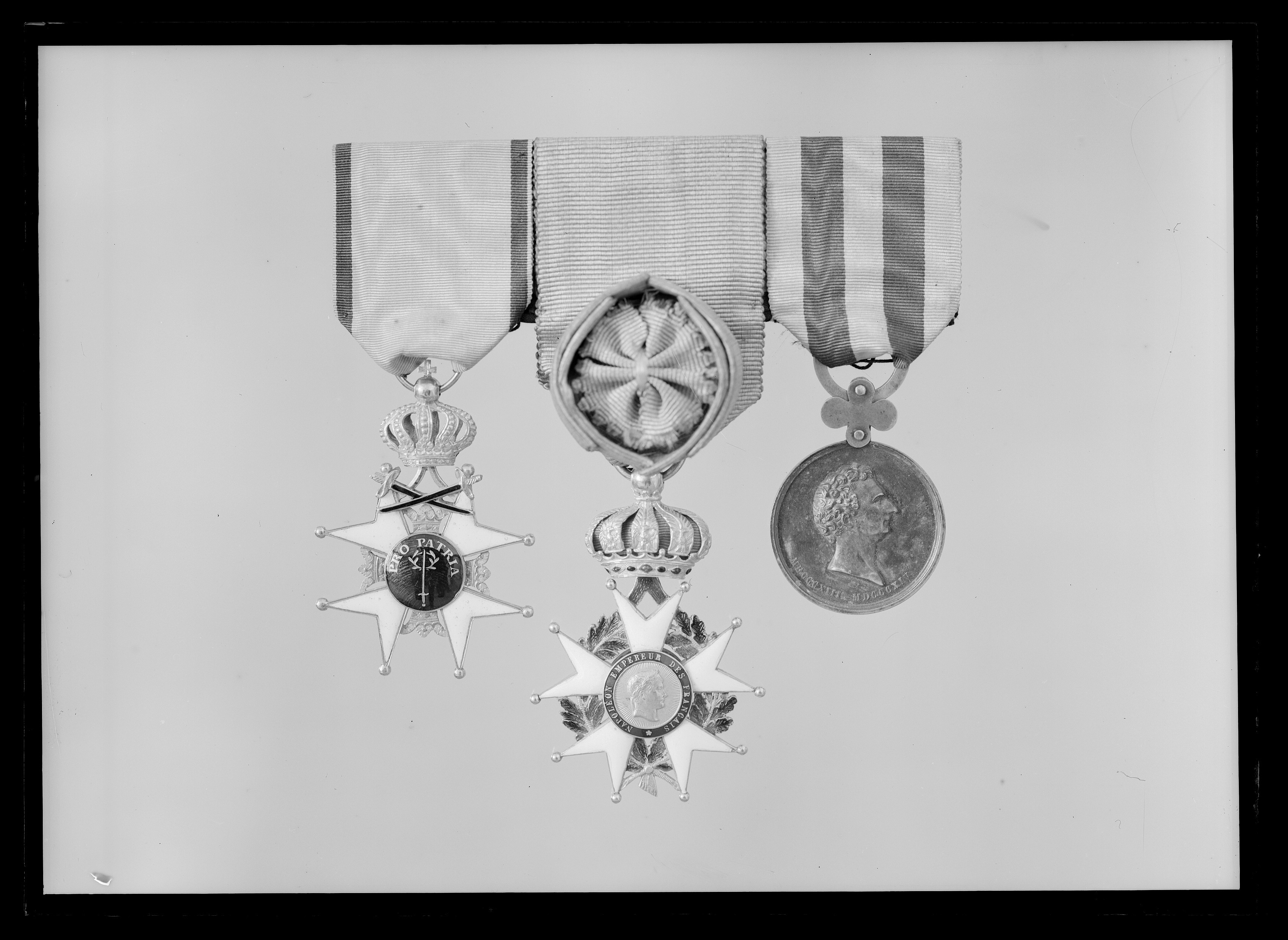 Vitemaljerat, liggande malteserkors av guld, kulor på spetsarna, mellan korsarmarna kronor. Blåemaljerad medaljong med svärd och tre kronor av guld, frånsidans medaljong med svärd, lagerkrans och guldtext: "PRO PATRIA". Mellan de övre korsarmarnas spetsar ett uppåtgående band, därpå fäst med scharner en kunglig krona av guld. Gult band av sidenmoaré, b: 36 mm, blå kantränder.
