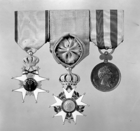 Svärdsordens riddarkors, modell från 1800-talets början, monterat på spänne, nr 558, tillsammans med nr 556 och 557.