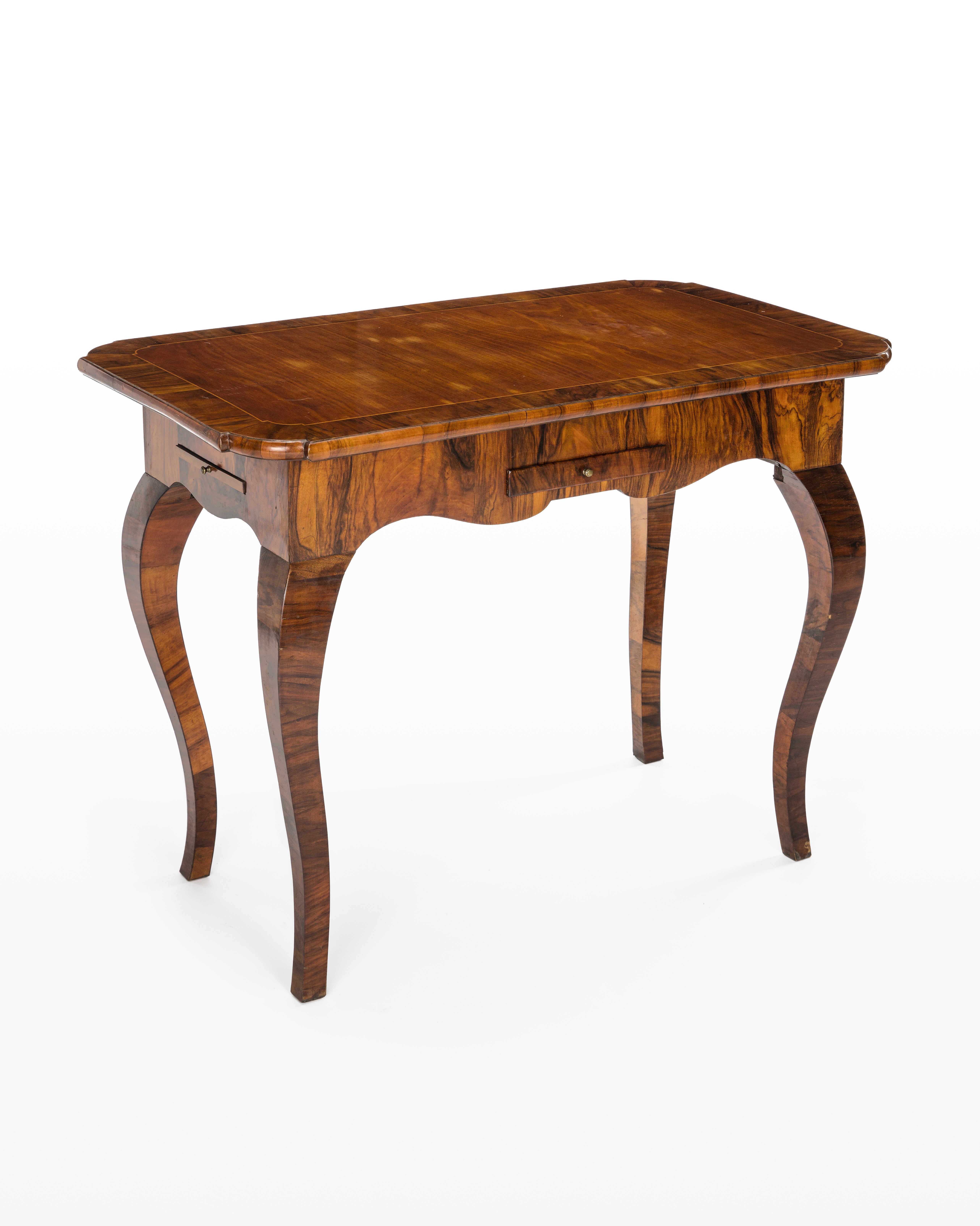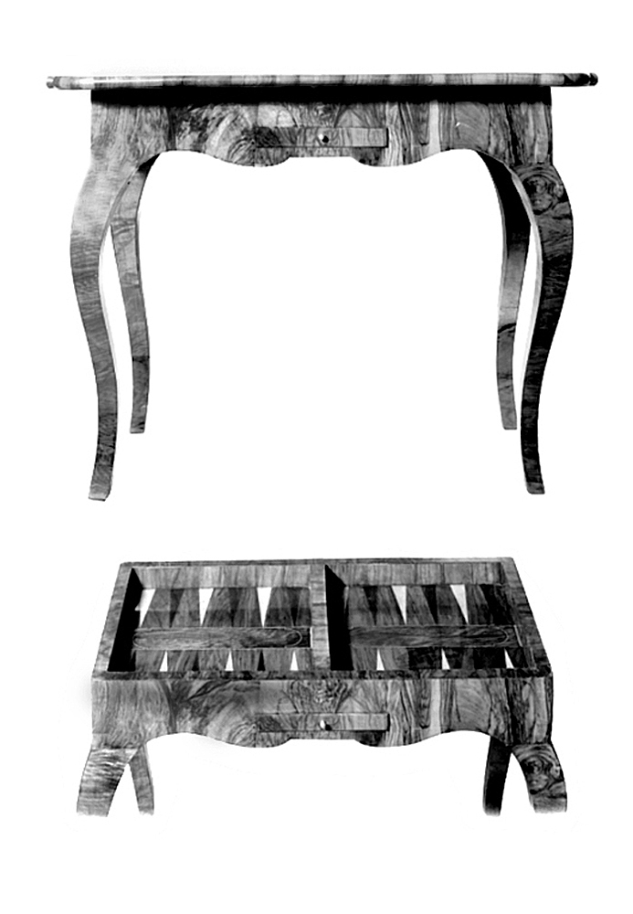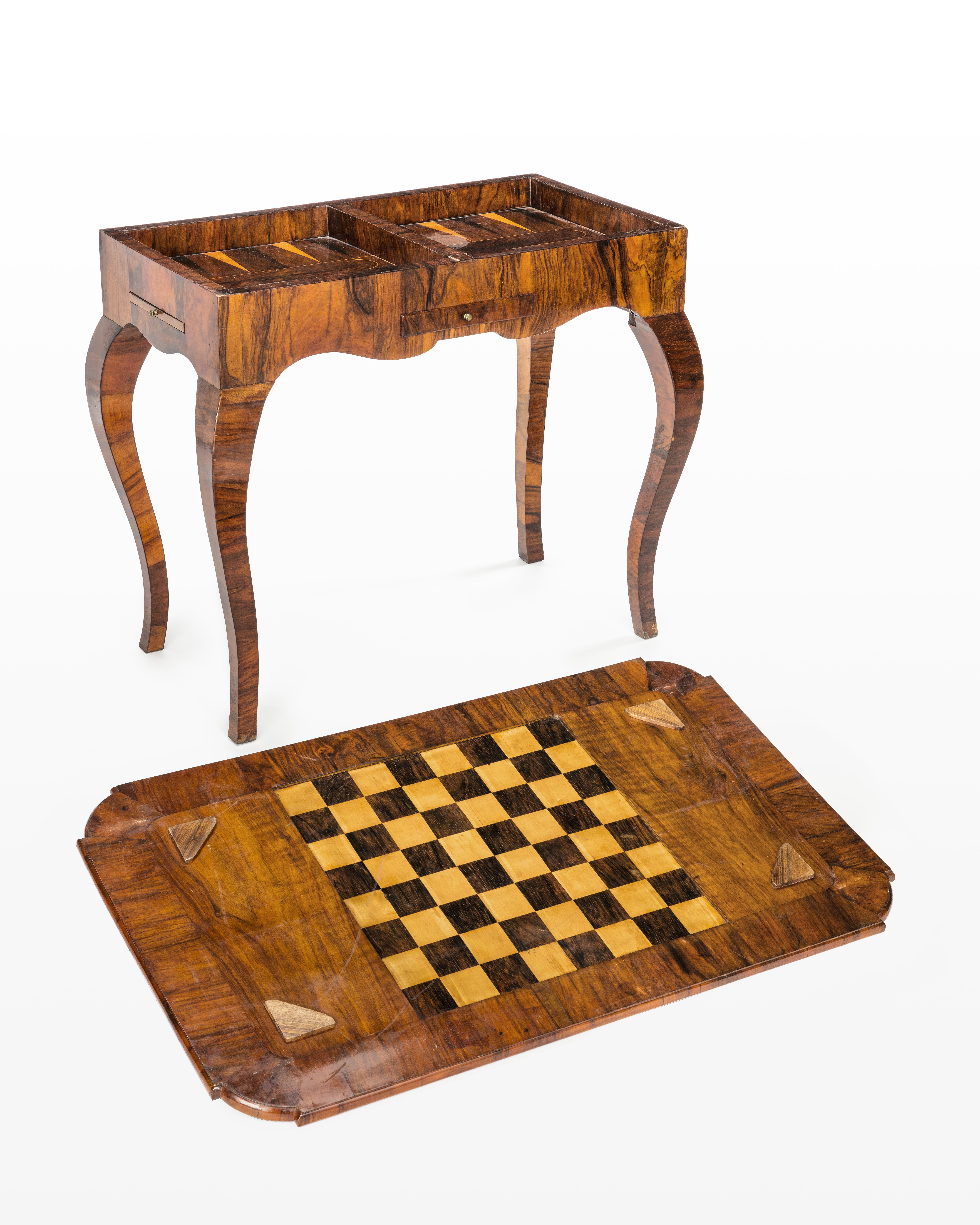 SPELBORD (Schack- och brädspelsbord). Rektangulärt med lös skiva. Av furu fanerat med polerat valnöt, invändigt med inslag av jakaranda och lönn. Svenskt arbete från 1700-talet. Inköpt av Wilhelmina von Hallwyl 1891 hos antikhandlare Carl August af Schmidt för 30 kr.