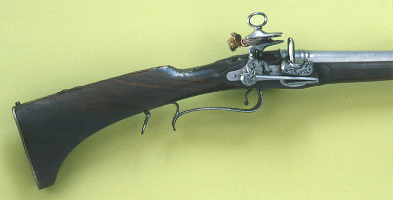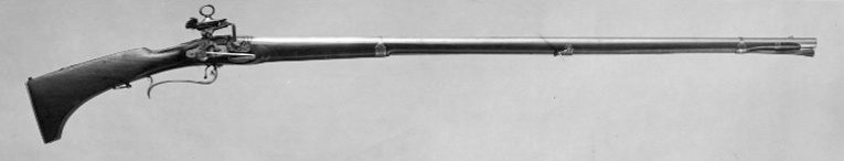 Rund, slätborrad pipa. Vid pipbasen på övre halvan en smal, spetsig vulst, därframför en lägre, smalare ring samt en grupp om tre ringar. Svagt böjt svansskruvblad med rundad ände. Riktmedel: Filad siktskåra i den höga vulsten vid pipbasen, smalt korn av silver(?). Fästning: Pipan fäst med krysskruv underifrån samt tre pipband av mässing, bredare underdel med bladdekor, smalt band över pipan, nitning på ena sidan. Snapplås alla catalana med plant låsbleck. Hane med kraftiga, rektangulära käkar, rundade ändar. Ovalt,ringformigt käkskruvhuvud. Hanstudel med rankdekor i relief mot mörk bakgrund. Rektangulär fängpanna med rundad ände och undersida. Batteri med räfflat eldstål, rygg med brett fasade kanter, enkel dekor. Välvt fängpannelock. Oval skärm framför batterifjädern, rankdekor mot mörk bakgrund. Slagfjäder med fasade kanter, fjädern trycker på hanhälen. Fästning: Två låsskruvar. Böjd avtryckare med upprullad ände. Avtryckarbleck med graverad dekor, bladformig bakre ände. Halvstock av mörkbrunt trä, kolv av katalansk typ med rektangulärt tvärsnitt, snidad dekor runt svansskruvbladet. Beslag av mässing. Bakplåt med rektangulär flik på kolvryggen, graverade bladrankor. På kolvänden en kolvlåda med fjäderbelastat lock, infällt i bakplåten, cylindrisk tryckknapp av stål på kolvryggen, innanför locket två hål, ett 65 mm och ett 170 mm djupt. Längs hela kolvryggen ett mässingsband, dekorerat med en bladstav, på kolvhalsen avslutas bandet med ett flikigt, genombrutet blad, allt fäst med mässingsspik. Sidbleck fäst med mässingsspik, graverad trofégrupp. Runt framstocken ett 10 mm brett mässingsband med linjedekor, 40 mm från änden. Varbygel av stål, lång, s-formigt svängd bygel med graverad trofégrupp vid framstolpen. Kort, bred främre arm med ett flikigt, genombrutet blad. Omvänt c-formig, smal bakre stolpe, smal, kort bakre arm med avslutning i form av ett flikigt blad. Två rembyglar, den bakre på varbygelns bakre arm, den främre på mellanpipbandet. Tillbehör: Laddstock av ljust trä, l: 1030 mm, framtill en konisk hornskoning, l: 45 mm.
