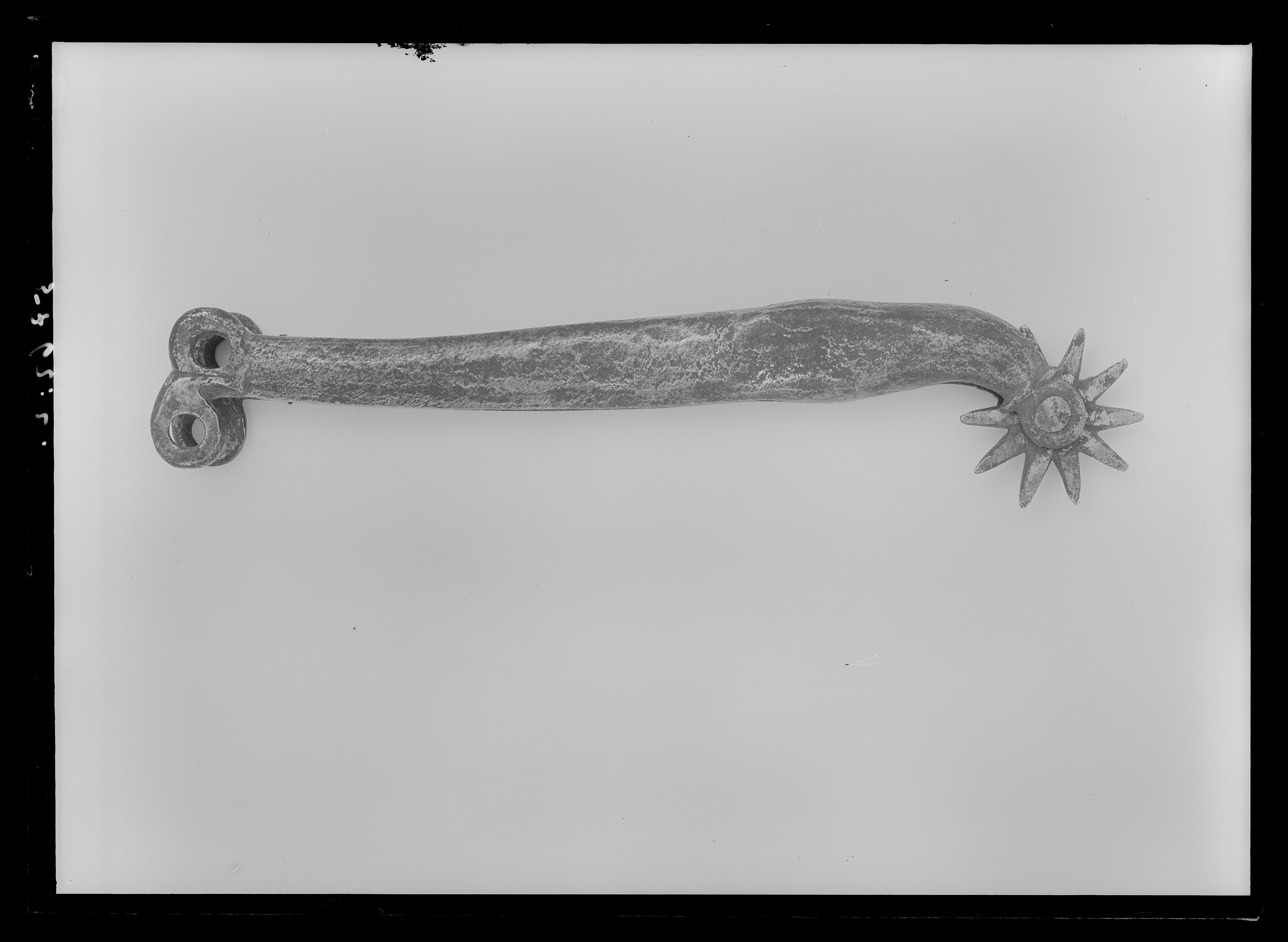 Sporre av stål. Raka skänklar, plana med böjda ögleformade ytterändar med två öglor. Skänklarna går ihop i den böjda sporrhalsen. Stjärnformig klinga av stål med 10 taggar.