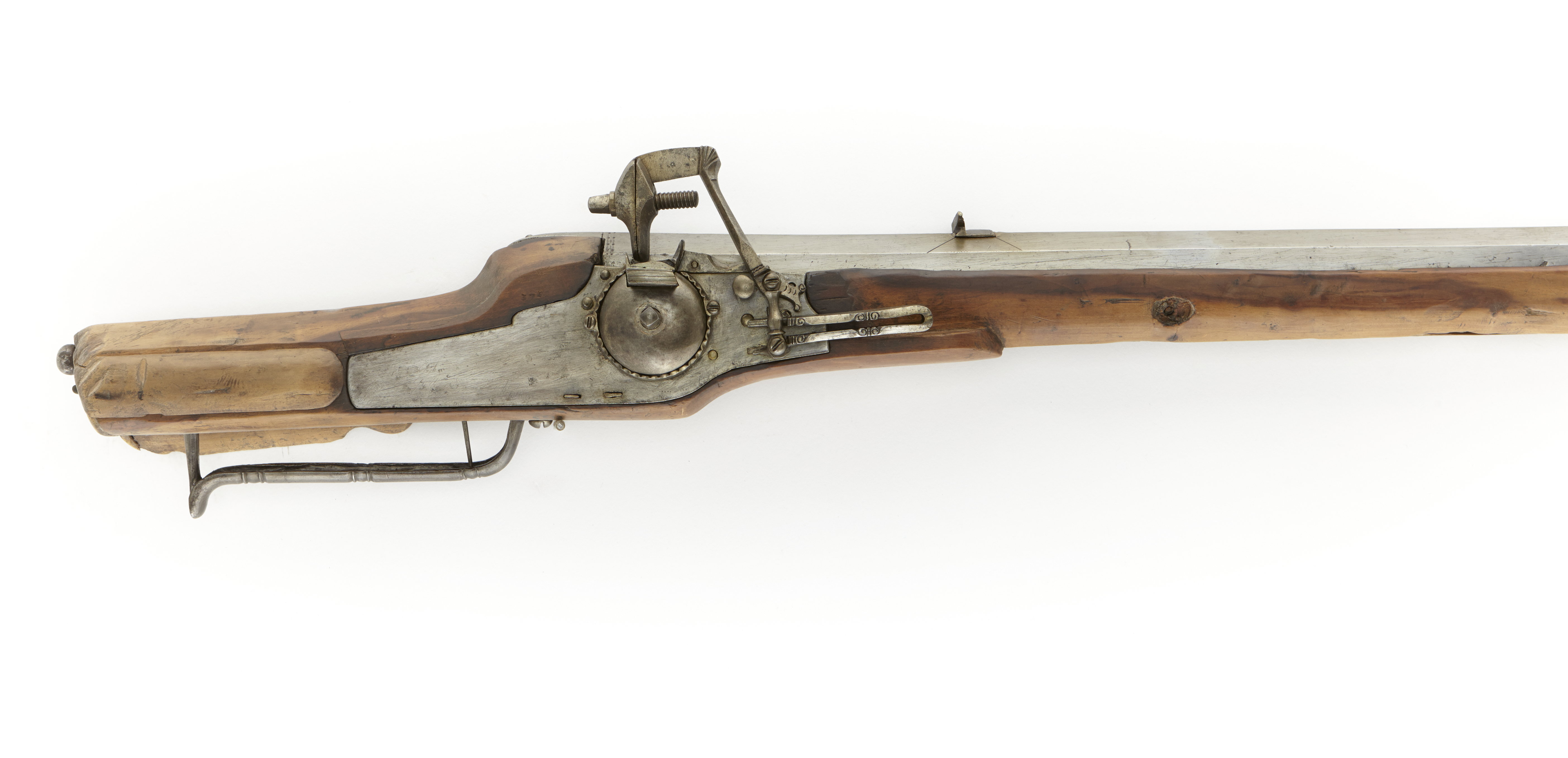 Sexkantig, slätborrad svinryggspipa. Ståndsikte av stål, korn av koppar. Från vardera siktets hörn, utgående graverad linje. Tre piphäften. Hjullås. Låsbleck av tysk typ - bakåt avsmalnande genom två fall. Kullrig hjulkapsel, hjulet fasthållet medelst upptill tandad ring, kl.9 och kl. 3. Mycket låg krutskärm. Hane med lös underkäke. Hel stock av ljust brunt trä. Tysk kolvtyp. Bakplåt av ben, stödkula av stål. Två låsskruvar med runda hjorthornsbrickor. Även pipstiften ursprungligen med runda hjorthornsbrickor, endast ett saknas. Pipstiften ej ursprungliga. Näsband sakans. Rörka av hjorthorn. Trågformad varbygel, s.k. holsteinsk. Tillbehör saknas. Märkt: 371, ovanför låsblecket, stanstyp 5376. 112 (eller 411), med blyerts på anslaget. 1710 års inventarium p. 11,rum II: "20-37-1 D:o (Swinrygg) med blanck pijpa"