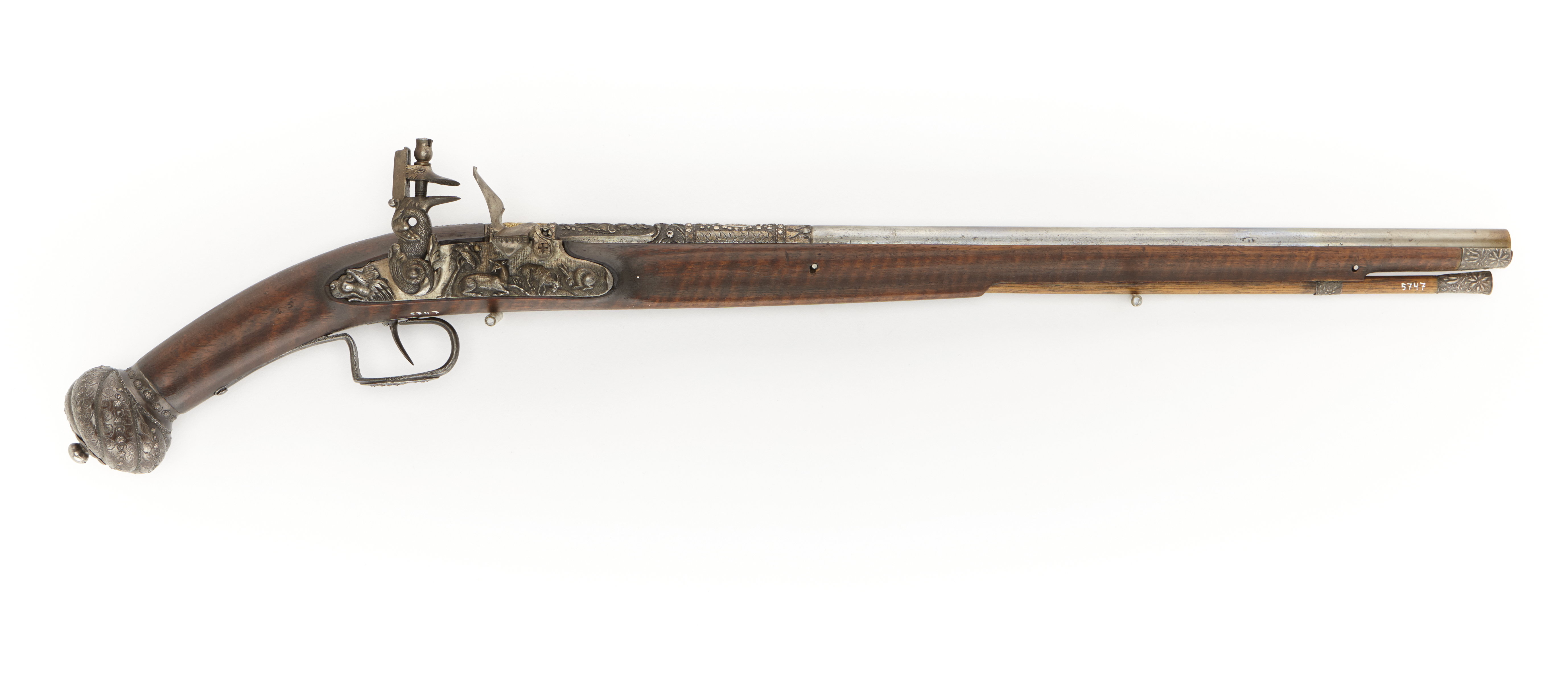 Rund, slätborrad pipa av stål. Över kammaren silverinläggningar i form av stjärnor, inlagt drivet mässingsbleck, skulpterande djur, medaljong med lagerkrönt profil av silver. Två häften. Flintlås av stål med plant låsbleck med ciselerade djur, baktill ett odjurshuvud. Hane i form av hopringlad orm, lös överkäke. Eldstål med åsad rygg. Kantig fängpanna. Brun helstock av valnöt med rund turbanliknande kolvkula av brunerat stål med spiralformiga räfflor. Punsad dekor och inläggning av silverstjärnor. Rund nitknapp av stål med en 6-passfornig bricka av silver. Överrörka av silver liksom näsband med bladdekor. Varbygel av brunerat stål utvidgad till en platta på bygelns mitt, inlagd med silverstjärnor. Tillbehör: Laddstock av trä, doppsko av ciselerat silver. Märkt: 45 bakom låsblecket, stanstyp 5376.
