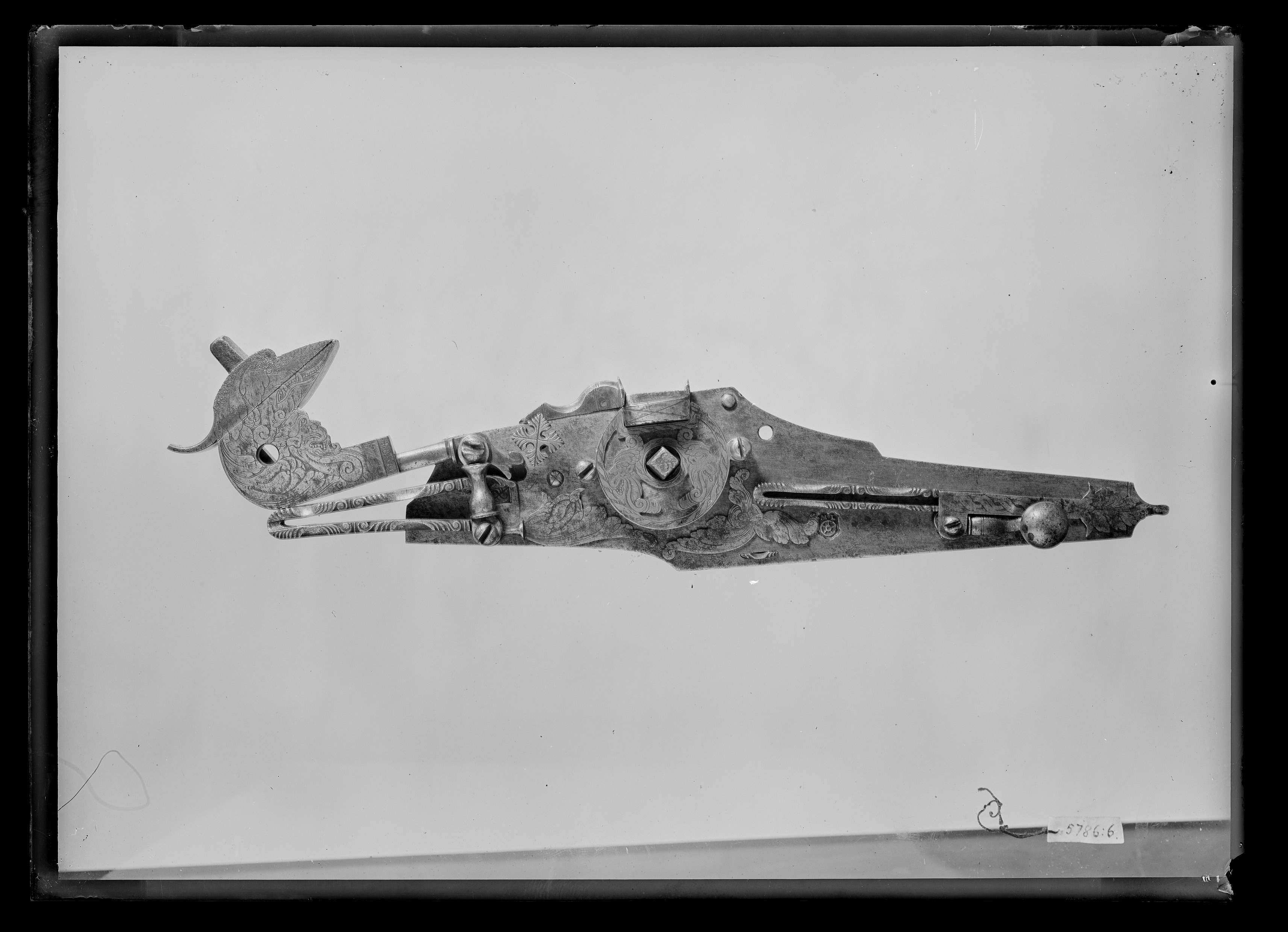 Hjullås av tysk typ med plant låsbleck, stämplat nedanför säkringens fjäder med sköldformig stämpel, däri hjul samt M L. Utvändigt hjul fäst med plan kapsel och skruvar kl. 3 och 9, kapseln genombruten på kanten nertill, på ovansidan en tunn, genombruten mässingsplåt med två ifrån varandra vända lejonmaskaroner i profil, kantbård i form av repstav. Hane med kort, rund kropp och hals med bred, av ett runt hål genombruten skärm, fortsättande i den lösa överkäken, käkarna graverade som odjurshuvud, bakom hålet en lejonmaskaron, på klack vid övergången till kroppen graverat: 1594. Käkskruv med fyrsidigt huvud, uppböjt fingergrepp (avbrutet). Balusterformig hanstudel, hanfjäder med fyra runda skålningar samt bladdekor, långt, platt, bladformigt fjäderlöv. Fängpanna med rundad kant, x-dekor, låg krutskärm. Fängpannelock med rörlig arm, på locket graverat en lejonmaskaron, profilerat grepp, tryckknapp med korsformigt huvud. Mellan säkringens fjäder och hjulet ett treflikigt, stort ornamentblad, utformat som fjäderlövet. Slagfjädern och fängpannelockets drivfjäder dekorerade som hanfjädern, på avtryckarstången, hjulstudeln och fängpannelockets stoppfjäder punsad dekor. Säkring: Virvelsäkring med kulformigt grepp, studel med graverad flätdekor och flikigt blad som går ut på låsbleckets spets, fjäder dekorerad som hanfjädern. Fästning: Hål för två låsskruvar.
