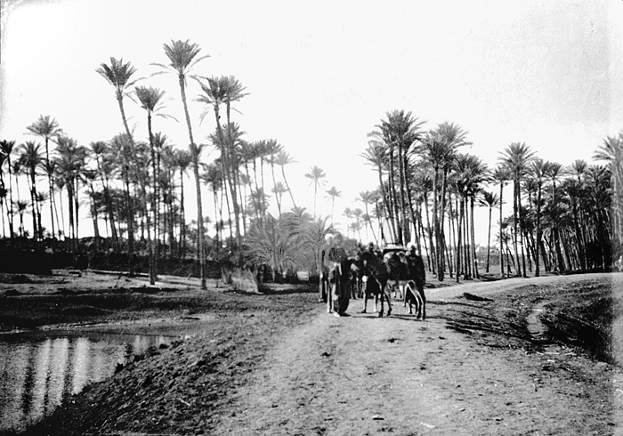 Landskap mellan Badrashin och Memfis. Text på fotografiet: Paysage entre Bedraschên et Memphis. Fotografierna LXVI:M.01.- 201. kommer från resan till Egypten och Sudan som Wilhelmina och Walther von Hallwyl gjorde vintern 1900-1901. De lämnade Sverige den 5 november 1900 och fortsatte från Egypten till Palestina den 28 mars 1901. Med på resan var döttrarna Ellen med maken Henric de Maré och Irma med maken Wilhelm von Geijer. Wilhelminas sällskapsdam, fröken Ida Uhse reste också med. Under en del av resan anslöt sig ledamoten av Internationella domstolen i Kairo, assessorn Otto Conrad Waldemar Cedercrantz med makan Anna Elisabeth. Vid resan uppför Nilen hade Walther von Hallwyl hyrt ångfartyget Columbia med besättning. Båtresan startade i Kairo 27 december 1900, gick ända till Wadi Halfa varifrån man reste vidare med tåg till Khartum och tillbaka till Wadi Halfa. Båten vände åter i riktning mot Kairo, men det verkar som att sällskapet tog tåg sista biten, från Luxor. Henric och Ellen de Maré samt fru Cedercrantz lämnade båten redan då de passerade Luxor första gången. Resten av sällskapet återvände till Kairo den 1 mars. Fotografierna LXVI:M.01.-120. togs av resenärerna själva, de största av Ellen de Maré, de mellersta av Wilhelmina von Hallwyl och de minsta av Wilhelm von Geijer. Resten köptes av professionella fotografer i Kairo, de flesta från Studio Photogr. Artistique G. Lekegian & Cie. Alla uppgifter kommer från Ida Uhses reseanteckningar.