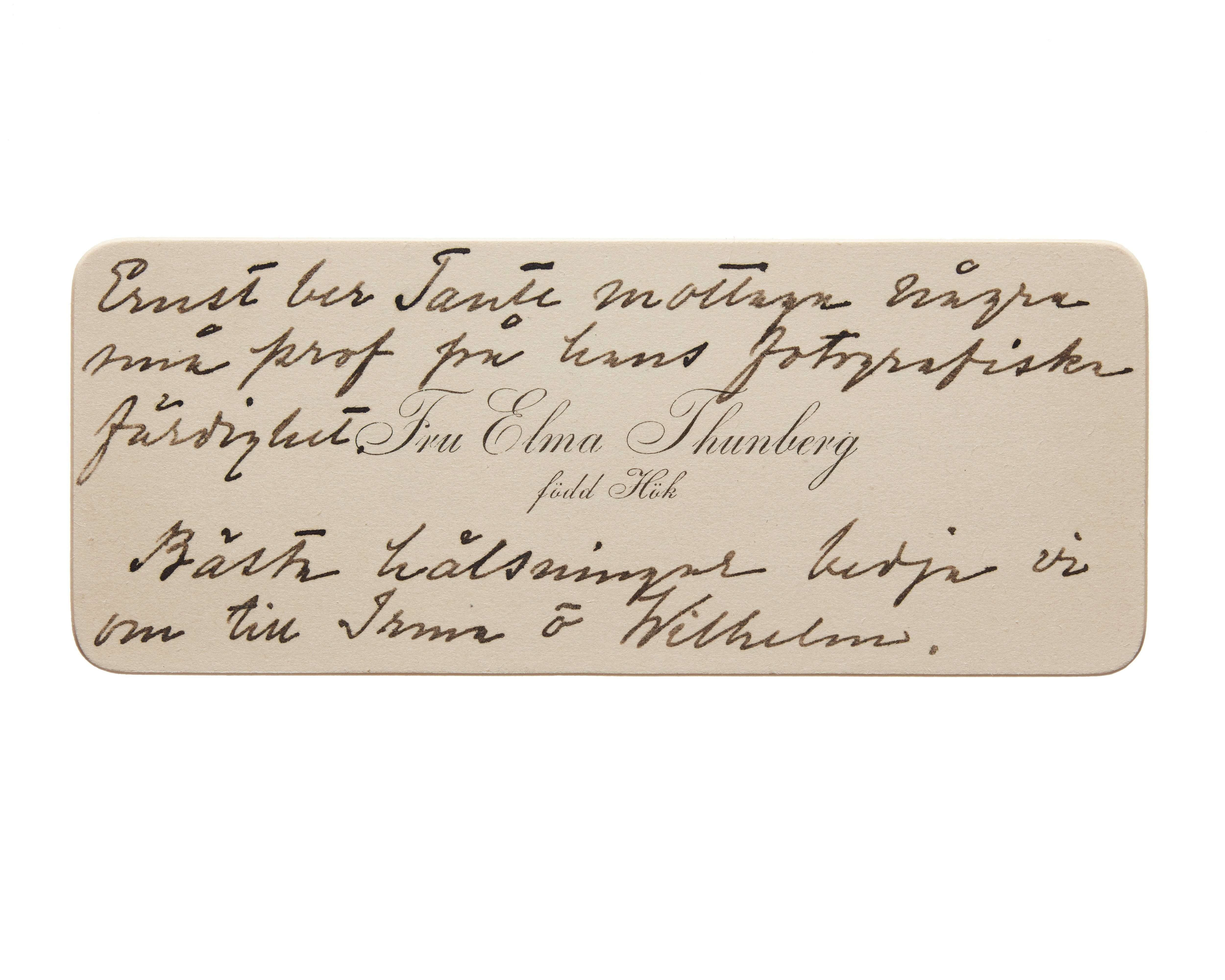 Ett visitkort från Fru Elma Thunberg, f. Hök, daterat 1910. Handskrift "Ernst ber tante mottaga några små prov på hans fotografiska färdighet. Bästa hälsningar bedja vi om till Irma och Willhelmina". Handskrift baksida "de hjärtligaste önskningar om en glad och fridfull jul och ett välsignelserikt nytt år önskas Tante och Farbror från tillgivna Ernst och Elma Thunberg"