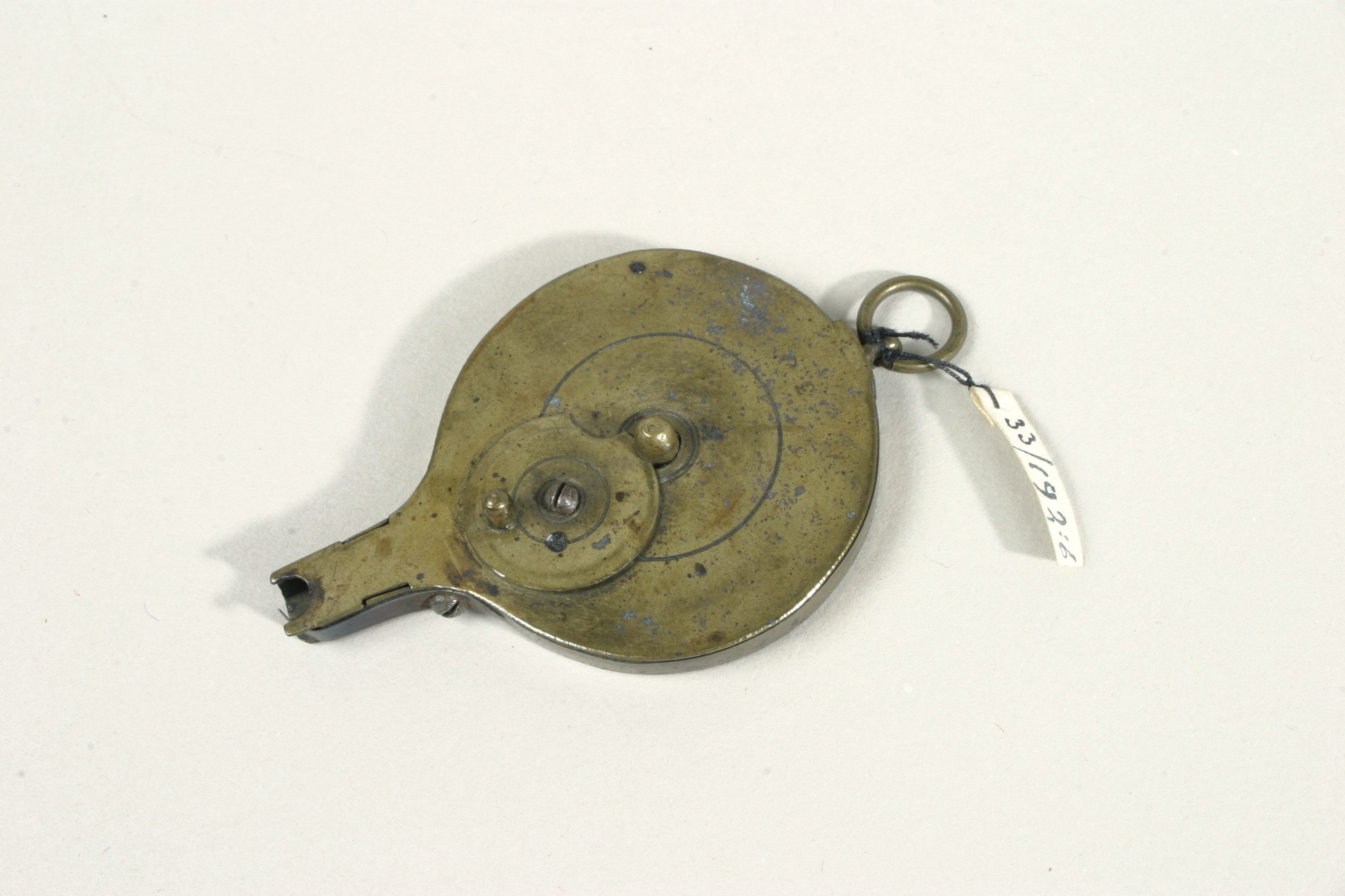 Ampullaformat tändhattsmagasin i mässing med avtagbart lock. Frammatningshål upptill på den flaskhalsformade delen. Hålet är till hälften täckt av en fastskruvad tunn och avlång platta av stål (?). På motstående sida en ring i mässing. Locket fastsatt med hjälp av en cirkelformad platta i mässning som förs genom en skåra i magasinets mittaxel. I mässingen på magasinets utsida cirkelformade mönster.