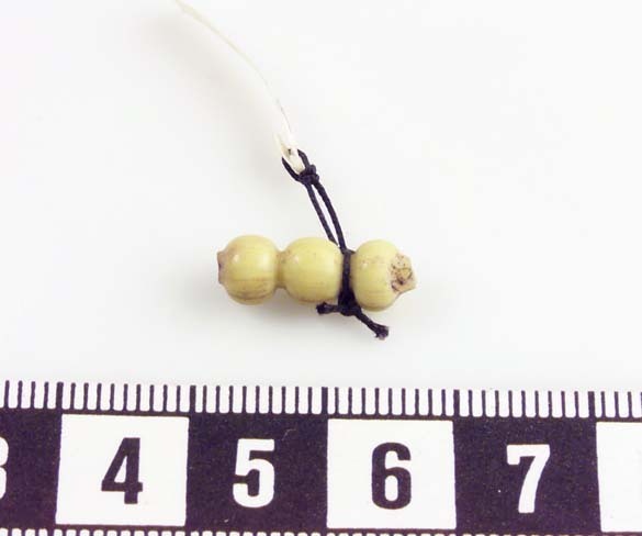 Segmenterad glaspärla, bikonisk pärla av bärnsten och 2 facetterade karneolpärlor.