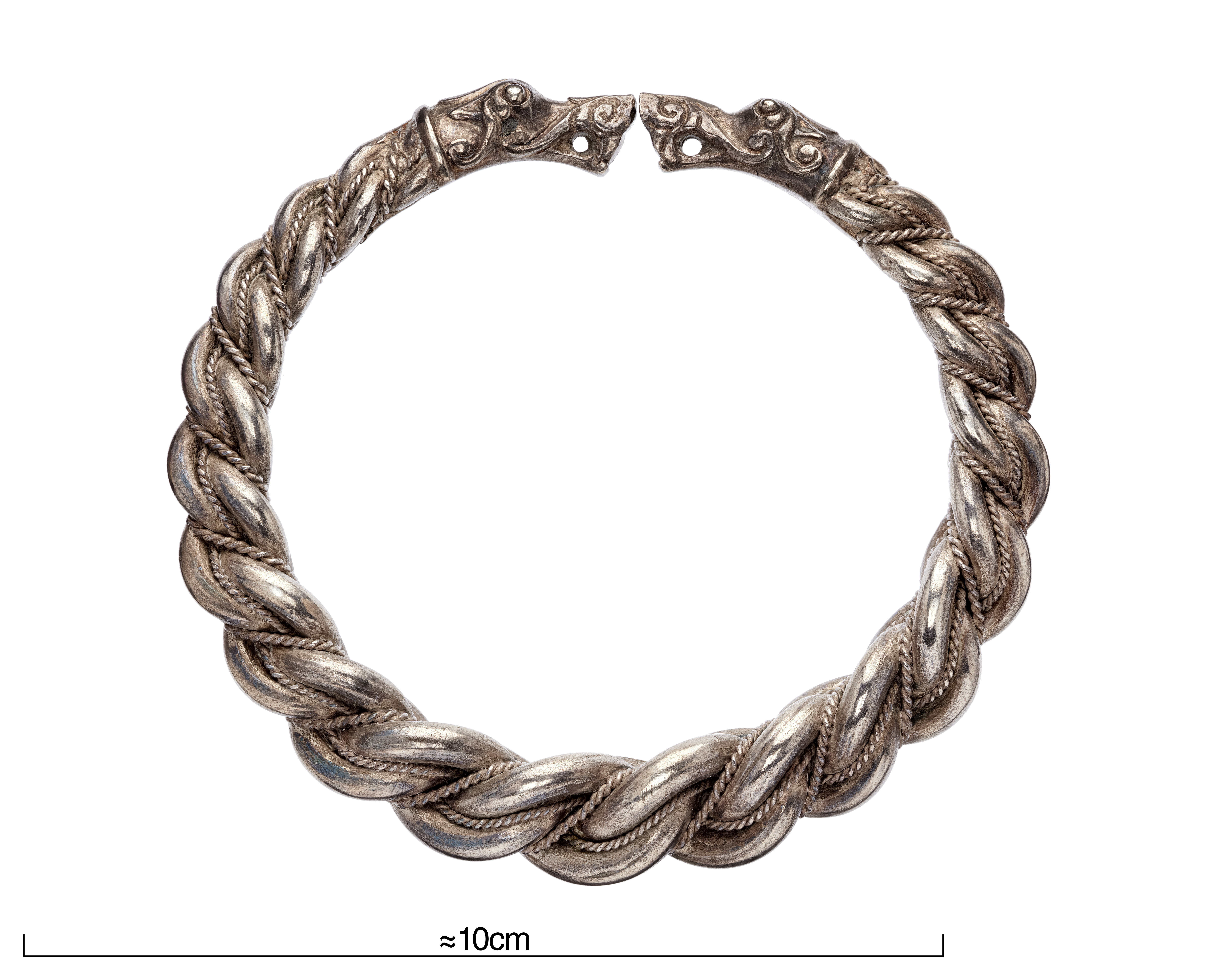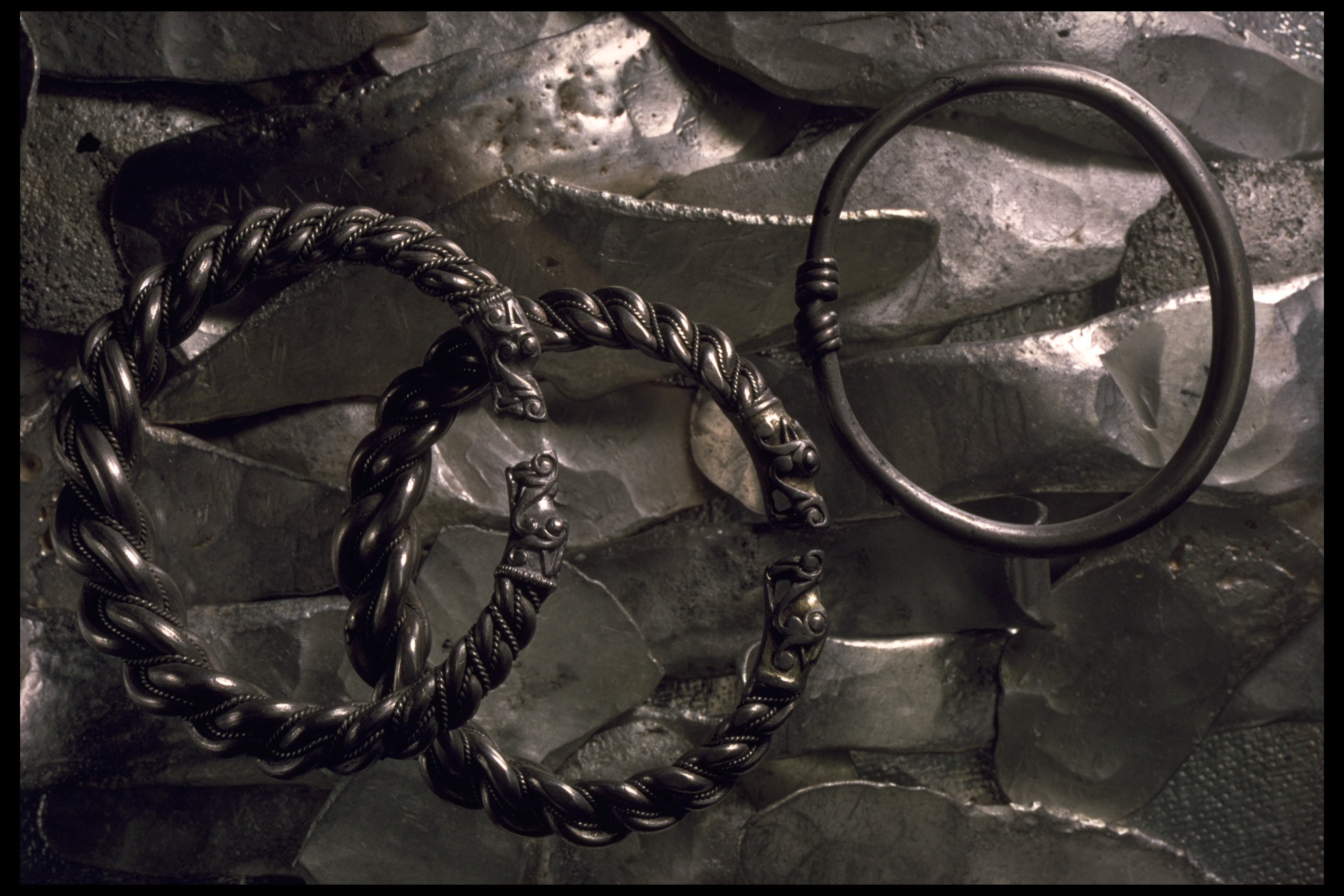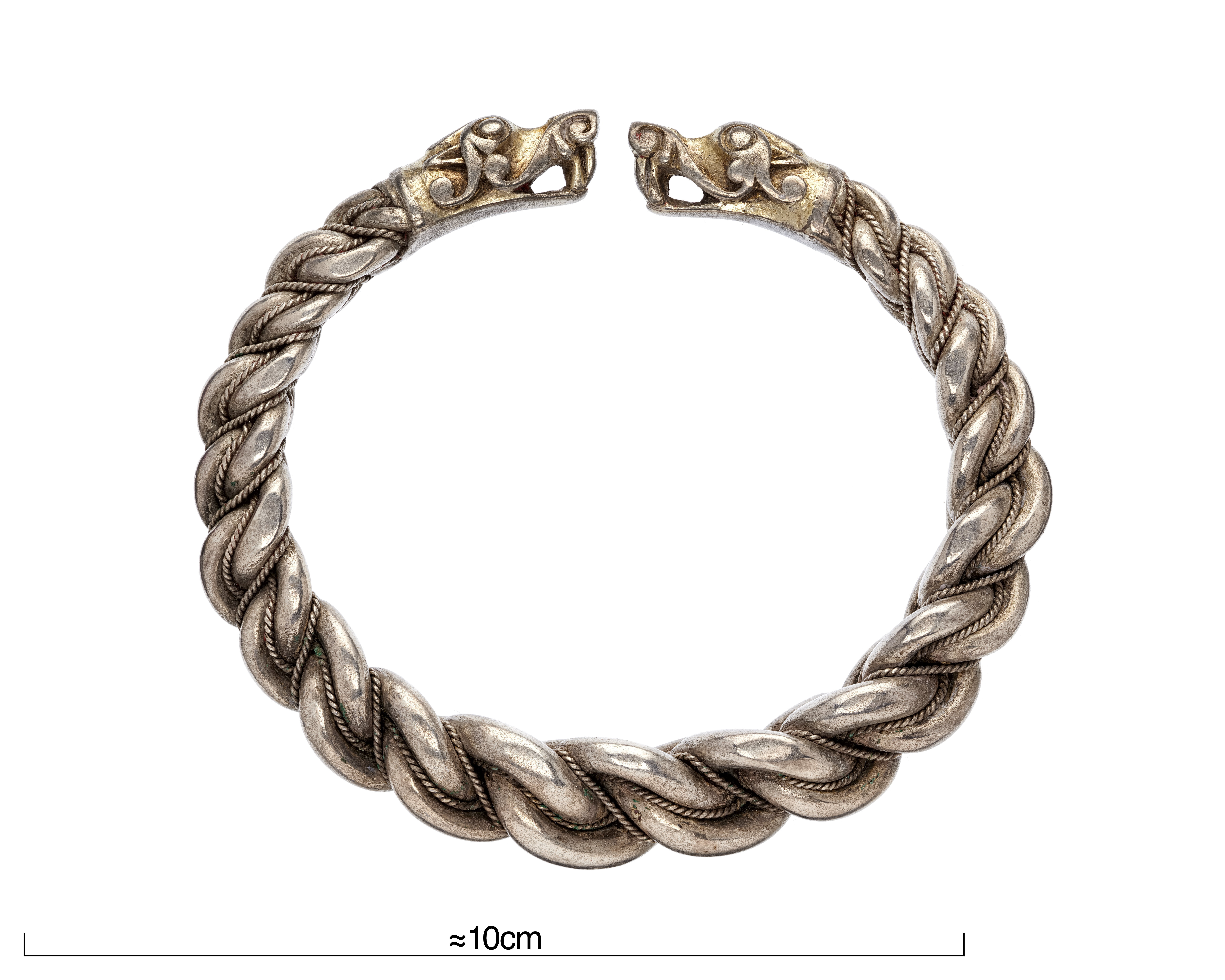 Tre stora armringar av snodda, flätade tenar med djurhuvudändar.