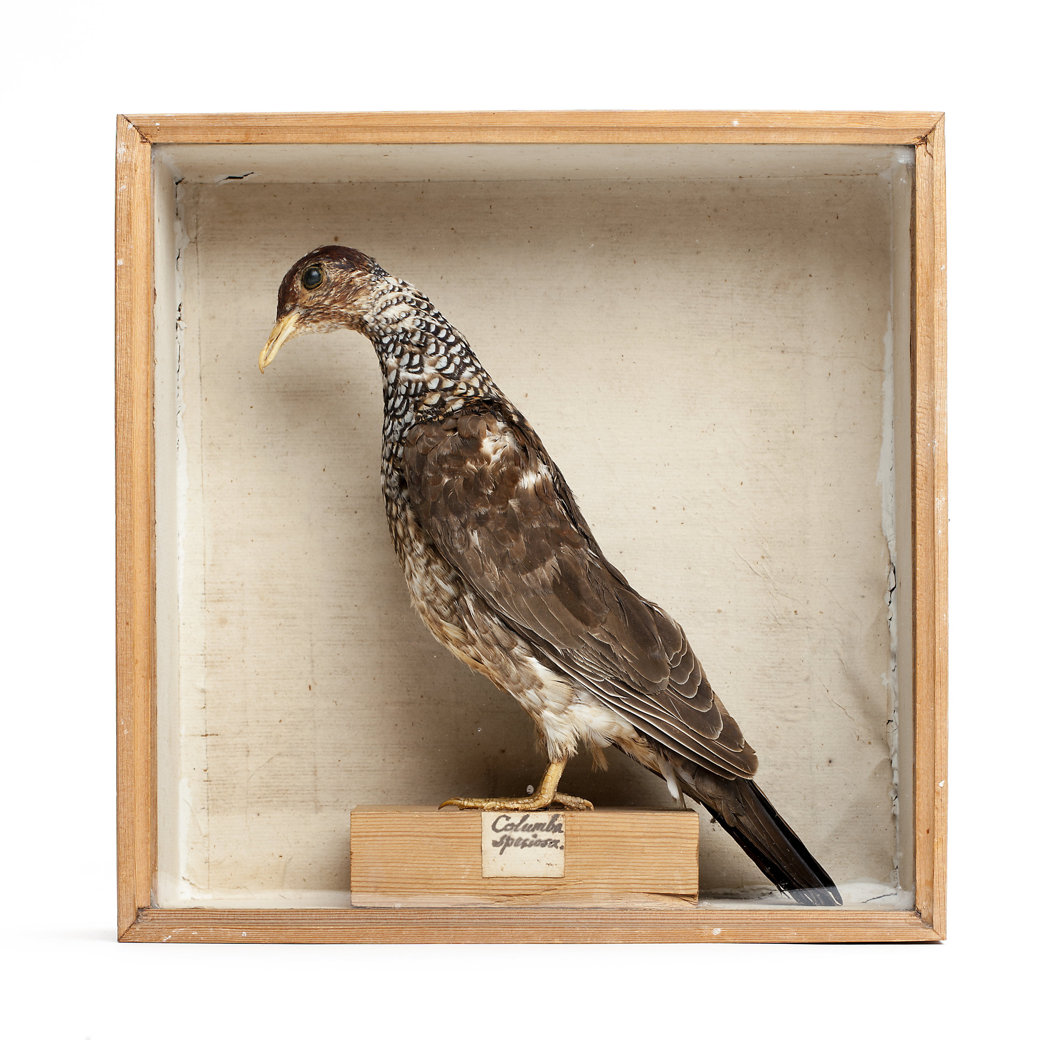 Duva från Brasilien uppstoppad med oberett lin. Ögon av glas. Låda av furu, invändigt klädd med vitt papper. Lös framsida av glas med träram. Fågeln stående på träkloss. På klossen lapp med bläckskrift: ”Columba speciosa”. Ovanpå ramen lapp: ”Columba speciosa. Dufva från Brasilien”. Fågeln kan ha samlats in av Lorentz Westin (1787-1846) samlade åt Linnélärjungen Carl Peter Thunberg i Brasilien och Argentina, och ingick sannolikt i Thunbergs naturaliesamlingar vid Uppsala universitet. Thunberg skänkte ett antal fåglar till Magnus Brahe på Skoklosters slott på 1820-talet.