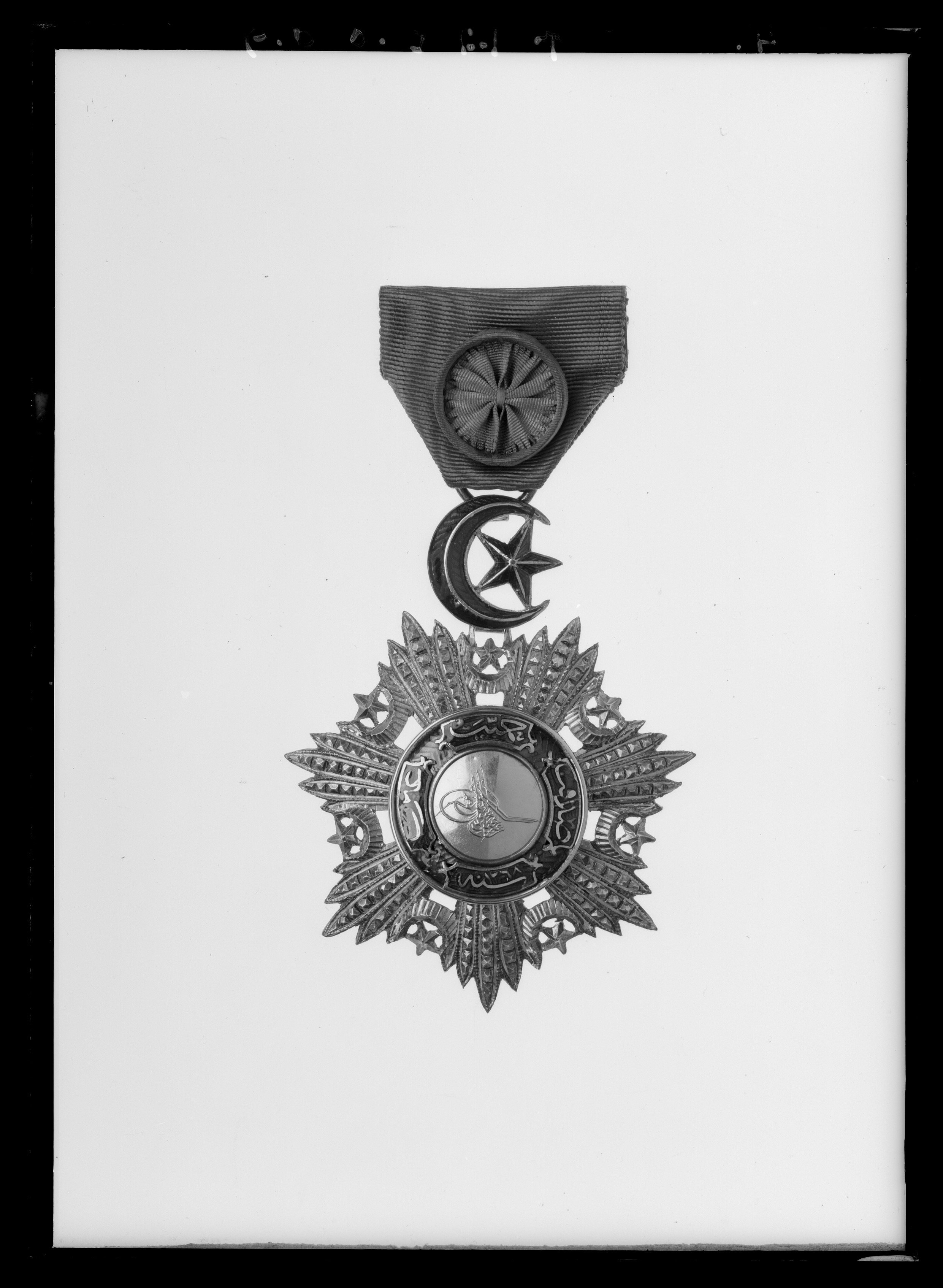 Sjuuddig, flinkerad stjärna av silver, varje udd består av fem strålar, mellan uddarna halvmåne och stjärna. Medaljong av guld med sultanens toughra (namnchiffer) i relief. Däromkring rödemaljerad ring med turkisk text i guld (iver, hängivenhet, trohet, 1268). Vid den övre halvmånen och stjärnan fäst en fyrkantig bygel, däri fäst halvmåne och stjärna av rödemaljerat, förgyllt silver, på månens baksida ring, däri fästbandring. Frånsidan slät med halvmåne och turkisk text samt två otydliga stämplar.