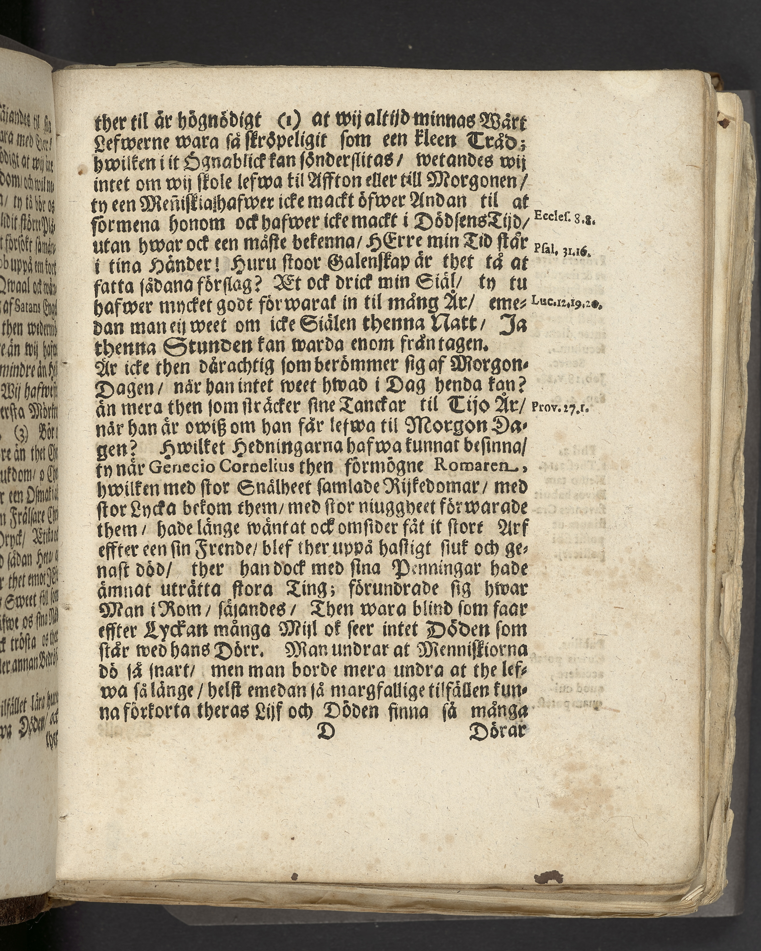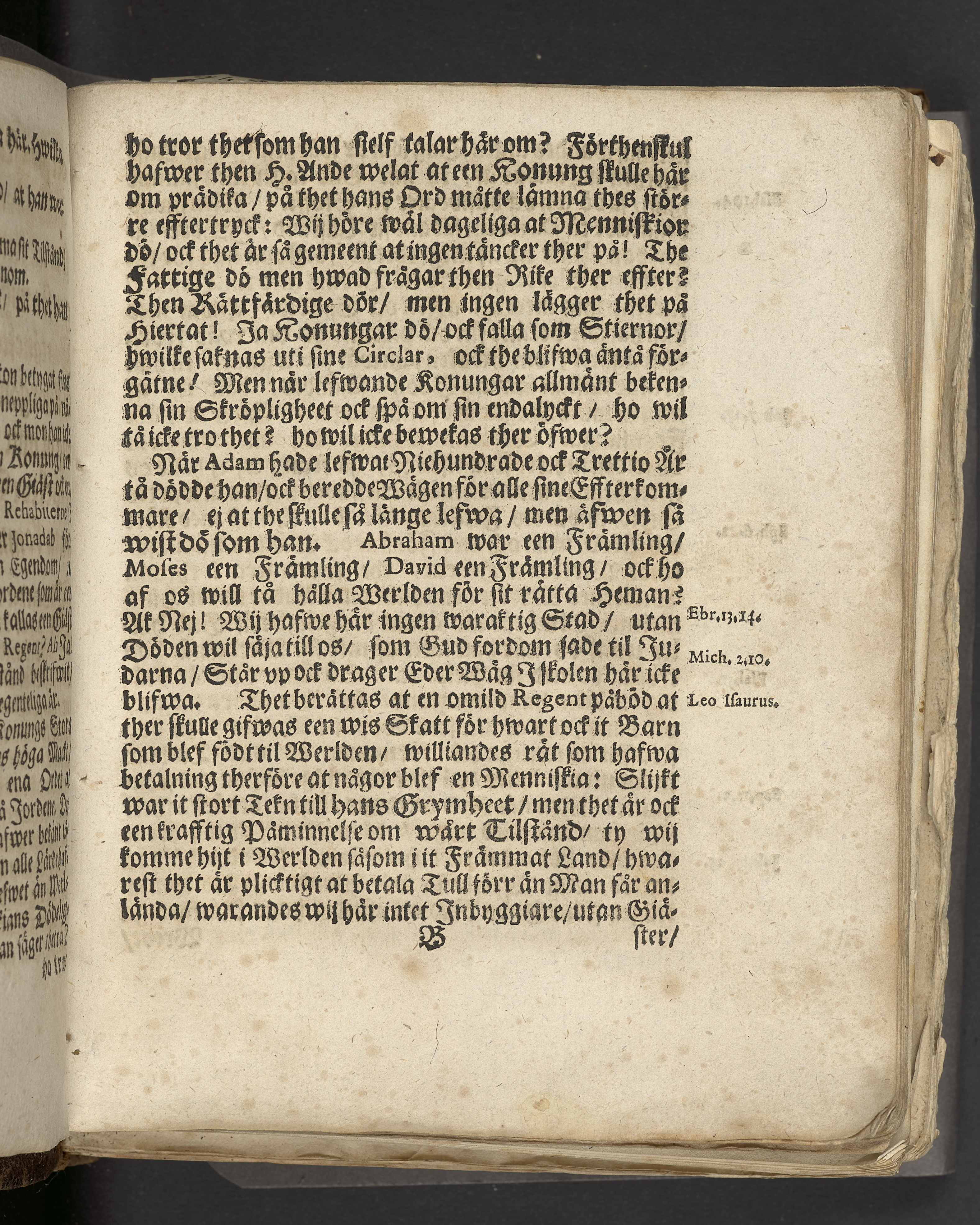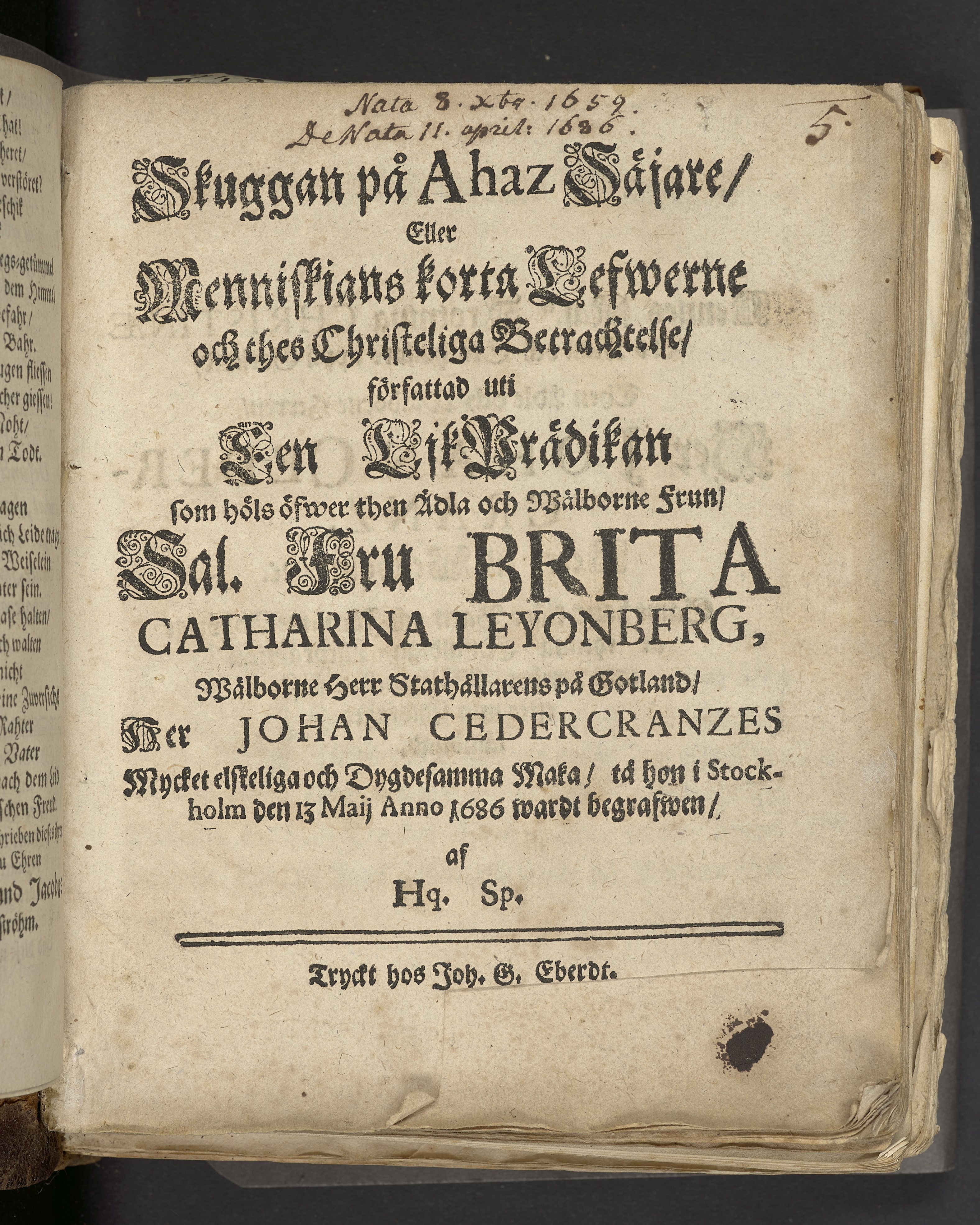 Skuggan på Ahaz säjare, eller menniskians korta lefwerne och thes christliga betrachtelse, författad uti een likprädikan aom höls öfwer then ädla och wälborne frun, sal. Fru Brita Catharina Leyonberg, wälborne herr stathållarens på Gotland, Her Johan Cedercranzes mycket elskeliga och dygdesamma maka, tå hon i Stockholm den 13 Maij anno 1686 wardt begrafwen, af Hq. Sp. Tryckt hos Joh. G. Eberdt.