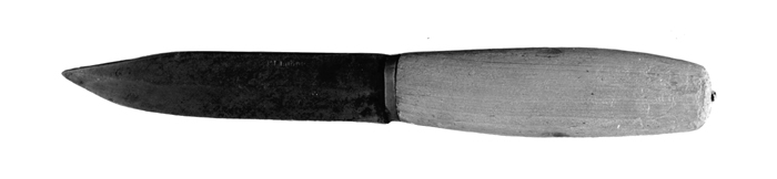 KNIV (tälj-) Av stål med träskaft. Blad jämnbrett, med rak egg och rak bak samt spetsig udd, avspetsad från både egg och bak, längs eggen på vardera sidan en bred slipfas. Skaft av al, spolformigt, med ovalt tvärsnitt samt med en genom hela skaftet gående tånge, kring inre änden en smal ring av mässing. Längd: 21,5 cm. Blad, bredd: 2,2 cm. Skaft, längd: 10,8 cm. Svensk tillverkning, Eskilstuna; firman E. M. Björk (fru Maria Björk), pp J. W. Björk.
