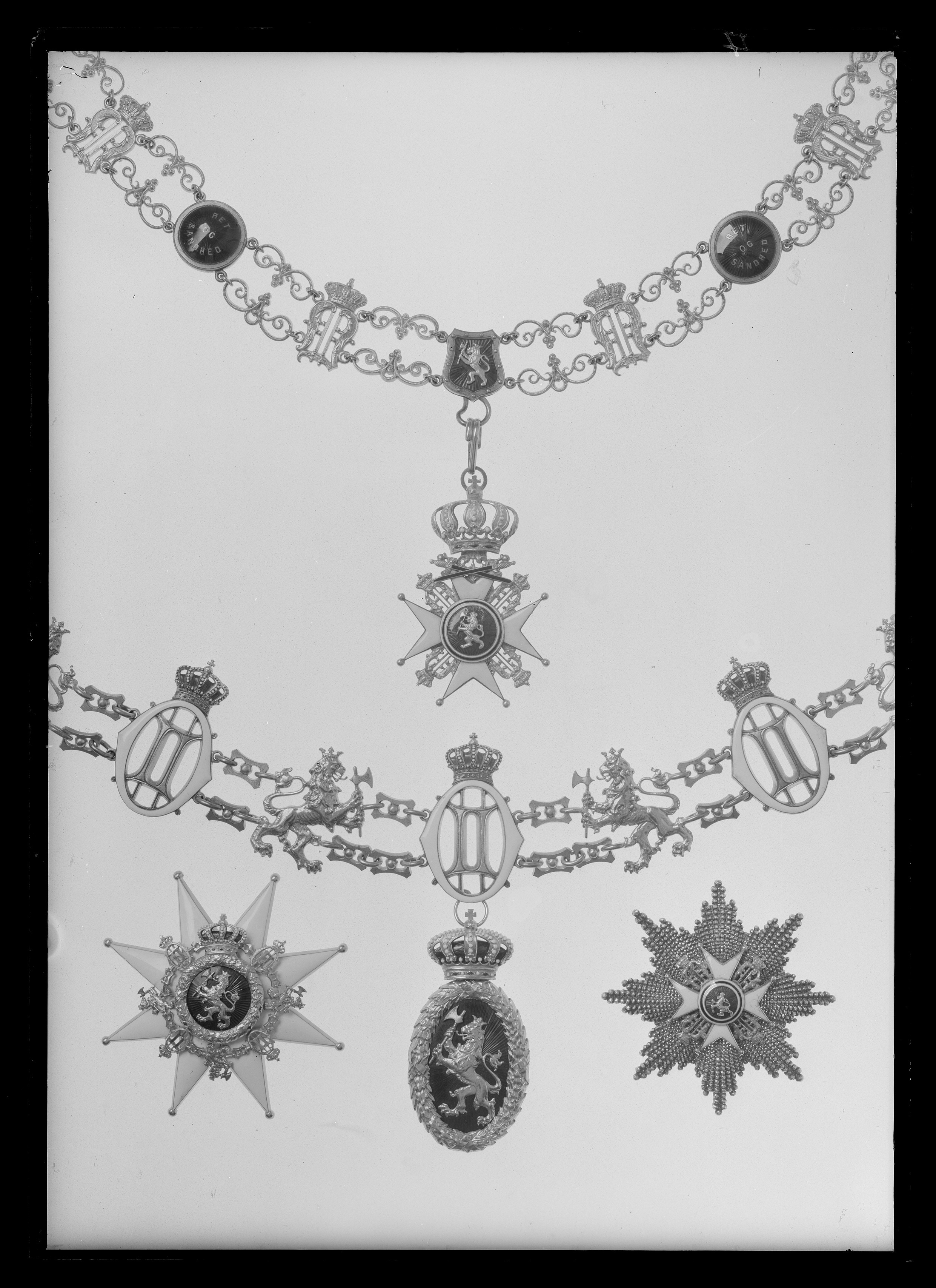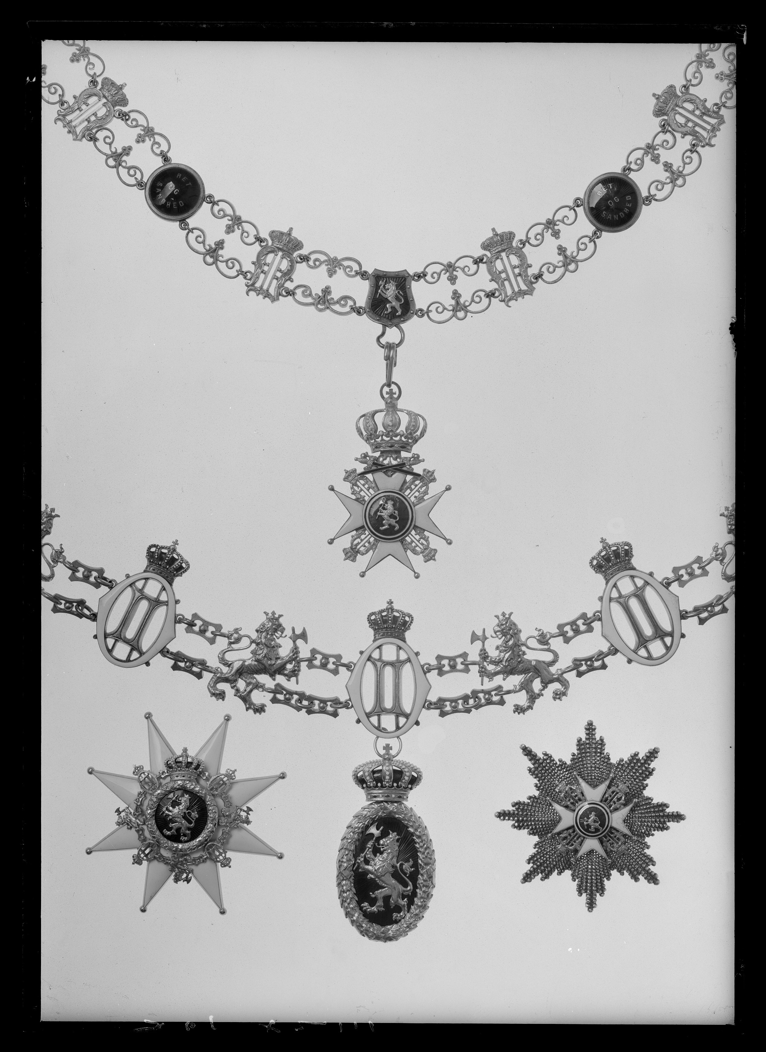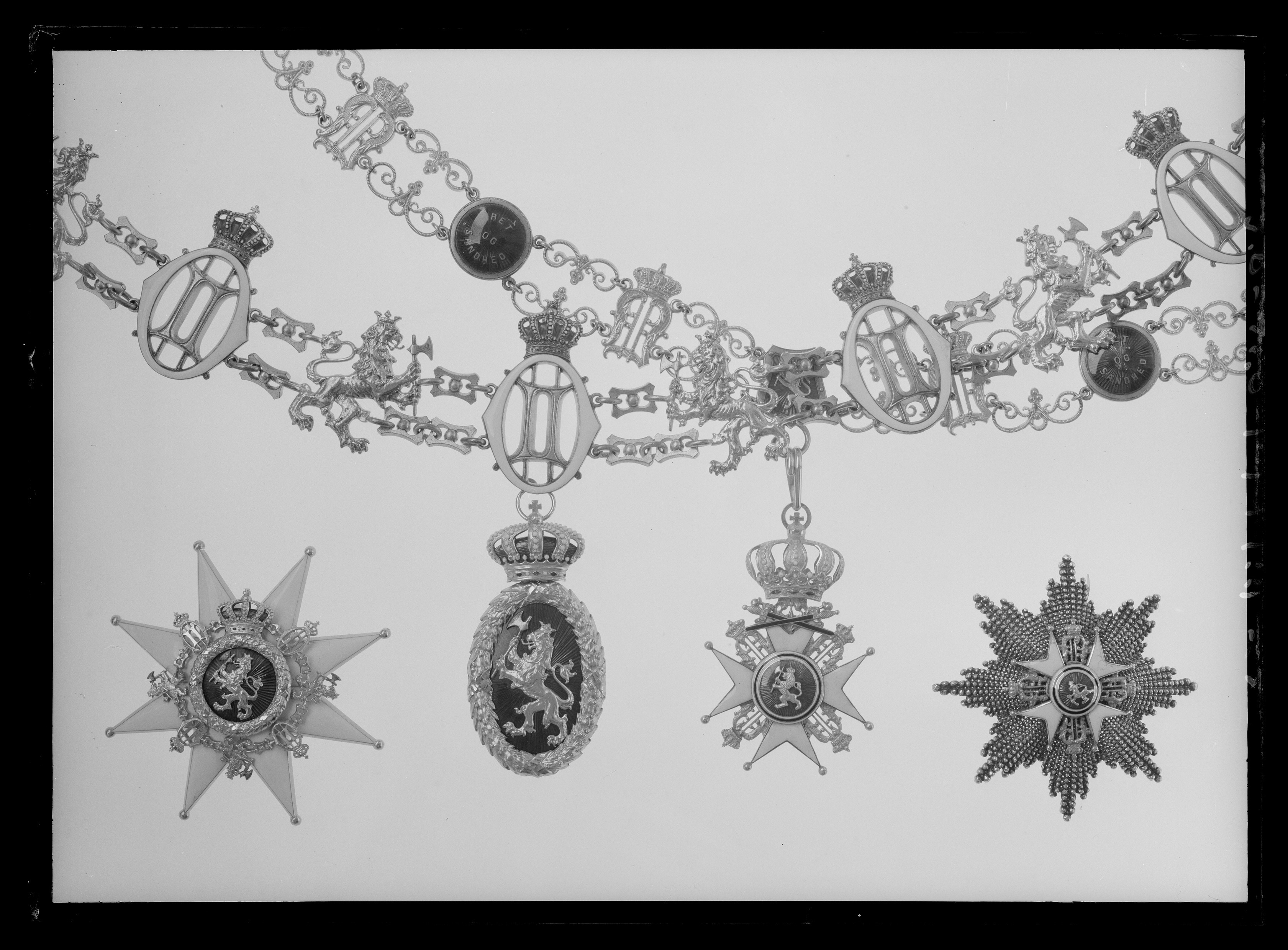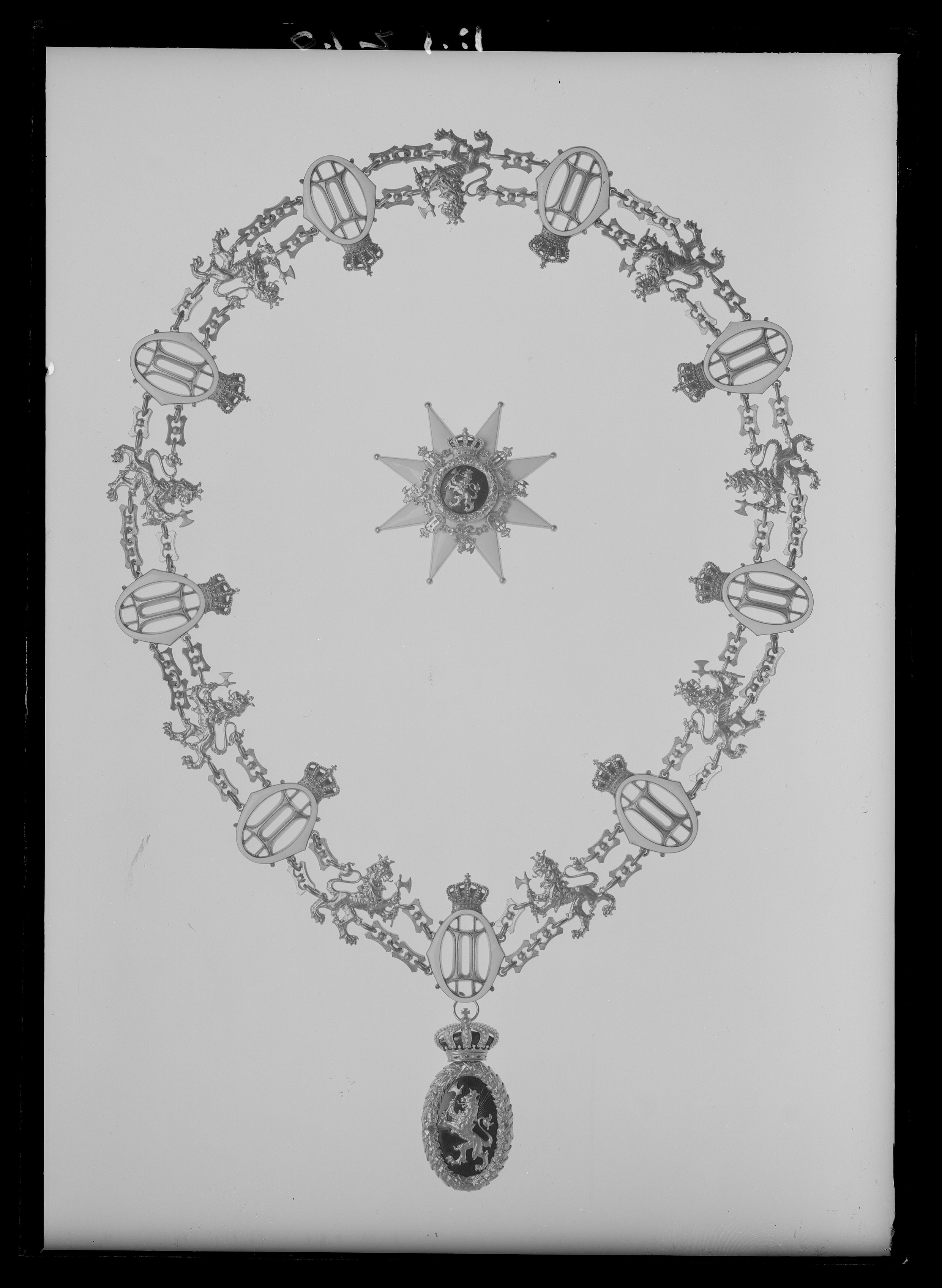 Sammansatta av 18 länkar av förgyllt silver(?) och emalj, nio länkar med namnchiffer, Oskar II, vitemaljerat O, omslutande II, krönt av kunglig krona med rött foder, vita pärlor. Nio länkar i form av yxbärande gyllene krönta lejon, yxbladet av silver. Baksidorna släta. På baksidan ev ett O en hake för tecknet, på baksidan av två lejon krokar. Länkarna förbundna av kedjor bestående av ovala ringar och fyrkantiga plattor med insvängda sidor, mellan varje stor länk en platta och två ovala ringar. Kedjan häktas ihop med två fasta hakar på baksidan av ett lejon.