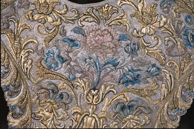 1 Sadel af blått sammet med förgylda stegbyglar, stickad i sätet med guld- och silfver. Litsquard, sadelkåpan, hölster kapporne och Eschabraquet broderade med silfver och guld samt Columbien och blomerant färgade rosor, sömmar och kanter, infattade med en silfver i guld galon. Sadelknappen samt 3ne stycken sleiffer, hvari pistolhölstren spännas är förgyld, med tennlickor af 6 lödigt silfver på sadeln fram och bak. Förbögeln virkad af guld och silfver samt blått och Columbien färgadt silke... Rubrik: Rid och Slädtyg Tid. inv. nr.: 573 Sida: 52 Nr. i föreg. inv.: 573 Anmärkning: Le Gaillard