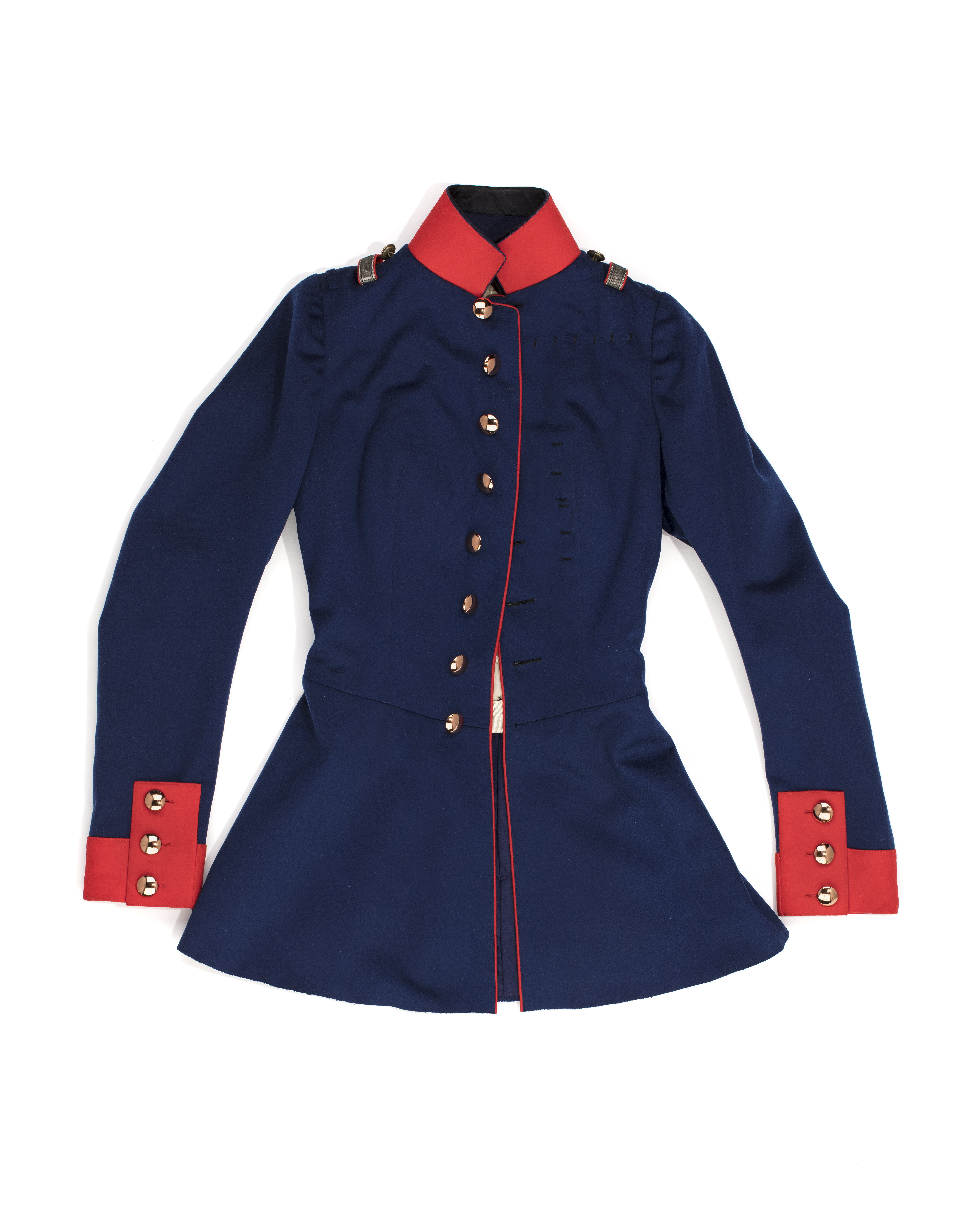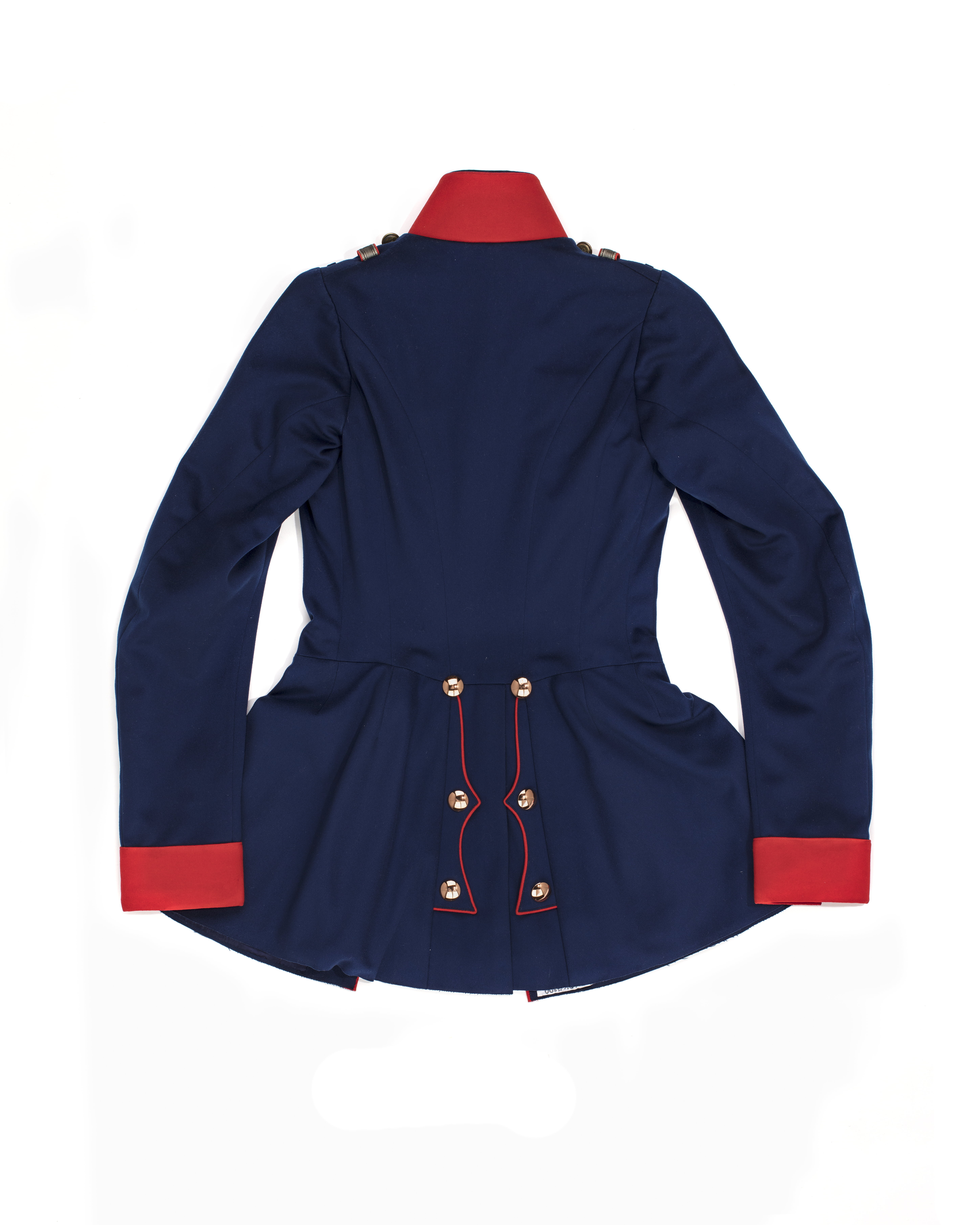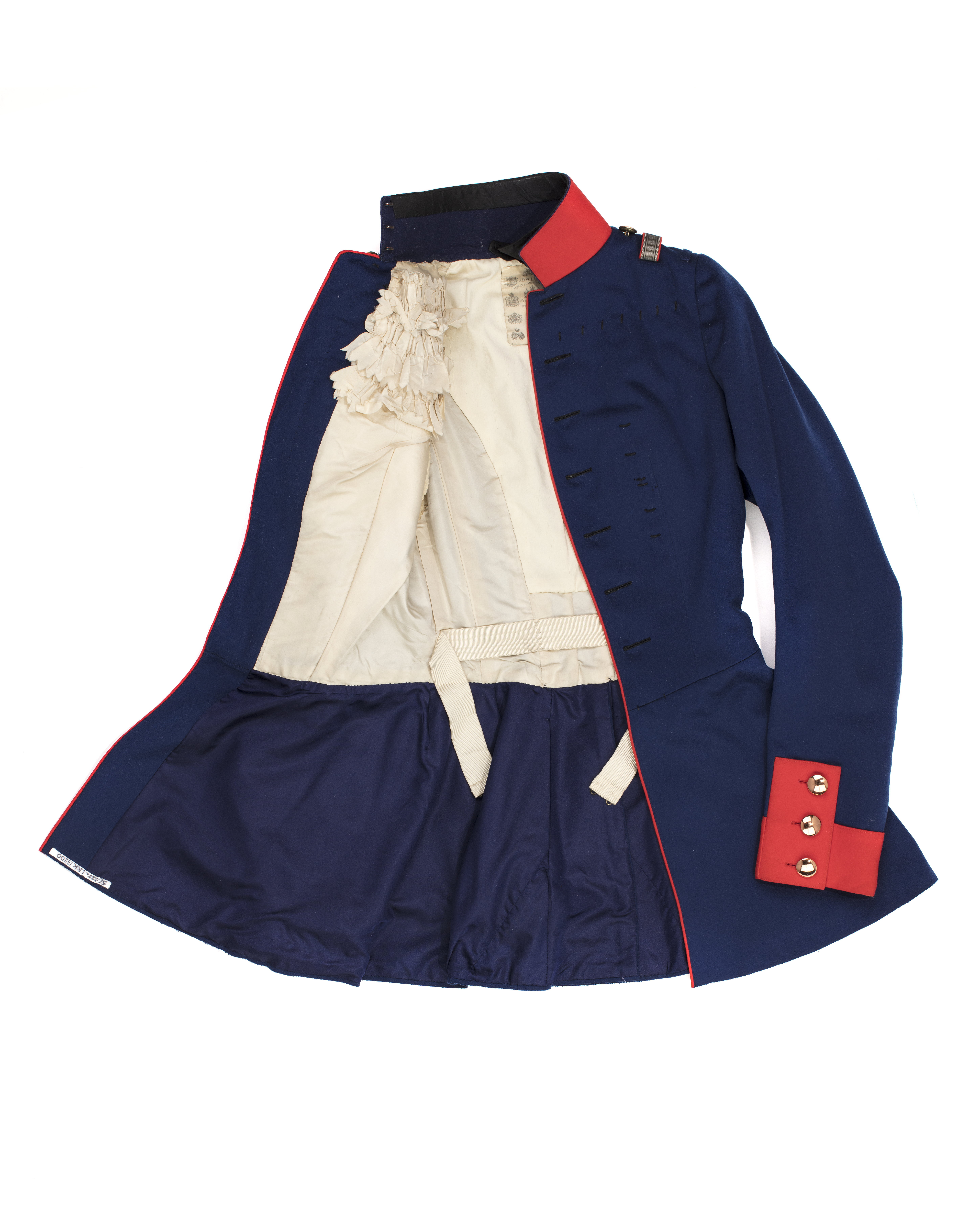 Har tillhört drottning Viktoria. Den bars av Drottning Viktoria den 17 juni 1909 vid inspektion av detta regemente, till vars chef Kejsar Vilhelm II hade utnämnt henne under sitt besök i Sverige 1908. Vapenrock av klarblått kläde med ståndkrage och enkel knäppning. Krage, ärmuppslag samt klaffar av rött kläde. Fram kantad med röda passpoaler. Tillskuren med livsöm samt med konturerade klaffar vid skörten. Åtta knappar framtill, släta, välvda, överklädda med tunn kopparhylsa, på insidan firmanamn:"GEBR. POHL STETTIN". På vänster framstycke 13 tränsar för bröstdekorationer. På axlarna små blå hällor, en bredare av rött kläde och silvergaloner samt en slät knapp av koppar. Foder i livet och ärmarna av vitt siden, i skörten av blått siden. Mitt bak upptill fastsydd firmaetikett: "J. D. W LAMPE )) HERREN UND DAMEN SCHNEIDER // HOFLIEFERANT // FRANK FURT A:M // KAISERSTRASSE 27". I ärmarna ärmlappar av trikå. Fastsytt vid framstyckens framkanter upptill, smockade lösa sidenbitar. I midjan spänntamp av vitt sidenrips.