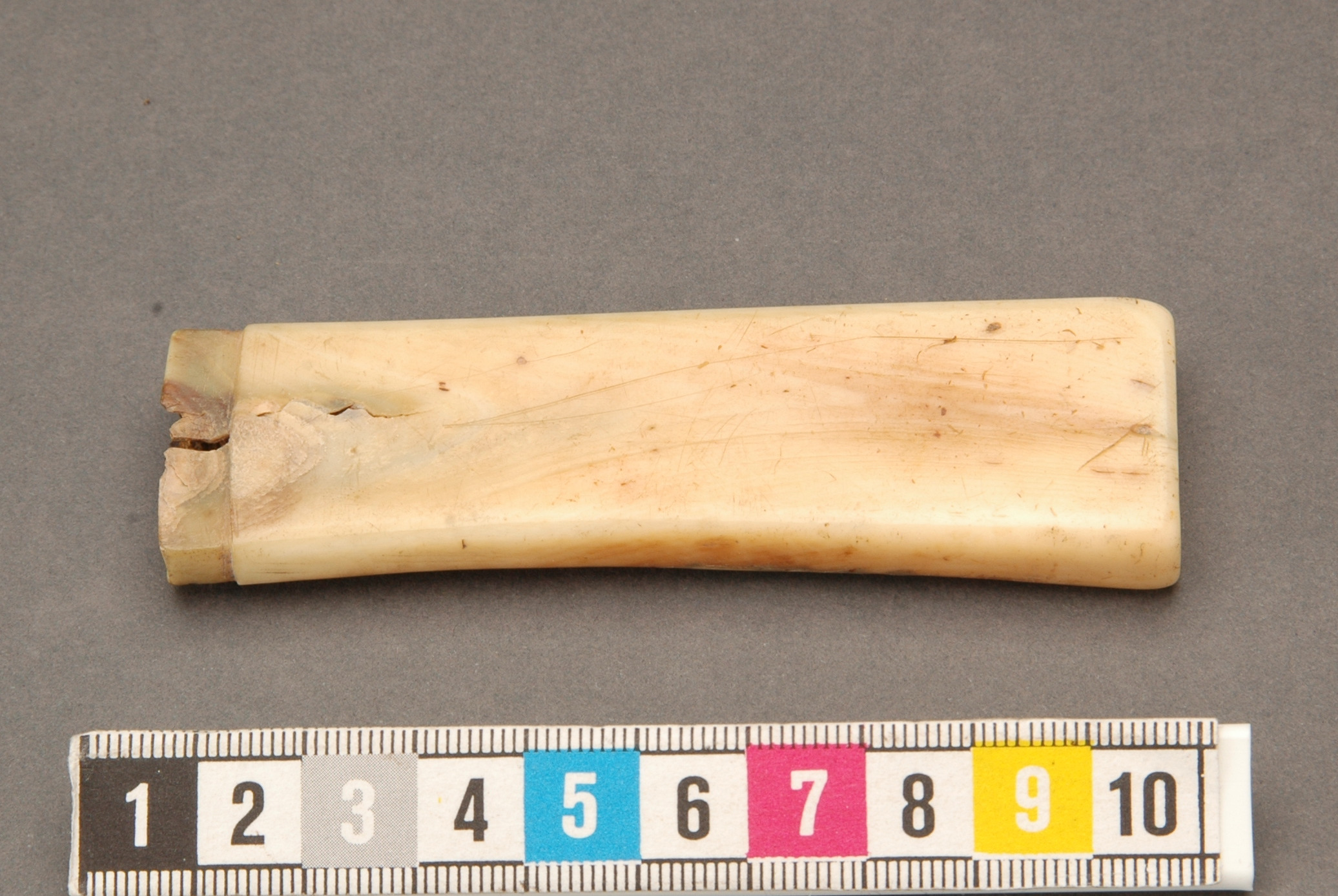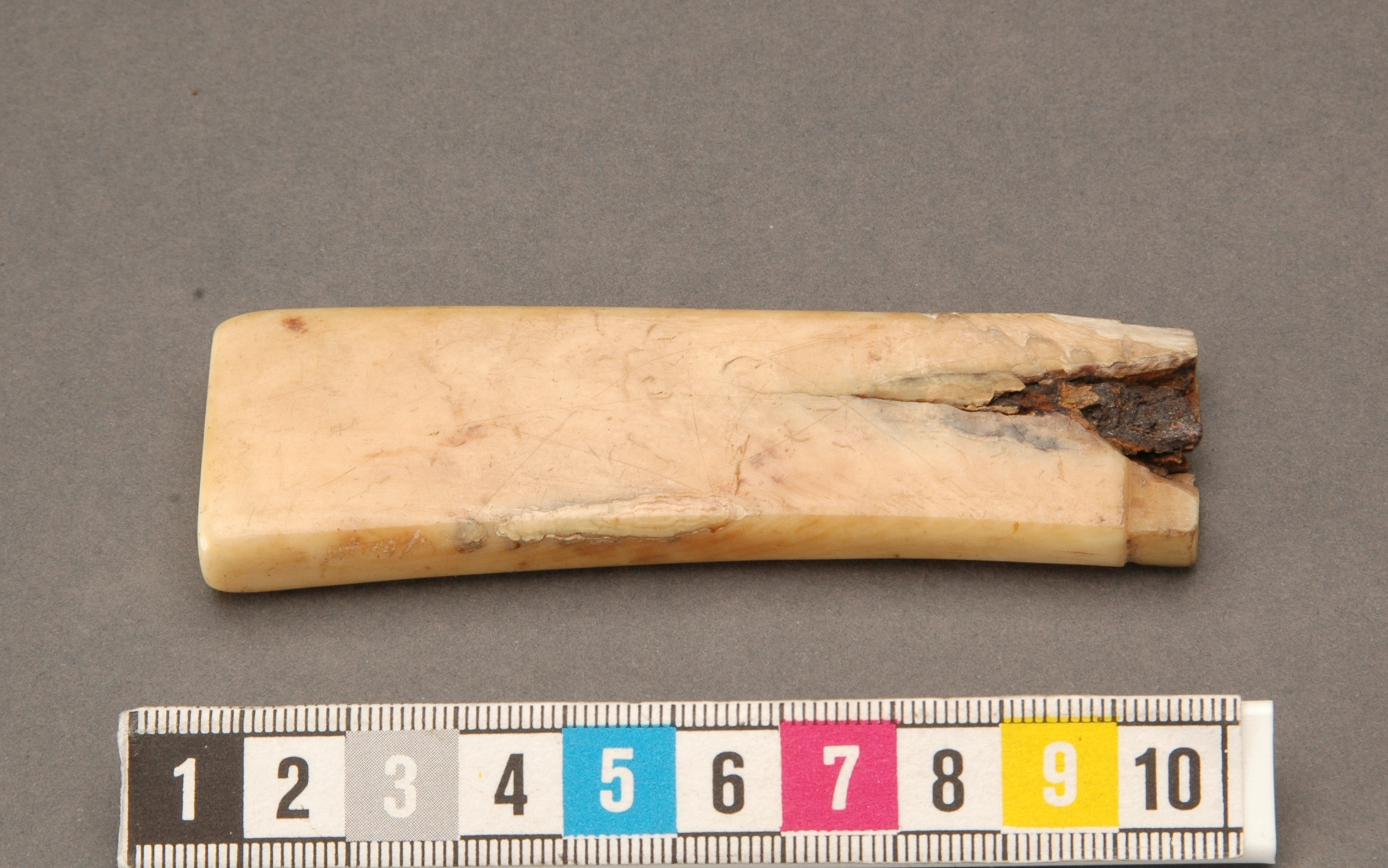 Polerat elfenben (valrossben?) med rester av järntånge kvar i ena änden.