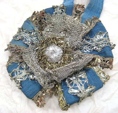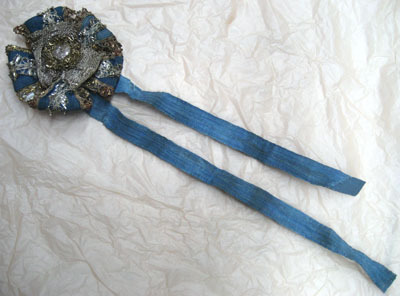 Rosett av fem dubbelvikta, blå sidenband på grovt linne. Sidenbanden dekorerade längs mitten med knypplade spetsar av silverlan och silvertråd, bredd: 20 mm. Sidenbanden kantade med knypplade spetsar av guldtråd och guldlan, bredd: 13 mm. Dekorrosett på mitten av tre dubbelvikta band (knypplade spetsar) av silvertråd och silverlan, bredd: 40 mm. I mitten en knapp klädd med tyg av silverlan och silke med ett sicksackmönster, diameter: 18 mm. Knappen omgiven av en franskant av guldtråd och guldlan, något ihoptryckt, bredd: 15 mm. På baksidan en rund bottenplatta, troligen av skinn, klädd med blå siden. Plattan mäter i diameter: 47 mm. I mitten två knytband av blå textil, bredd: 23 mm.