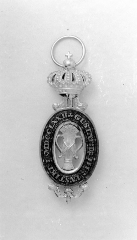 Dubbelsidigt tecken med guldvase, omgiven av ovalt, rödemaljerat guldband med guldtext: "GUSTAF:D:III:INSTIKT:MDCCLXXII". I ovalens nederkant ett bladornament av guld, i överkanten en kula, flankerad av nedhängande blad. I kulan fäst en kunglig krona av guld, igenom äpplet draget en bandring av guld.