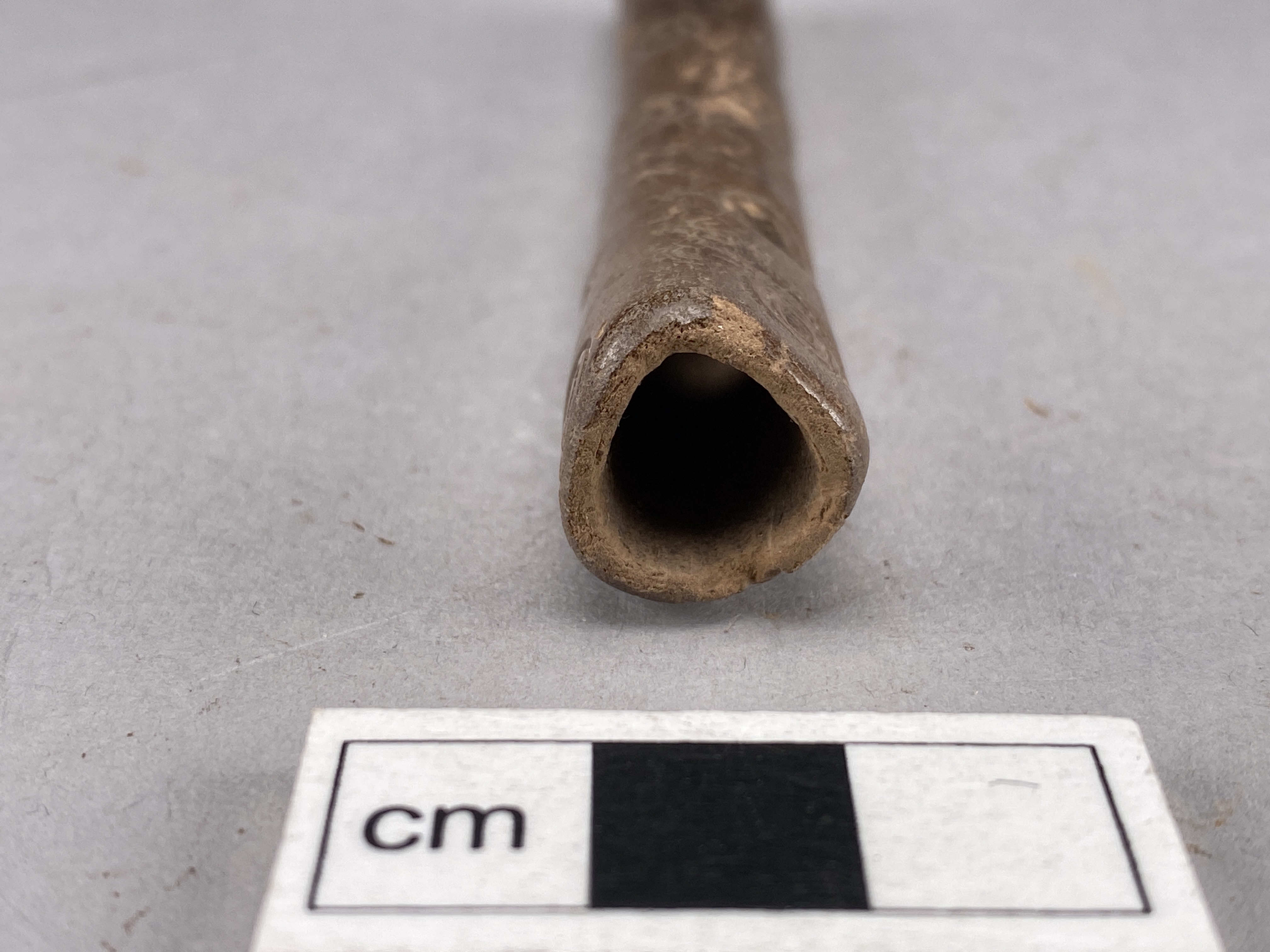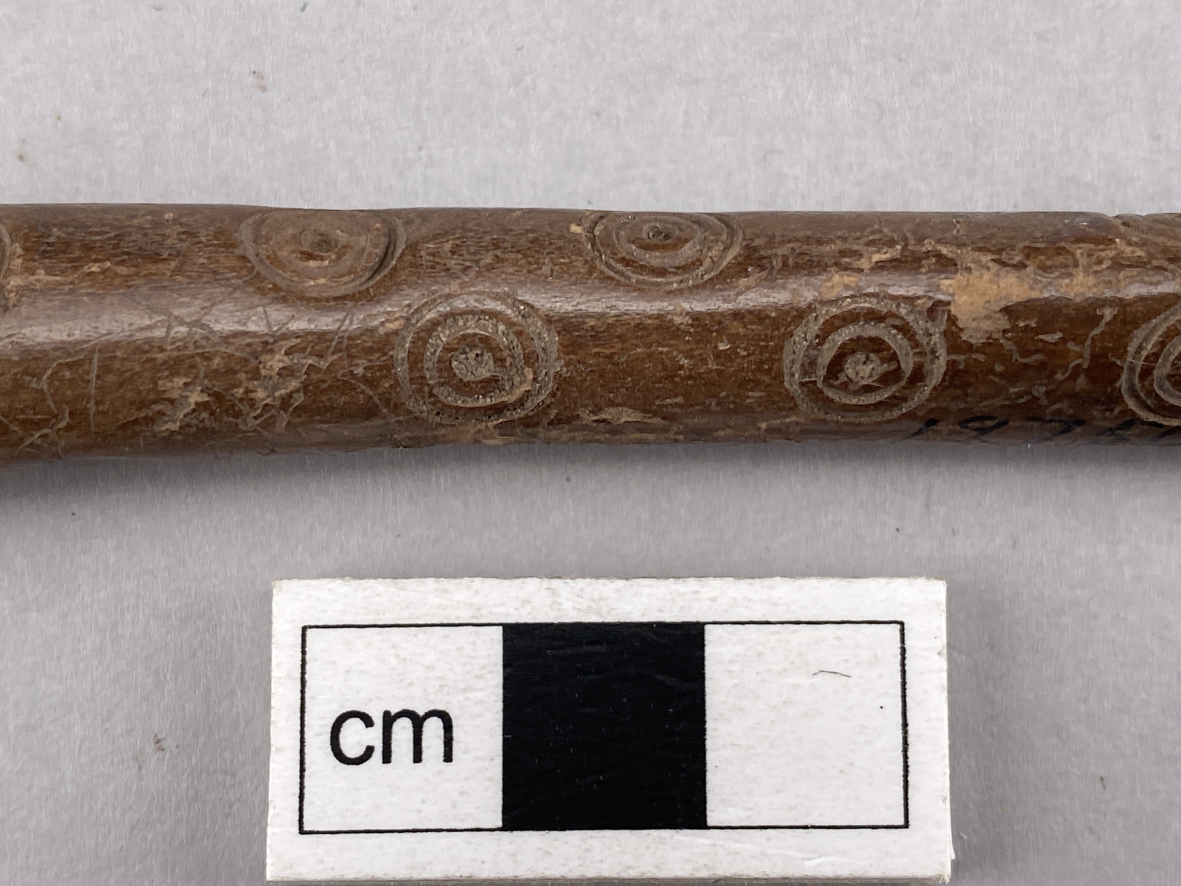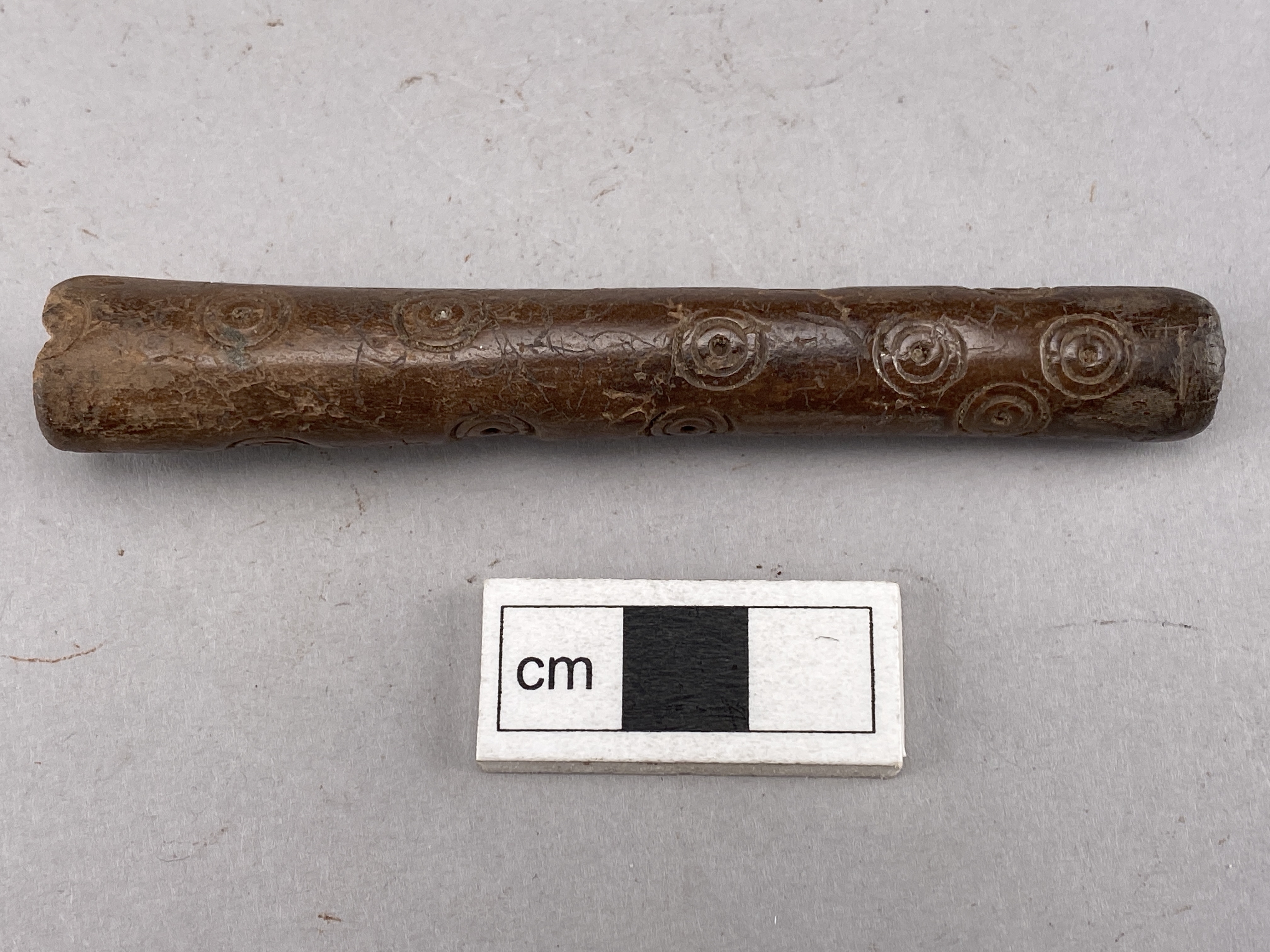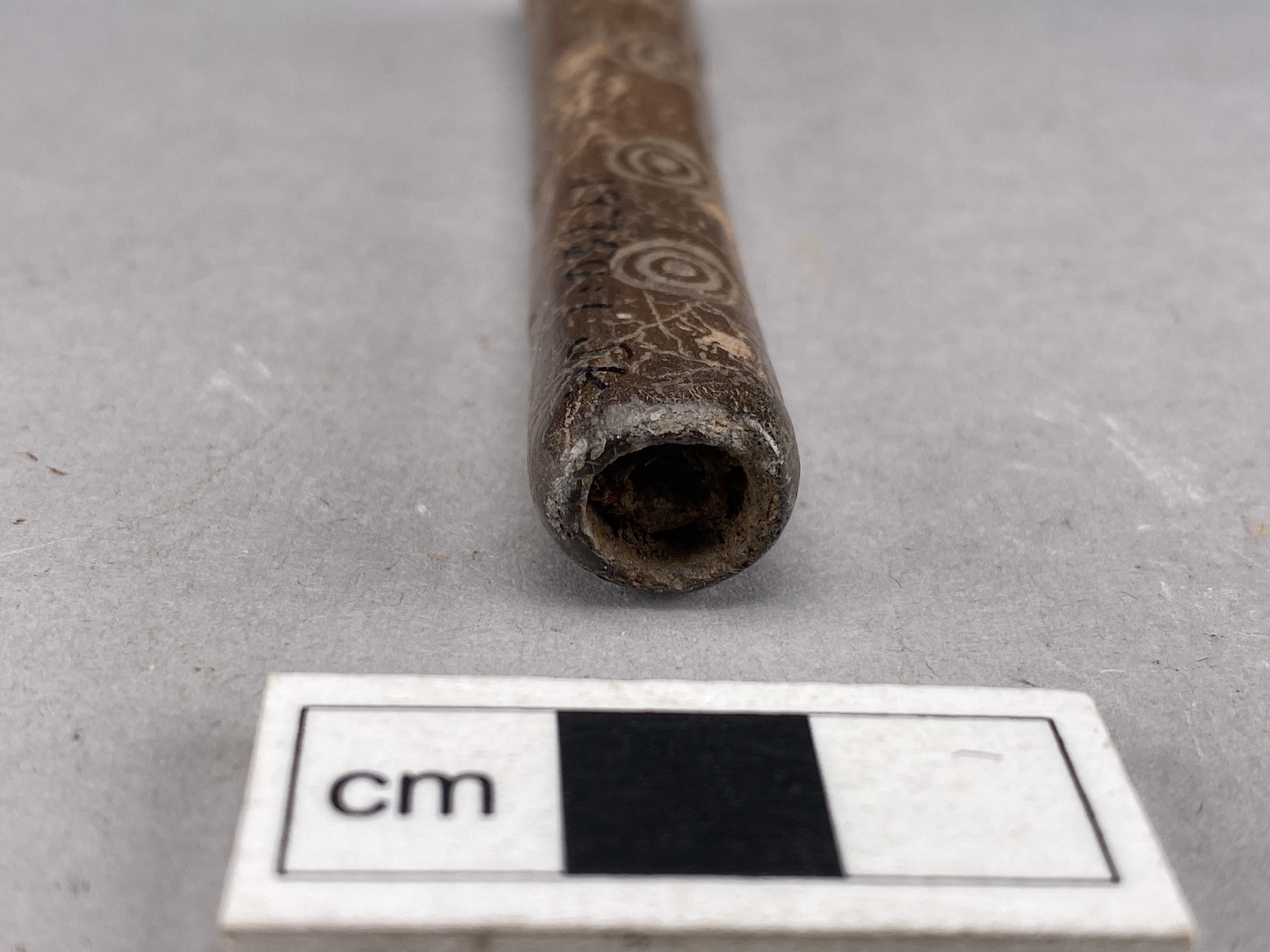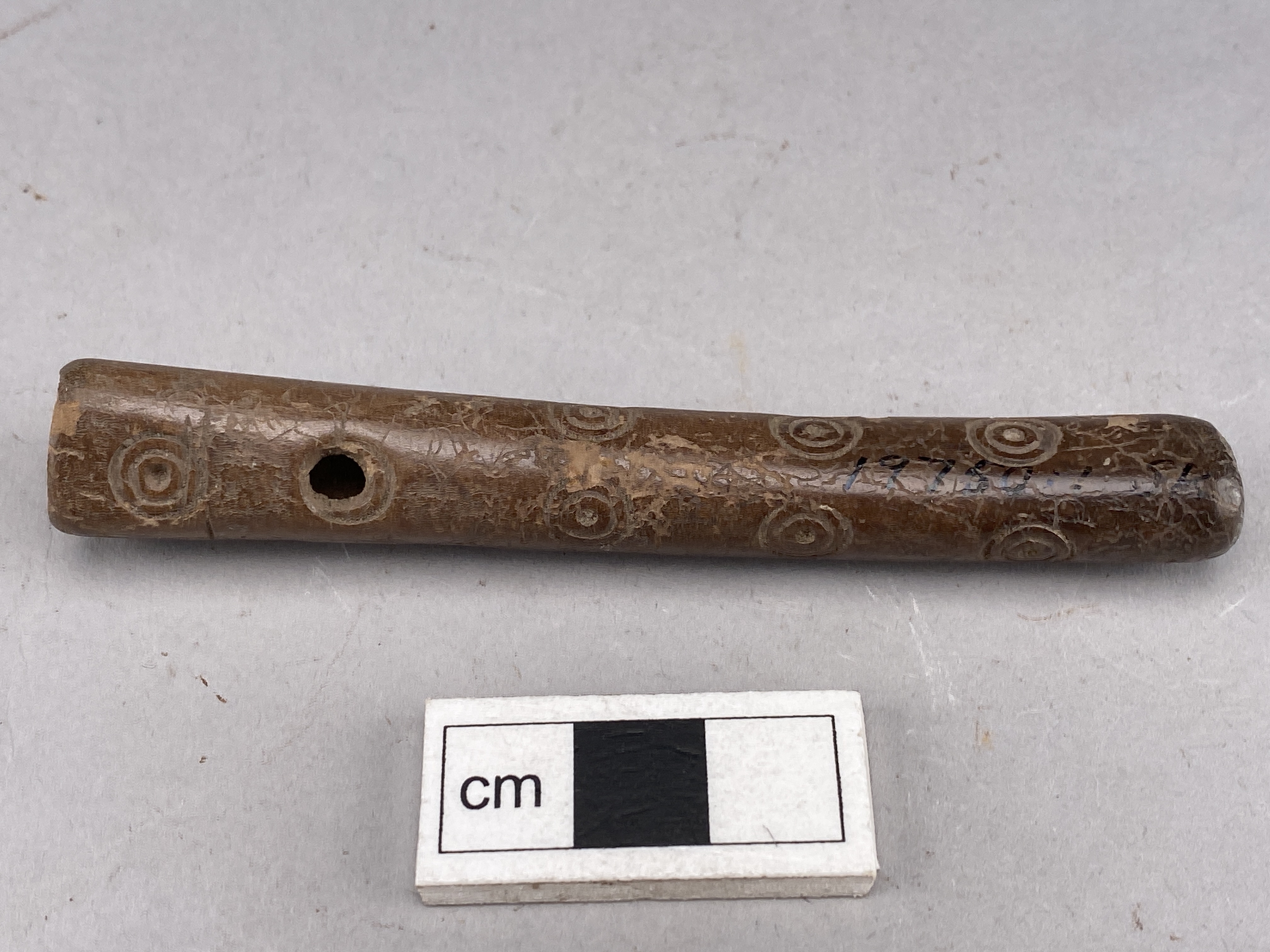 Flöjt av genomborrat ben. Ett hål är borrat i ena änden och den andra är igentäppt med en järntapp. Ornerat med koncentriska cirklar.